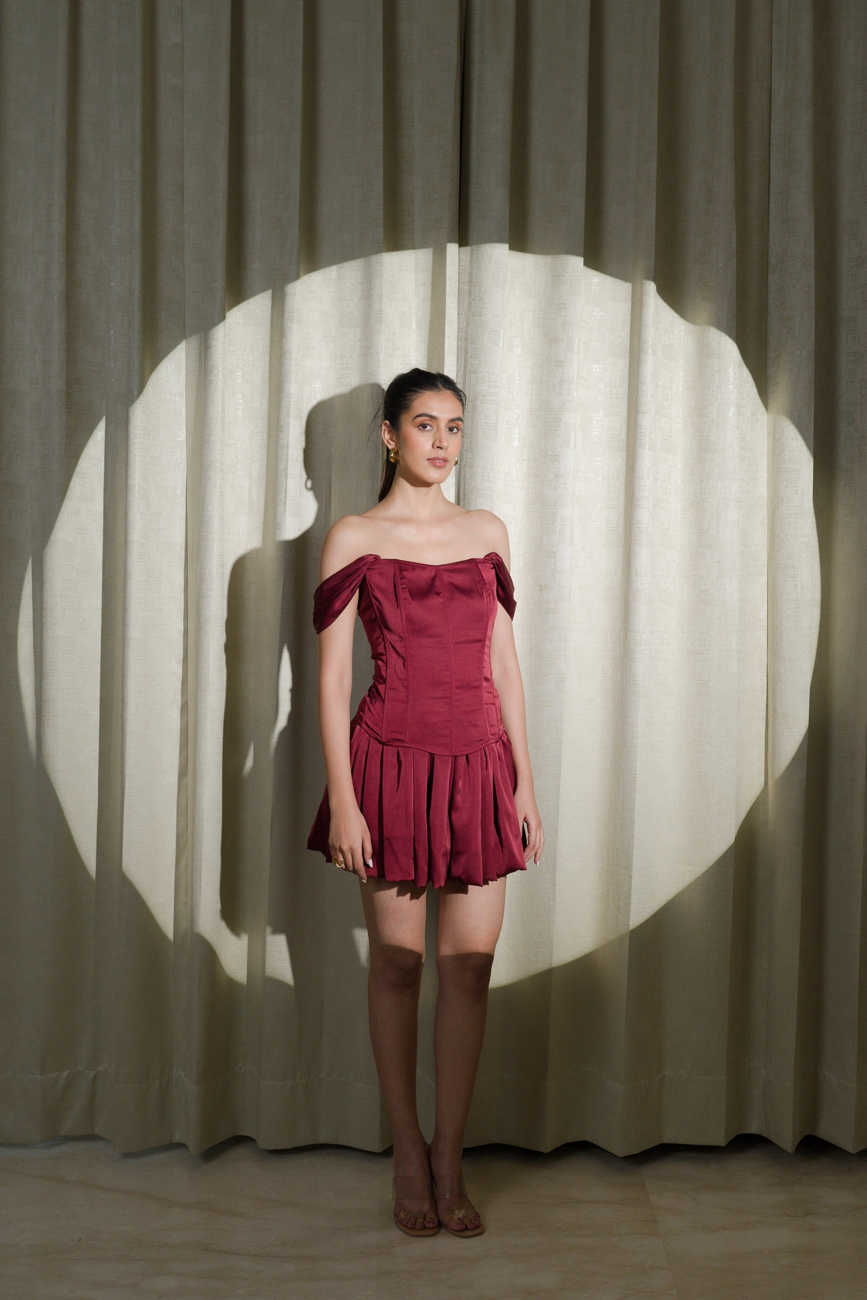 This luxurious coord set, handcrafted with deep maroon satin fabric, radiates elegance and drama. The set features a structured corset top and a playful balloon-style short skirt, perfectly balancing sophistication and boldness. The corset top is designed with boning for a sculpted and figure-enhancing fit, complemented by a self-tie back for adjustability and a touch of romance. It also features short gathered sleeves, adding a soft, feminine detail to the structured silhouette. The accompanying skirt is fully flared with a balloon-style design, creating a voluminous and eye-catching effect. A concealed zipper on one side ensures a seamless and polished finish. This coord set is perfect for glamorous evening events, cocktail parties, or any occasion where you want to make a bold yet elegant statement.