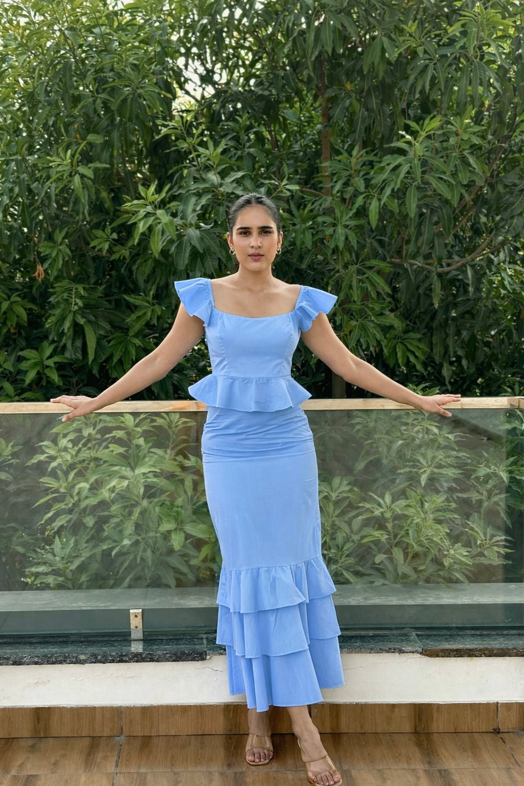 Crafted from a soft, breathable cotton blend, this dress promises comfort and ease for all-day wear. The bright and cheerful lemon yellow hue makes it an ideal pick for summer days and sunny getaways. A clean square neckline frames the collarbone beautifully, lending a flattering and structured touch, while playful ruffle cap sleeves add feminine movement. The fitted bodice, enhanced with vertical seam detailing, creates a contoured, elegant silhouette. A delicate peplum at the waist adds definition and a subtle flare, flowing into a straight-fit skirt that’s elevated with a dramatic three-tiered ruffle hem. Perfectly balancing playful charm and polished style, this look is ideal for brunches, garden parties, summer celebrations, or any chic daytime outing.