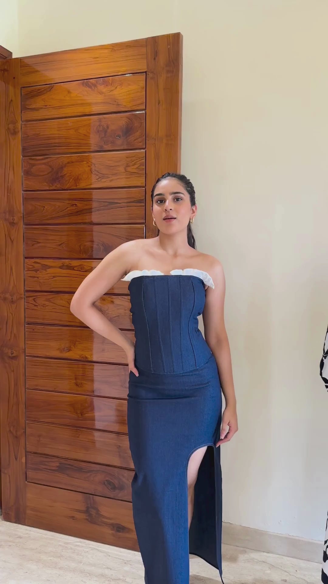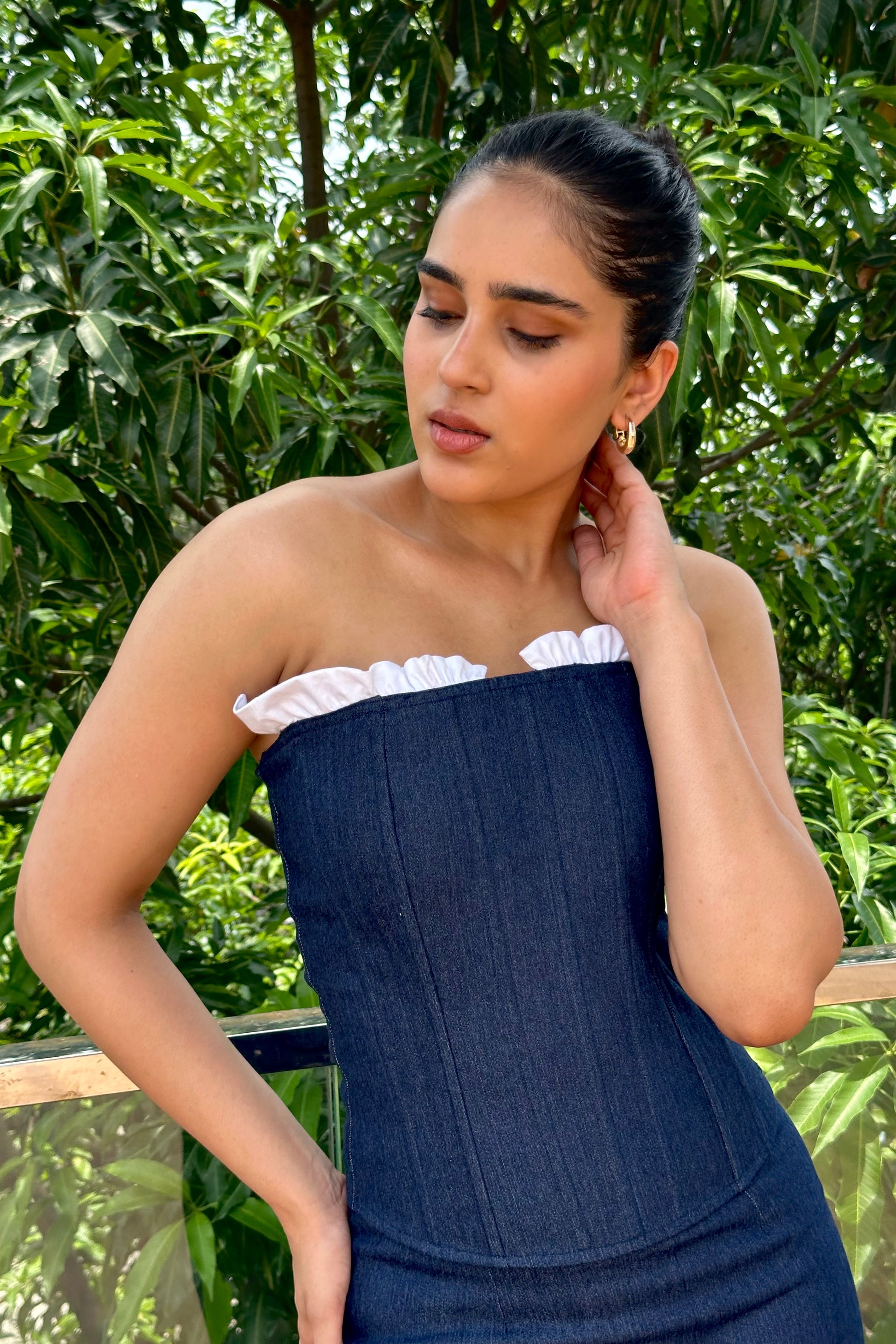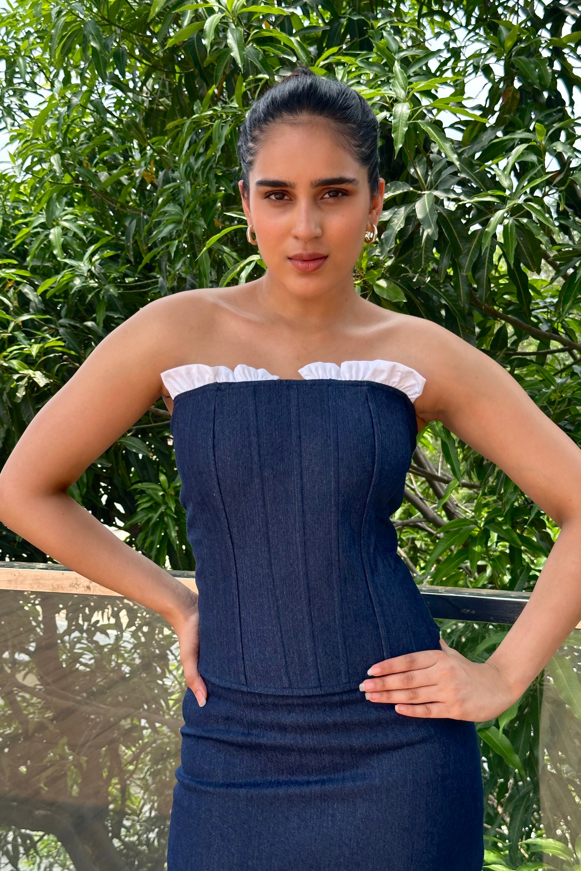 Chic and contemporary, this denim co-ord set brings a playful edge to feminine style. Crafted from denim fabric with contrast white cotton gathered detailing along the neckline, the set includes a structured corset top and a matching fitted skirt. The subtle sweetheart neckline is elevated with delicate gathers, while the corset-style bodice, complete with boning, offers a sculpted, flattering silhouette. Both the top and skirt feature concealed side zippers for a smooth, seamless finish. The skirt’s slim fit and stylish slit detail add a modern flair, making this look ideal for date nights, brunches, vacations, birthdays, and special occasions. Bold yet feminine, it’s designed to make a lasting impression.