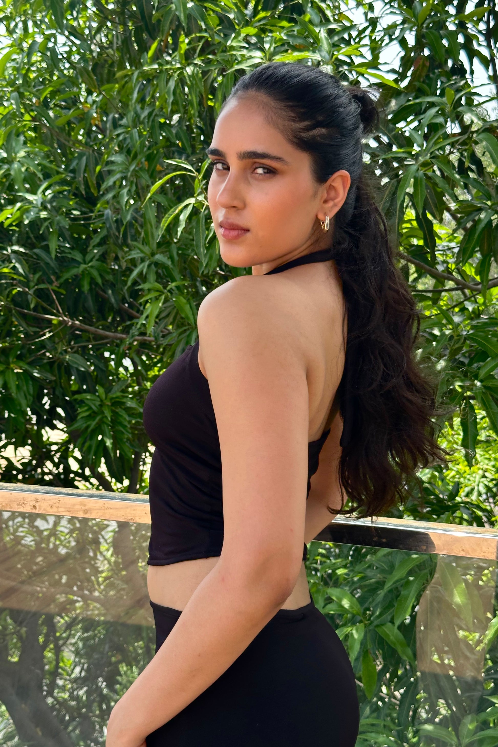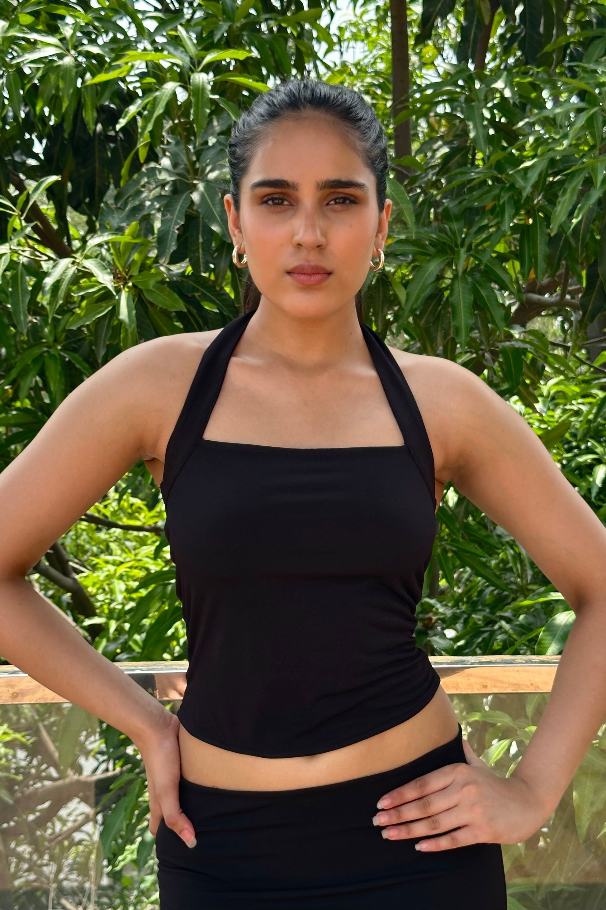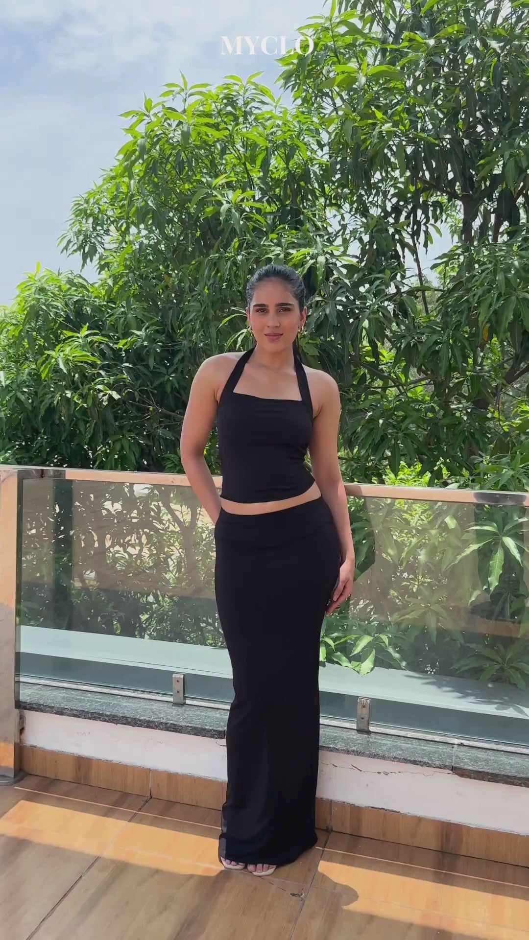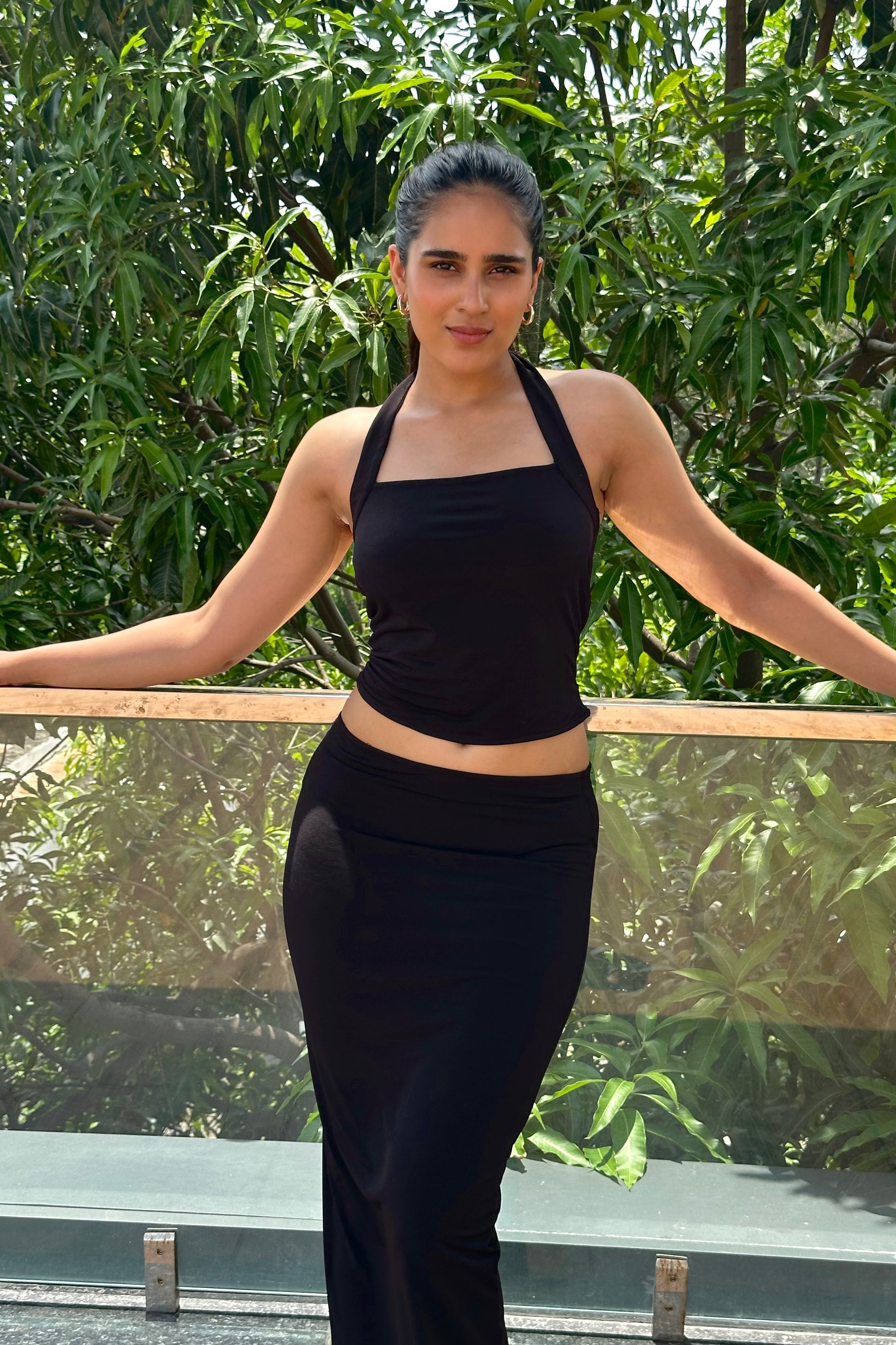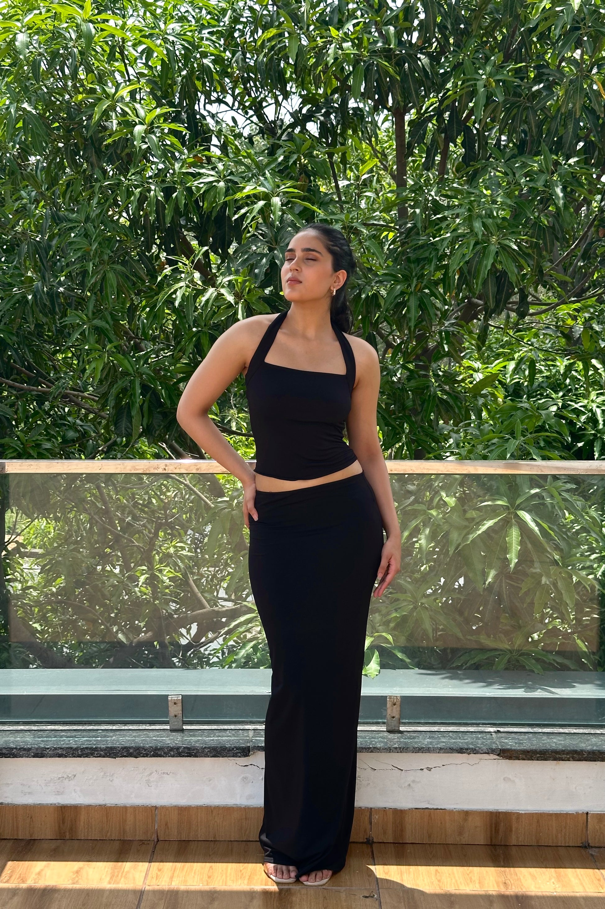 Turn heads in this striking black co-ord set made from smooth, stretchable Lycra. Featuring a halter-neck crop top with a clean square neckline and a matching high-waisted maxi skirt, this outfit offers a sleek, body-contouring fit. Effortlessly chic and comfortable, it’s perfect for nights out or statement daywear.