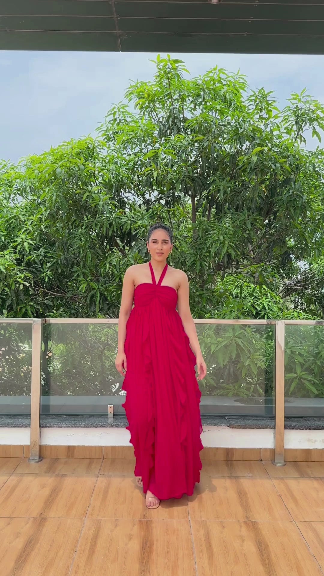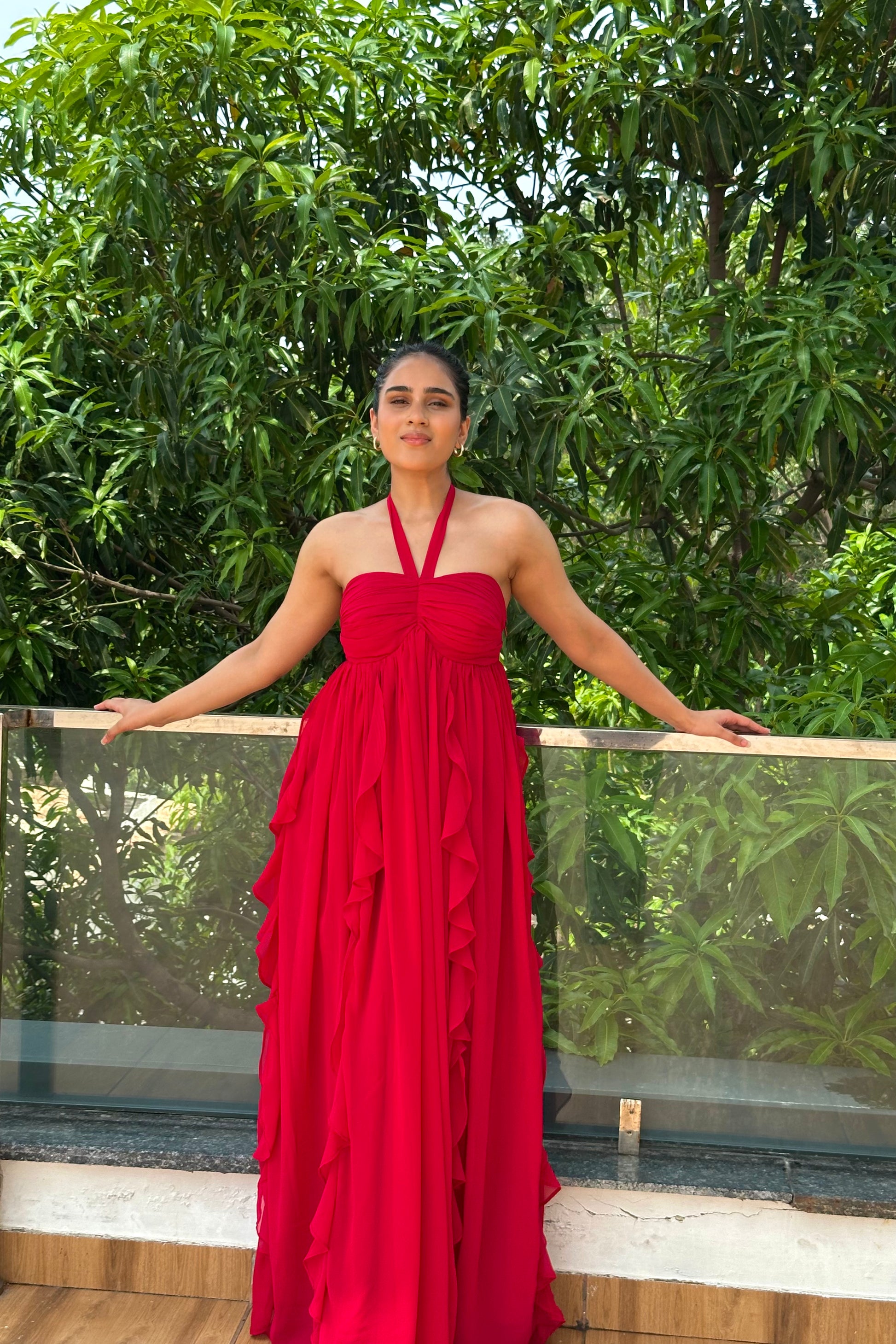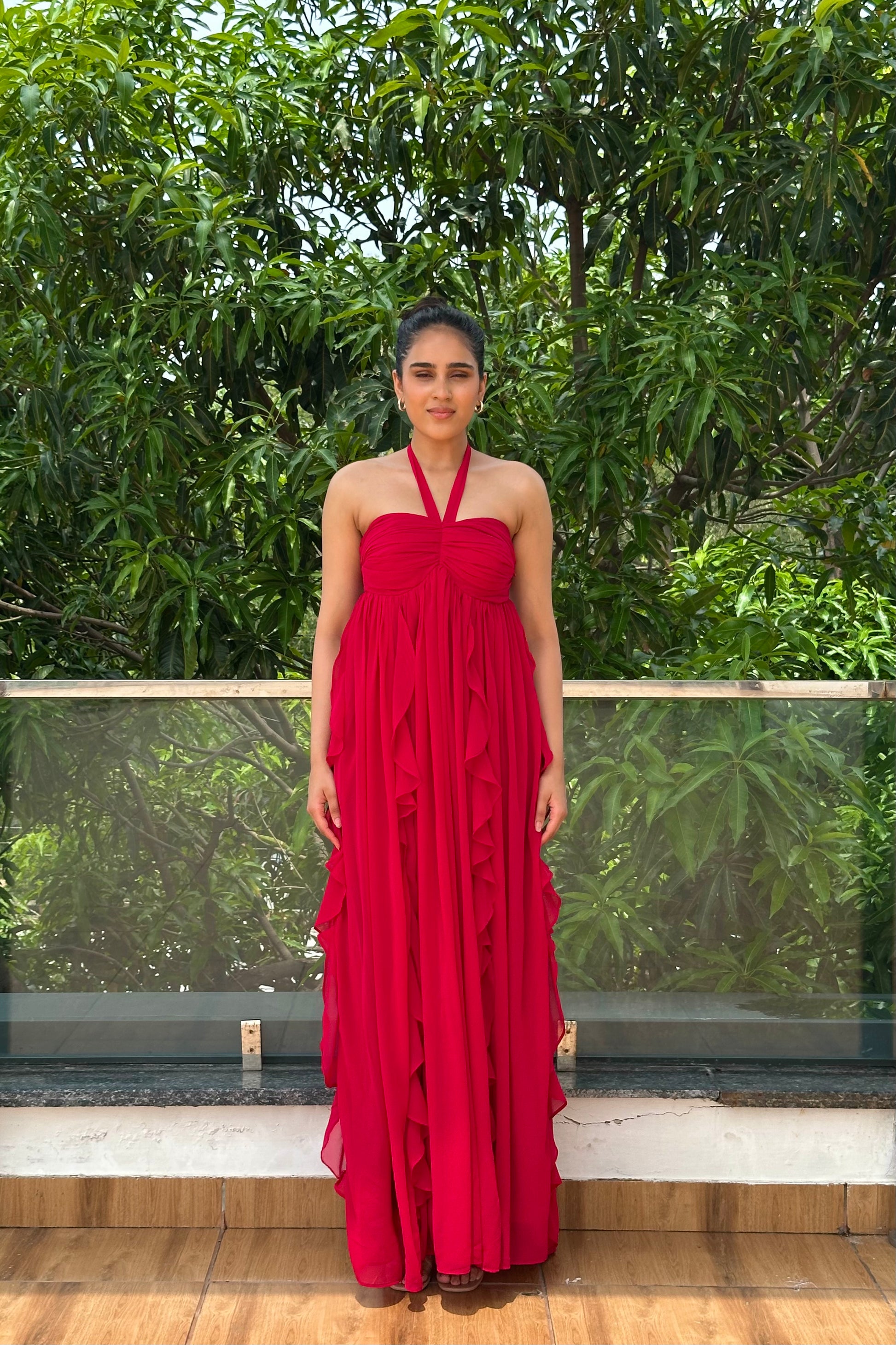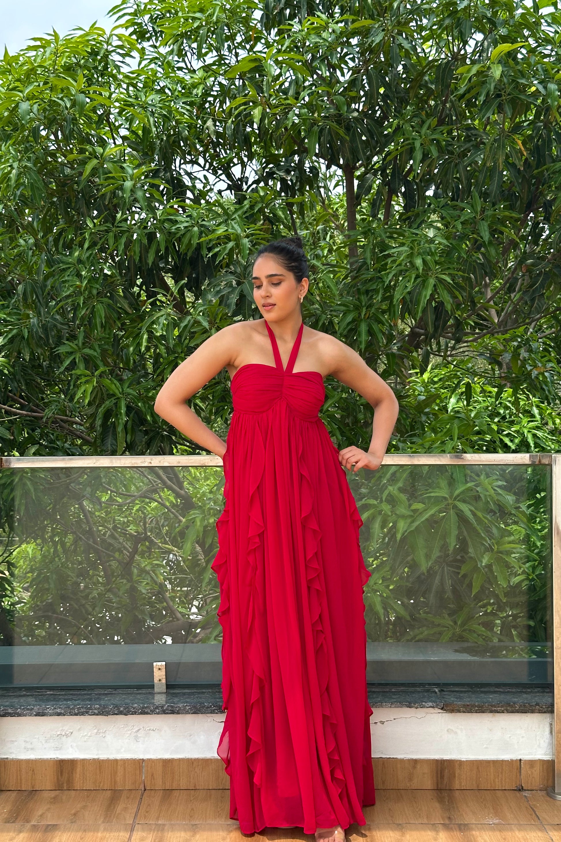 Crafted from lightweight, flowy Turkey Red georgette, this stunning dress offers an elegant drape and breezy comfort that lasts all day. The rich, bold Turkey Red hue makes a vibrant, eye-catching statement — perfect for standout summer moments. Featuring a ruched sweetheart neckline with a front neck tie, the dress flatters the shoulders and neckline with graceful allure. The fitted bodice is enhanced with delicate gathered detailing and subtle side cutouts, adding a modern, feminine edge. A slightly cinched waist highlights the silhouette while ensuring ease of movement, flowing into a full-length, ruffle-tiered skirt that dances with every step. Finished with a concealed zipper for a clean, seamless fit, this look channels goddess-like romance and elegance — ideal for beach weddings, sunset dinners, summer vacations, or garden soirées. Style it with strappy sandals, statement earrings, and a woven or pearl-embellished clutch for the perfect resort-ready ensemble.