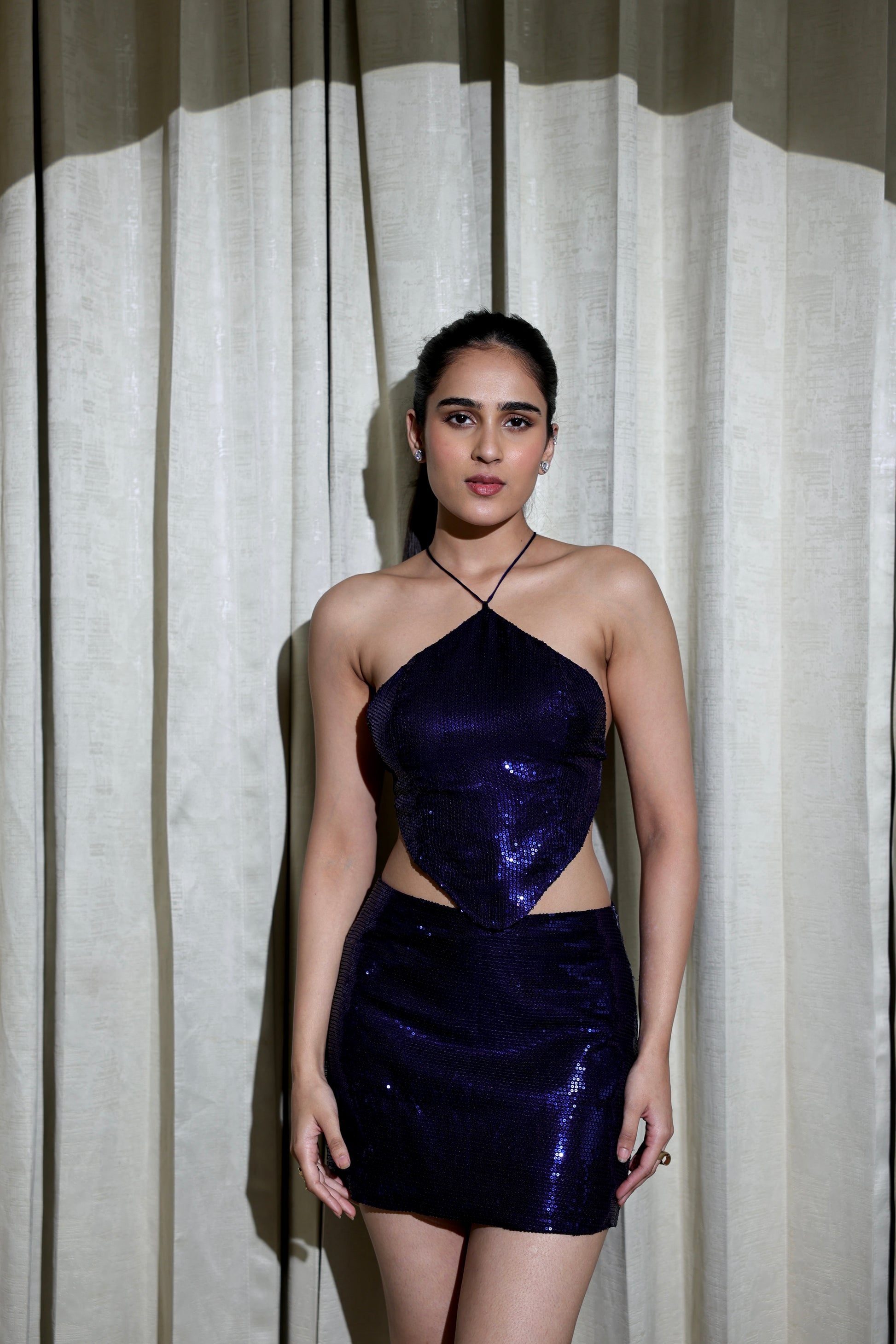 Paired with a matching mini skirt made entirely from the same shimmering blue sequin fabric, the set offers a perfect balance of glamour and confidence. Whether it’s a night-out, party, club event, or celebration, this ensemble ensures you're the center of attention.