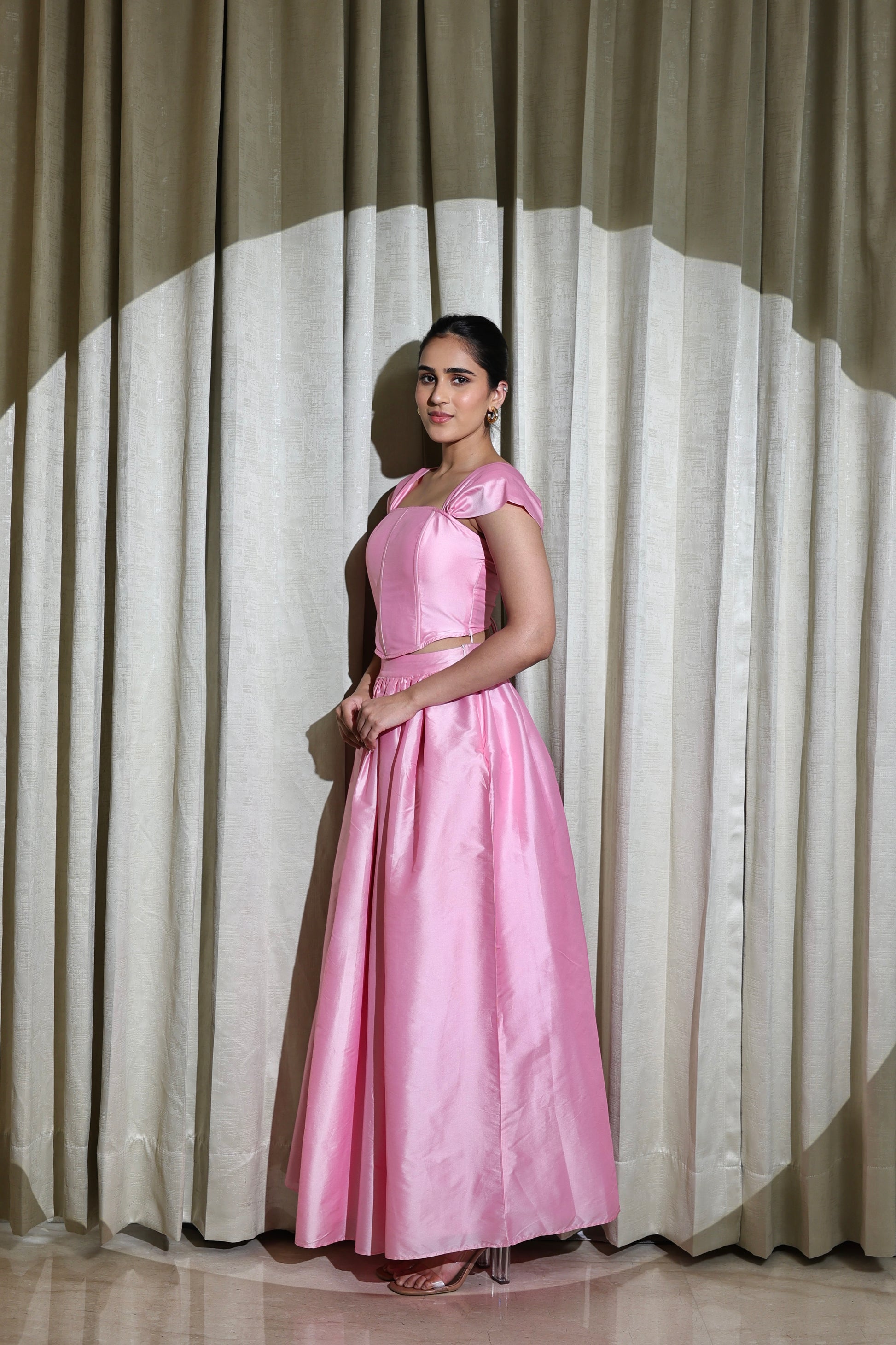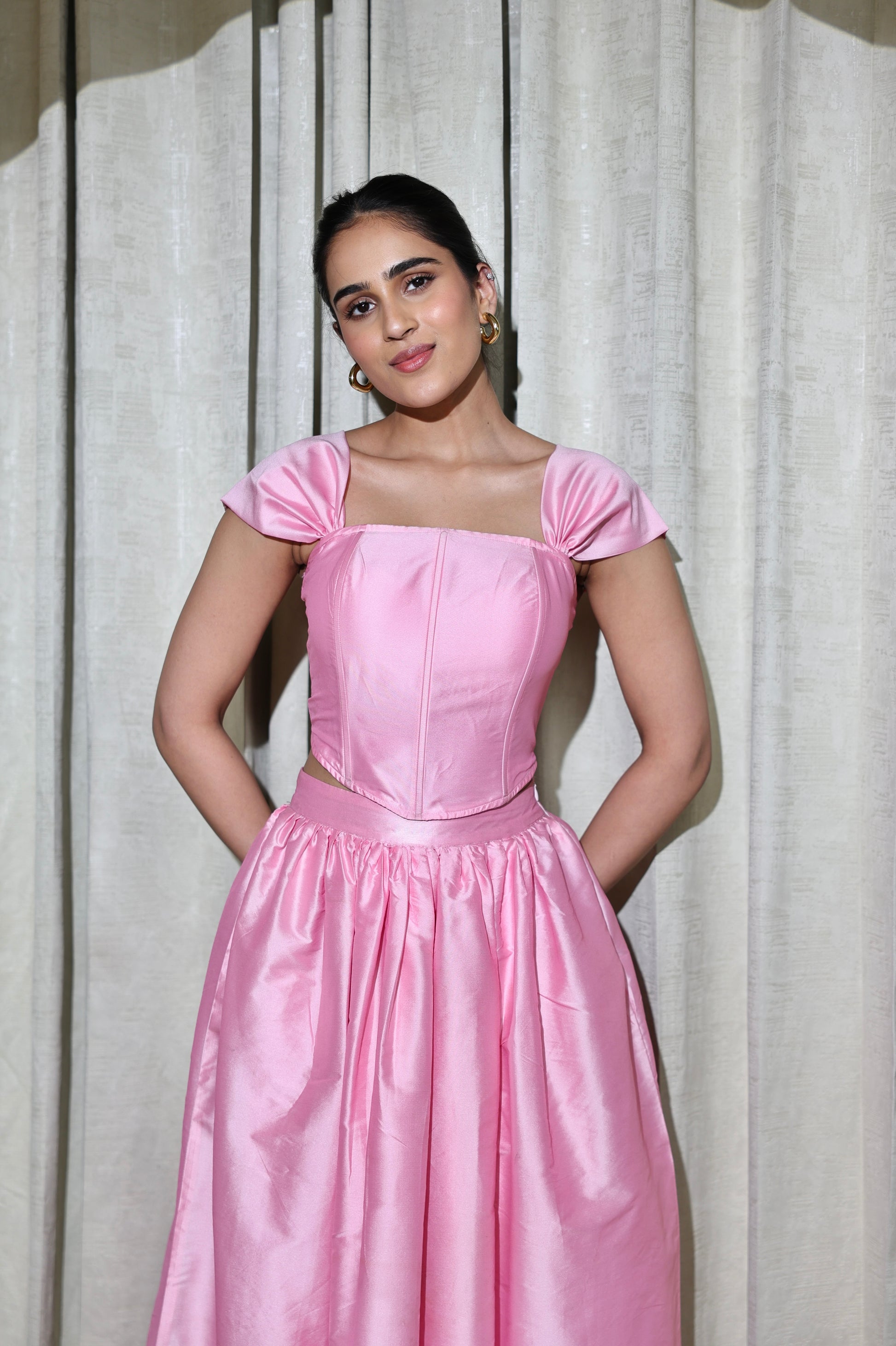 This enchanting pink tafetta set is designed to bring a dreamy, feminine charm to your special occasions. The structured corset top beautifully sculpts the torso, featuring delicate gathered sleeves and a flattering square neckline that enhances the silhouette. Crafted in luxurious pink tafetta fabric, the set offers a soft sheen and a regal appeal.