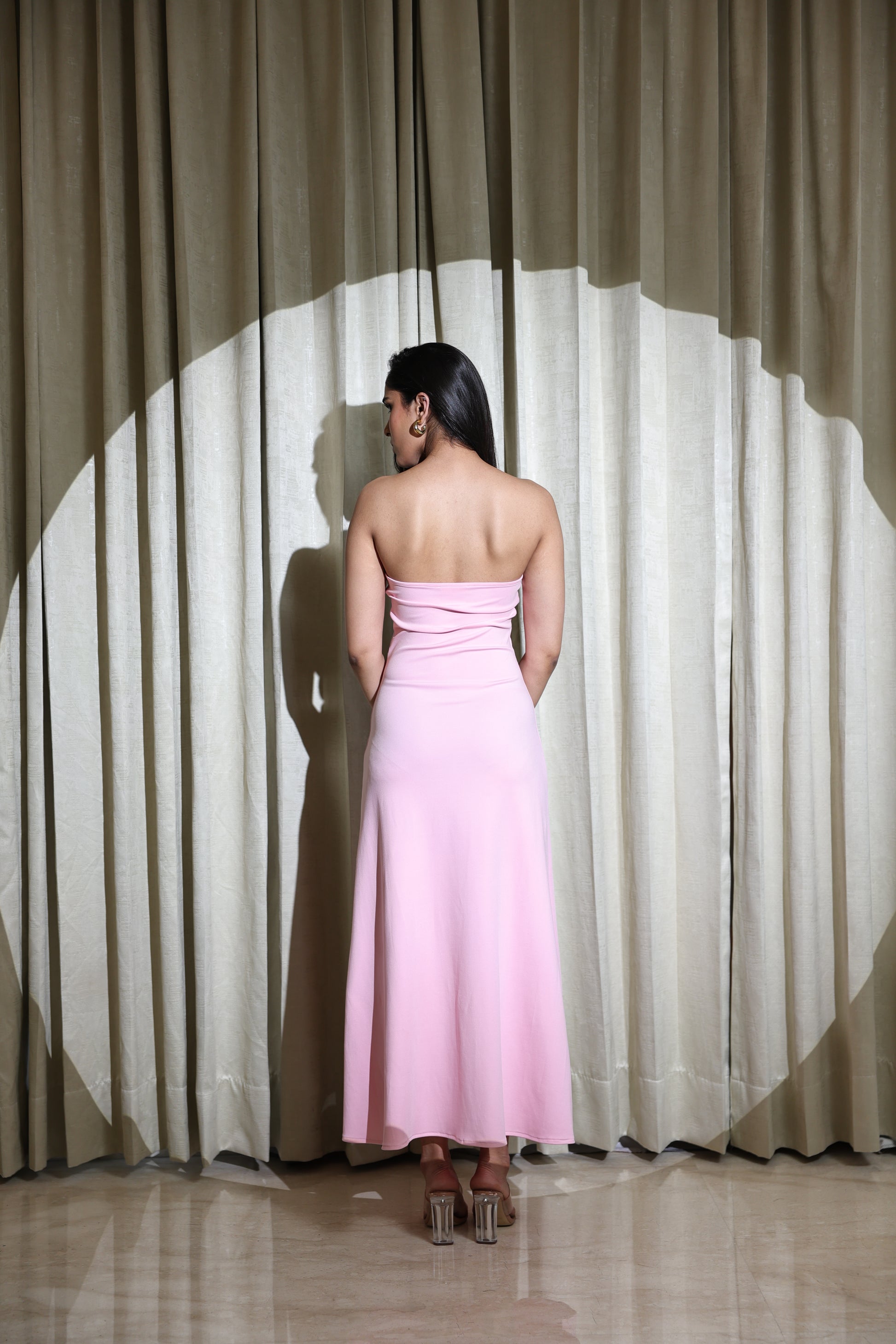 This soft pink lycra gown blends elegance with versatility, offering two stunning looks in one. The main dress features a clean strapless neckline and a smooth, body-skimming silhouette that gently flares toward the hem, creating an effortlessly feminine shape. Crafted from stretch lycra, it molds comfortably to the body while maintaining a sleek, polished finish.