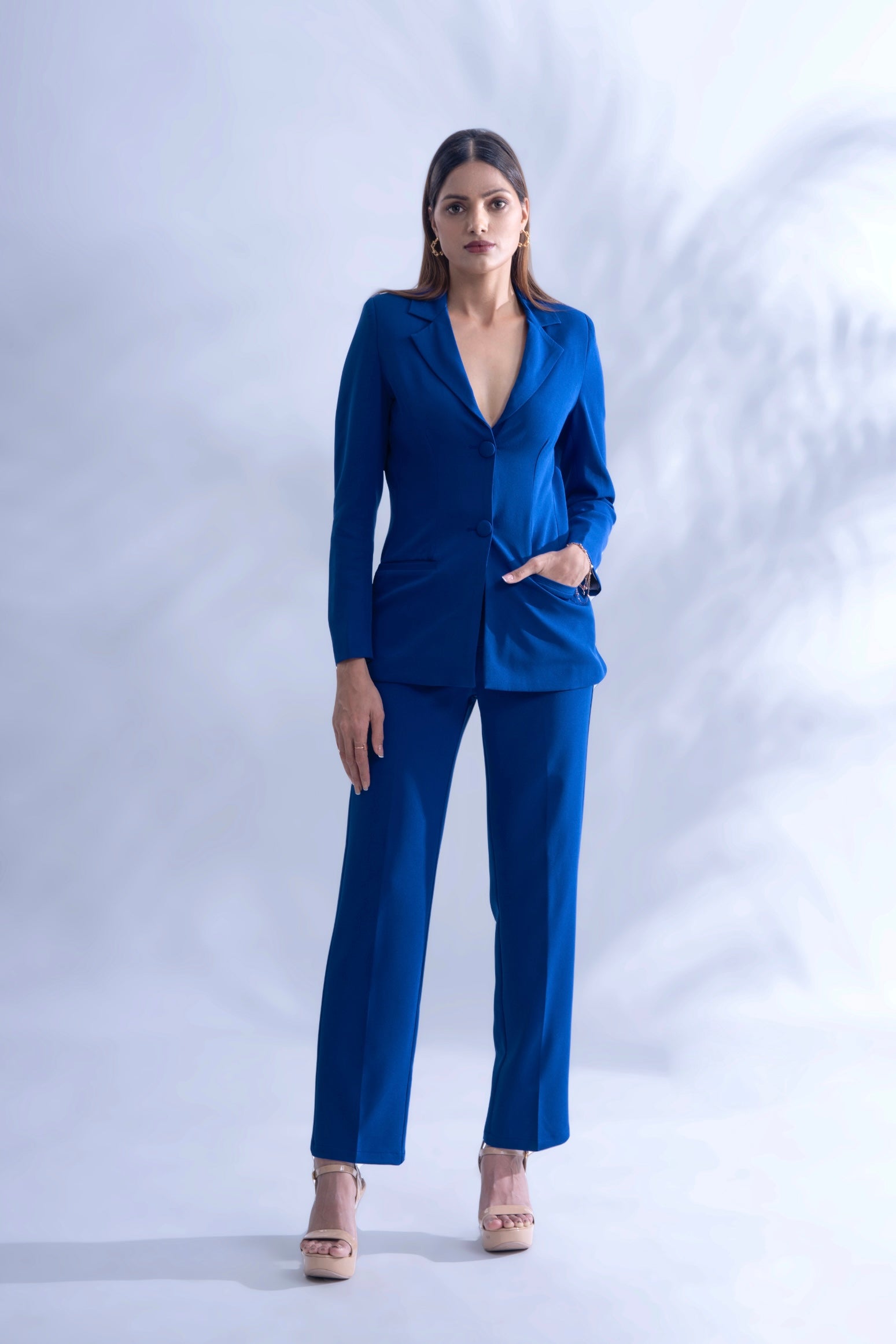 This striking royal blue pantsuit is crafted from premium heavy crepe and fully lined with luxurious satin for a refined, tailored look. The blazer features sharp notch lapels, same-fabric buttons, and flap welt front pockets for a classic finish. Paired with straight cut-out flared pants designed with a high-rise waist, side pockets, belt loops, and a matching premium zipper, this ensemble exudes confidence, elegance, and modern sophistication.