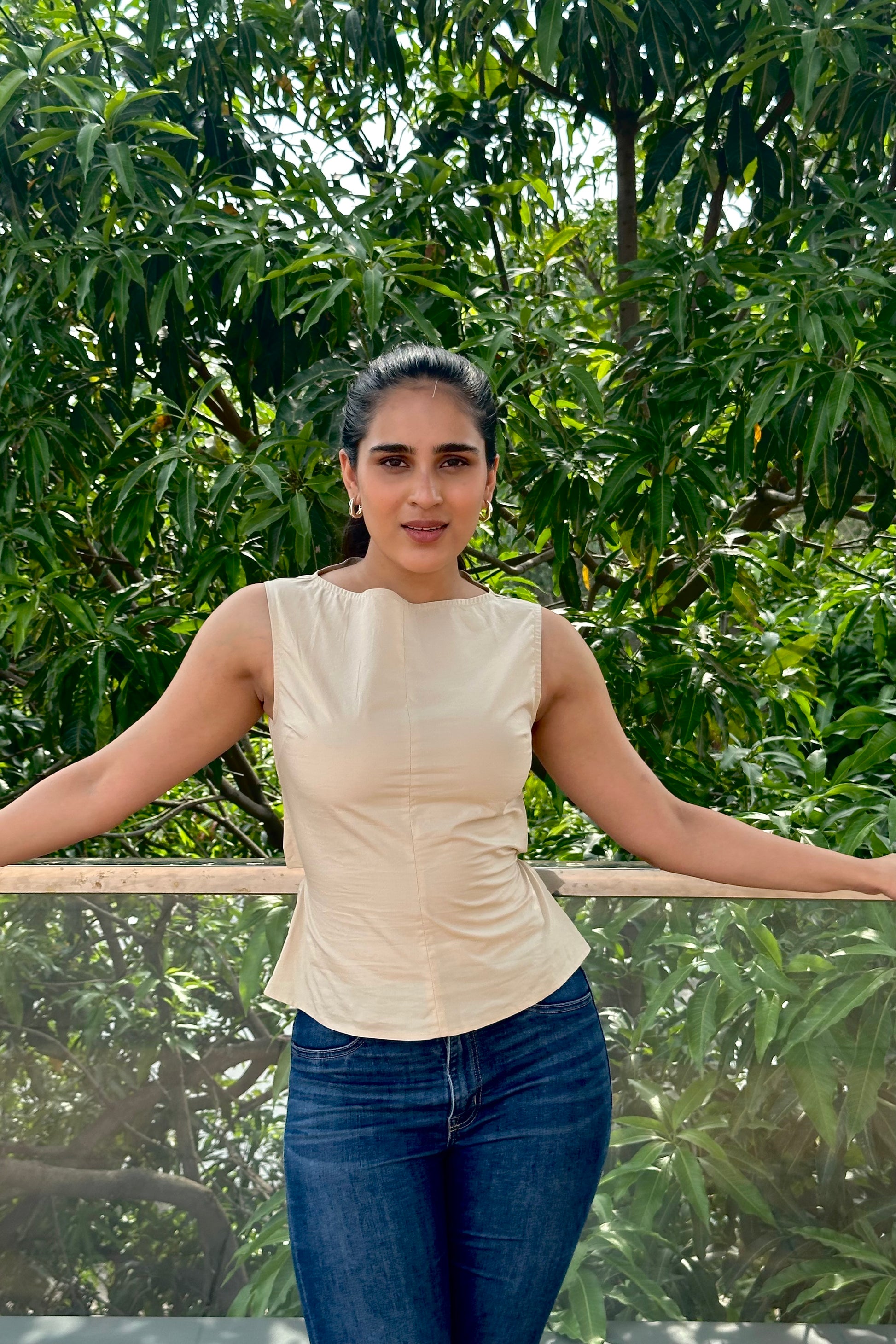This two-piece coord set features a structured, contemporary design crafted in natural cotton fabrics. The top is made from off-white 100% cotton and showcases a round neckline with a sleeveless cut. It is thoughtfully constructed with visible darts for shape and contour, complemented by a self-tie back that adds both functionality and style. The waist finishes with a slightly flared, peplum-like hem, creating a tailored silhouette. The bottom is a brown cotton mini skirt designed with a straight, fitted style. It includes functional side patch pockets with flap or pleat detailing for added utility and character, and it fastens with a front zipper closure. Together, the set offers a clean, modern look with practical touches.