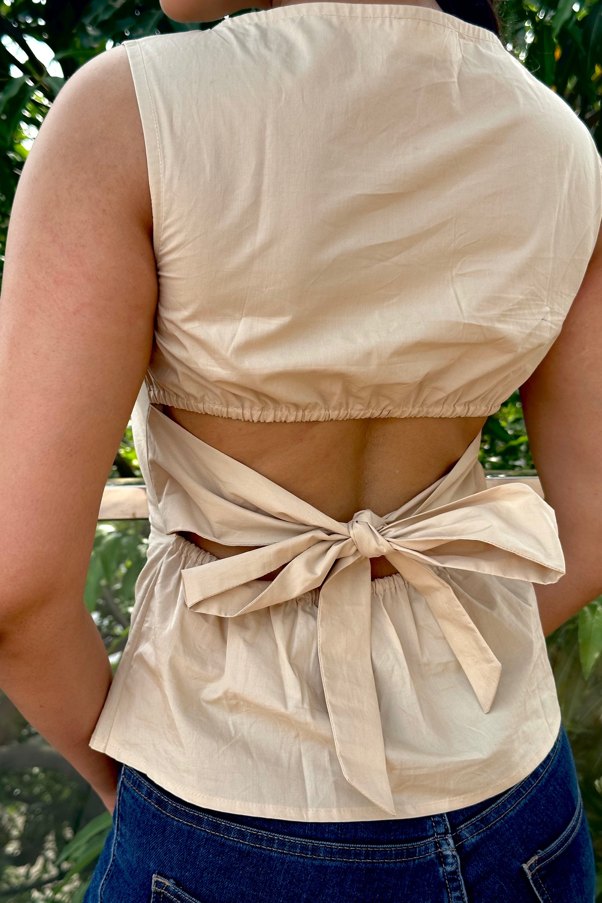 • Fit: Structured and fitted with visible darts for shape and contour, featuring a self-tie back