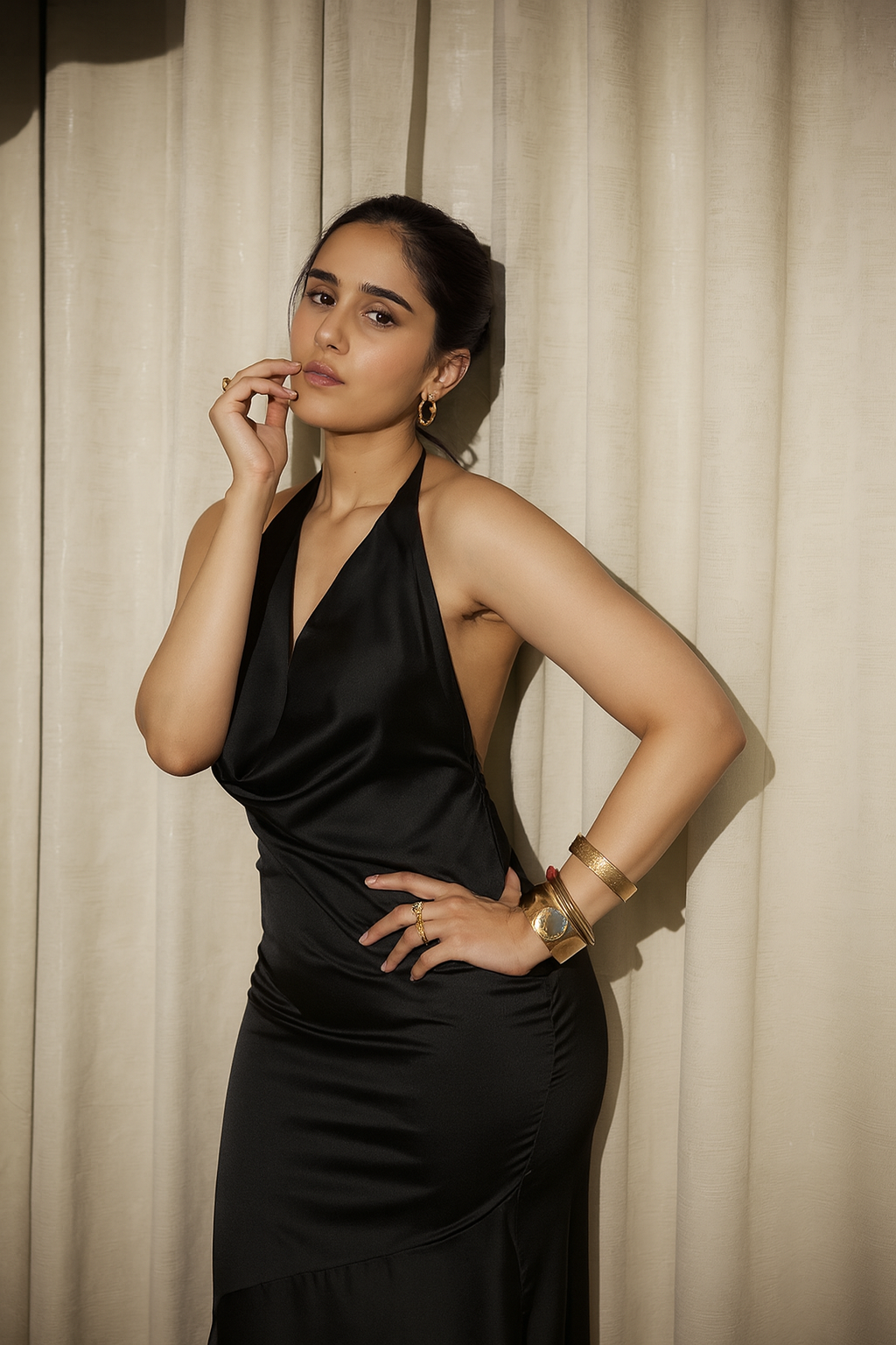 This stunning black satin gown is the definition of modern glamour. Made from luxurious, high-shine satin fabric, the dress drapes beautifully over the body, creating a fluid, sculpted silhouette. The halter neckline features a soft cowl drape with a subtle front V-cut, adding elegance while enhancing the natural contours of the neckline.