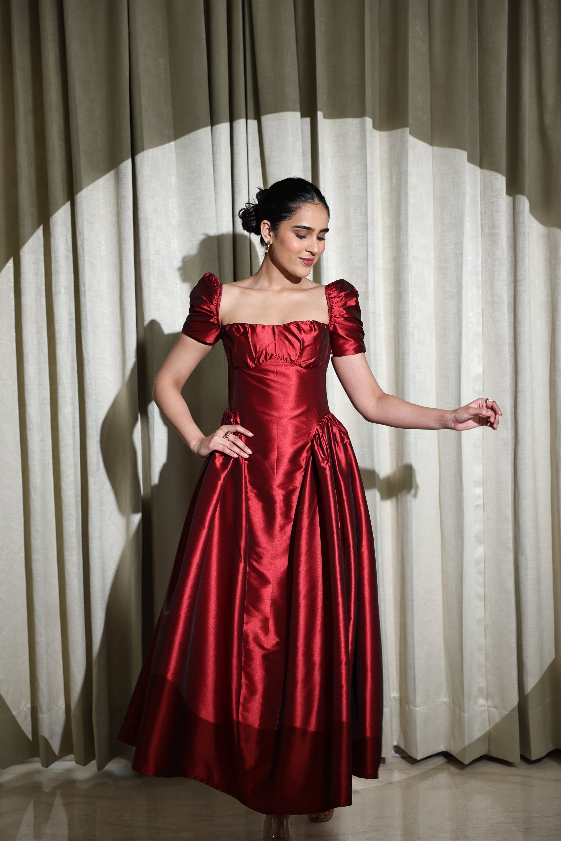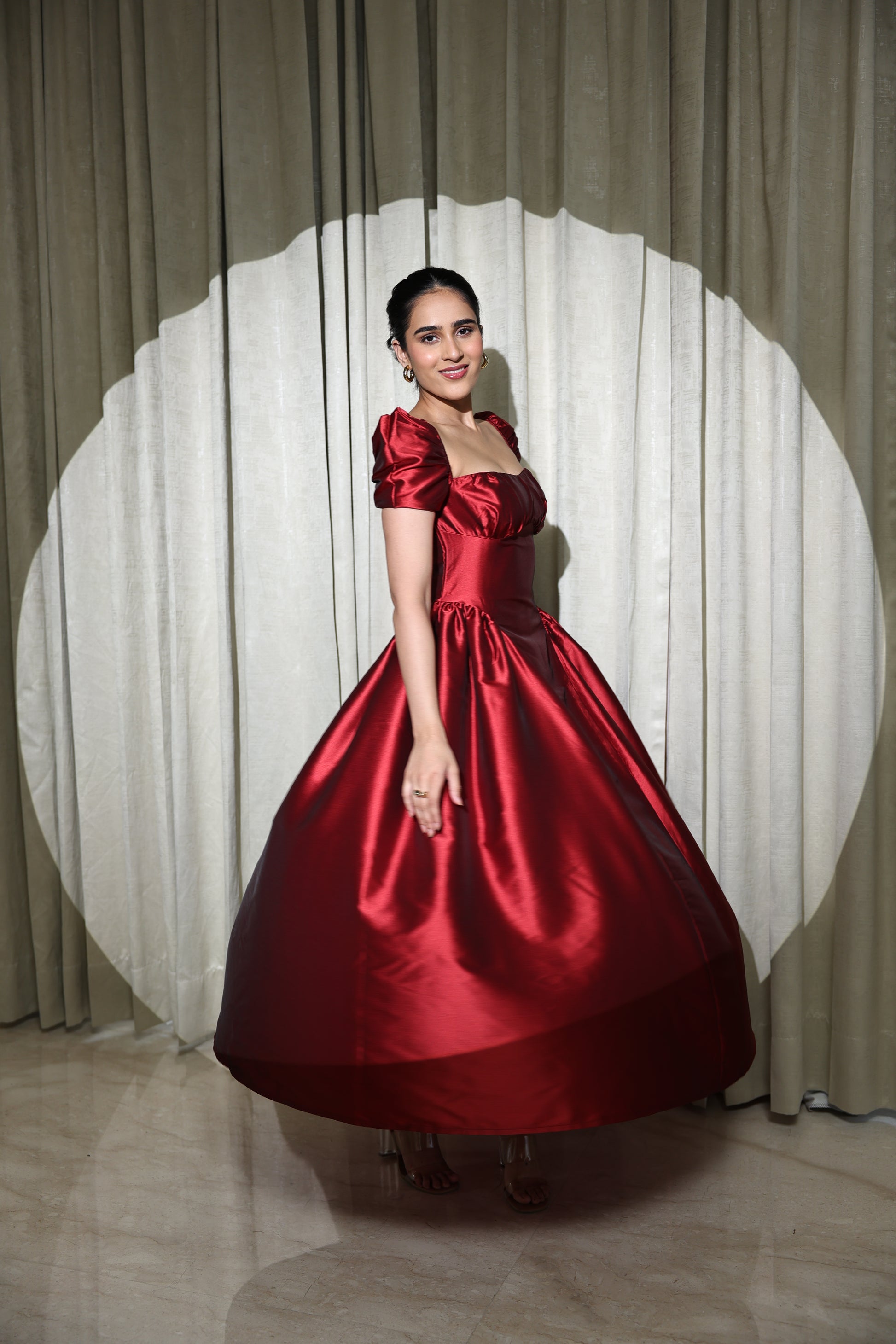 Crafted from luxurious maroon taffeta, this gown brings a perfect blend of romantic charm and statement elegance. The rich sheen of the fabric catches the light beautifully, giving the dress a regal and polished finish ideal for special occasions.