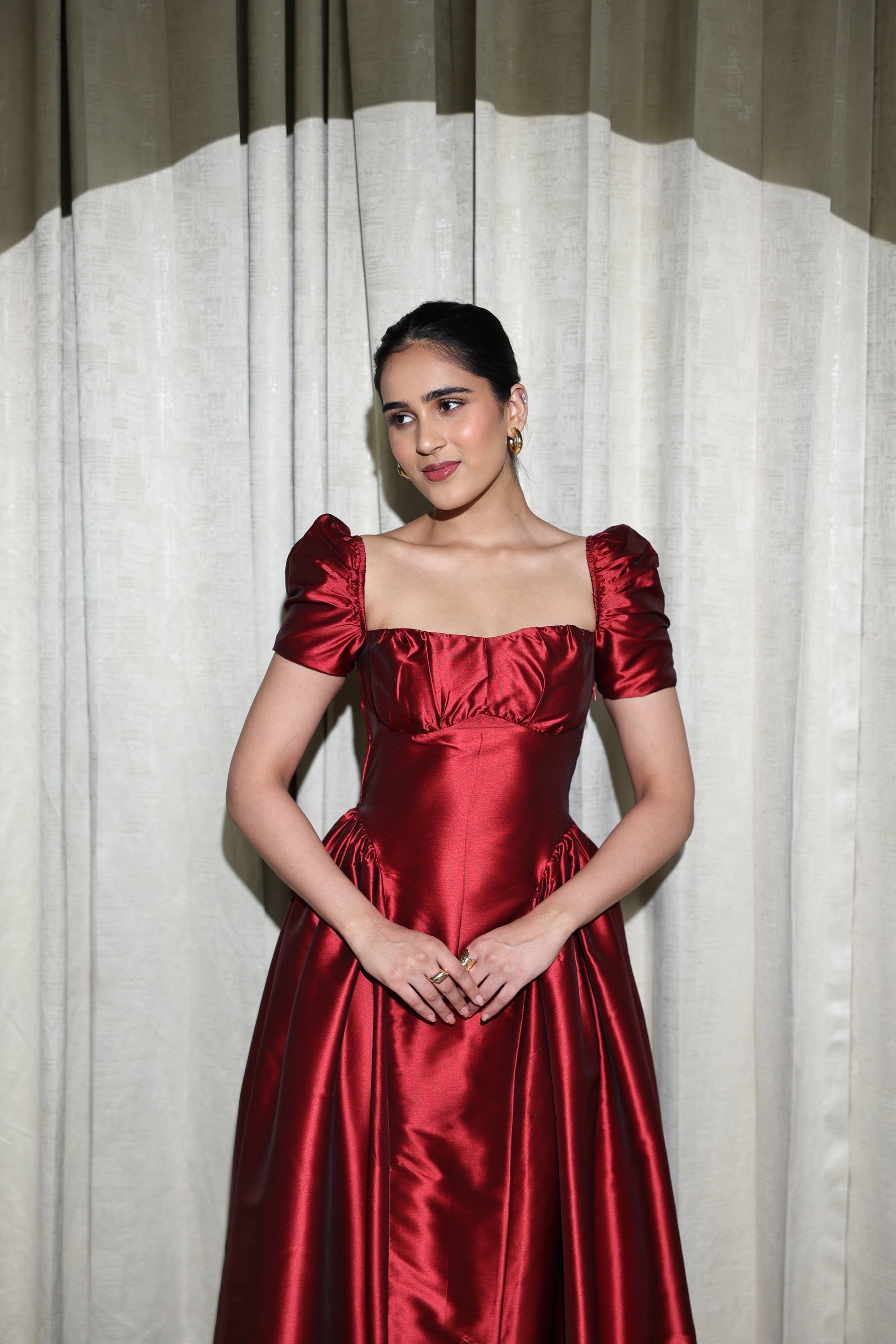 • Fabric: Premium maroon taffeta with a rich sheen