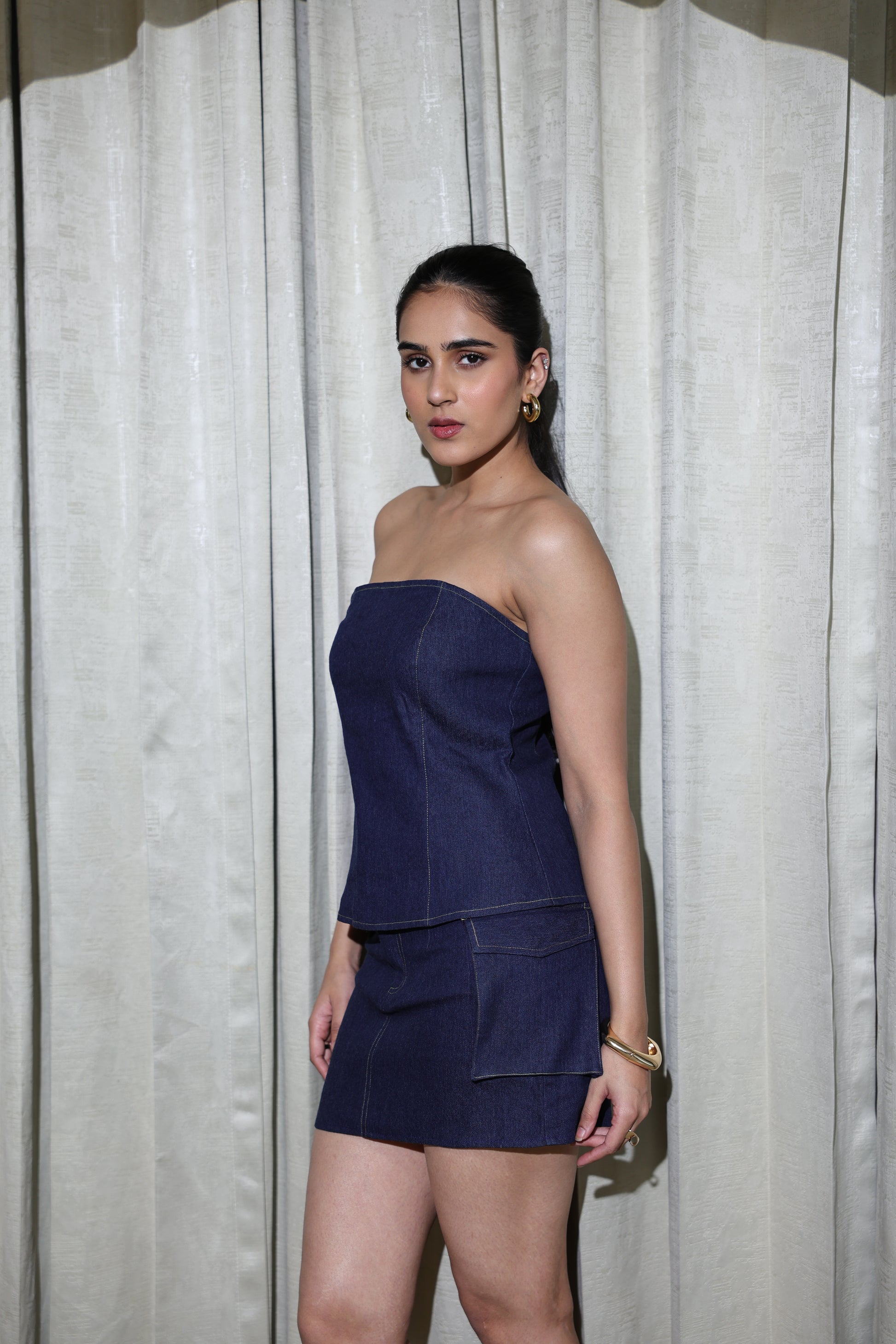 Crafted in premium denim fabric, this co-ord set brings a structured, modern, and effortlessly stylish vibe. The strapless top features clean panel detailing and a sculpted silhouette that flatters the waist, finished with a smooth back zipper for ease and comfort.
