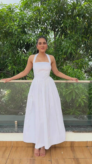 A timeless white halter-neck dress crafted in luxe cotton with a subtle sheen. Featuring a structured square neckline, open back with self-tie detail, and a voluminous ankle-length skirt, it’s both flattering and breathable. Finished with side pockets, it’s the perfect blend of elegance and ease for sunny days.