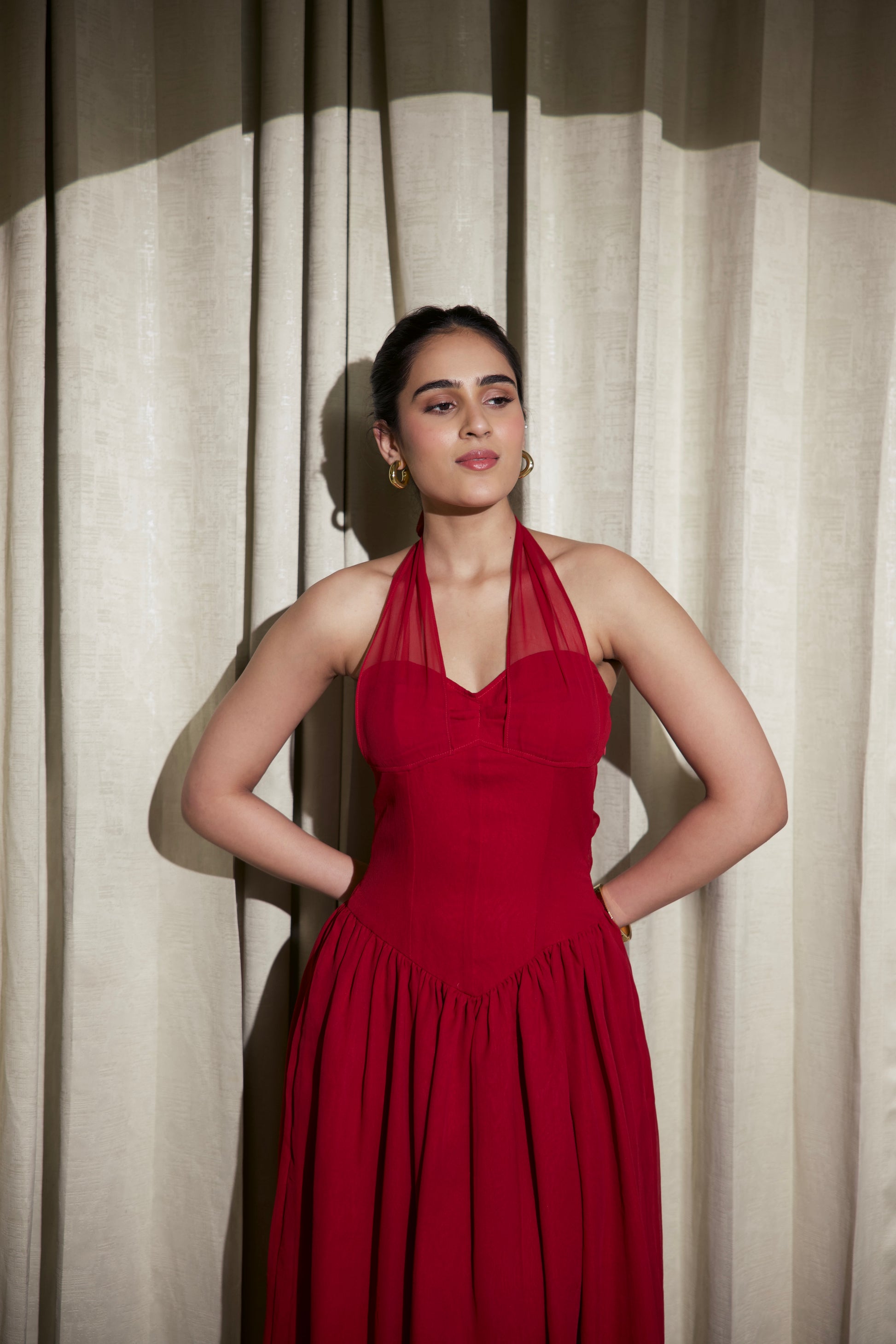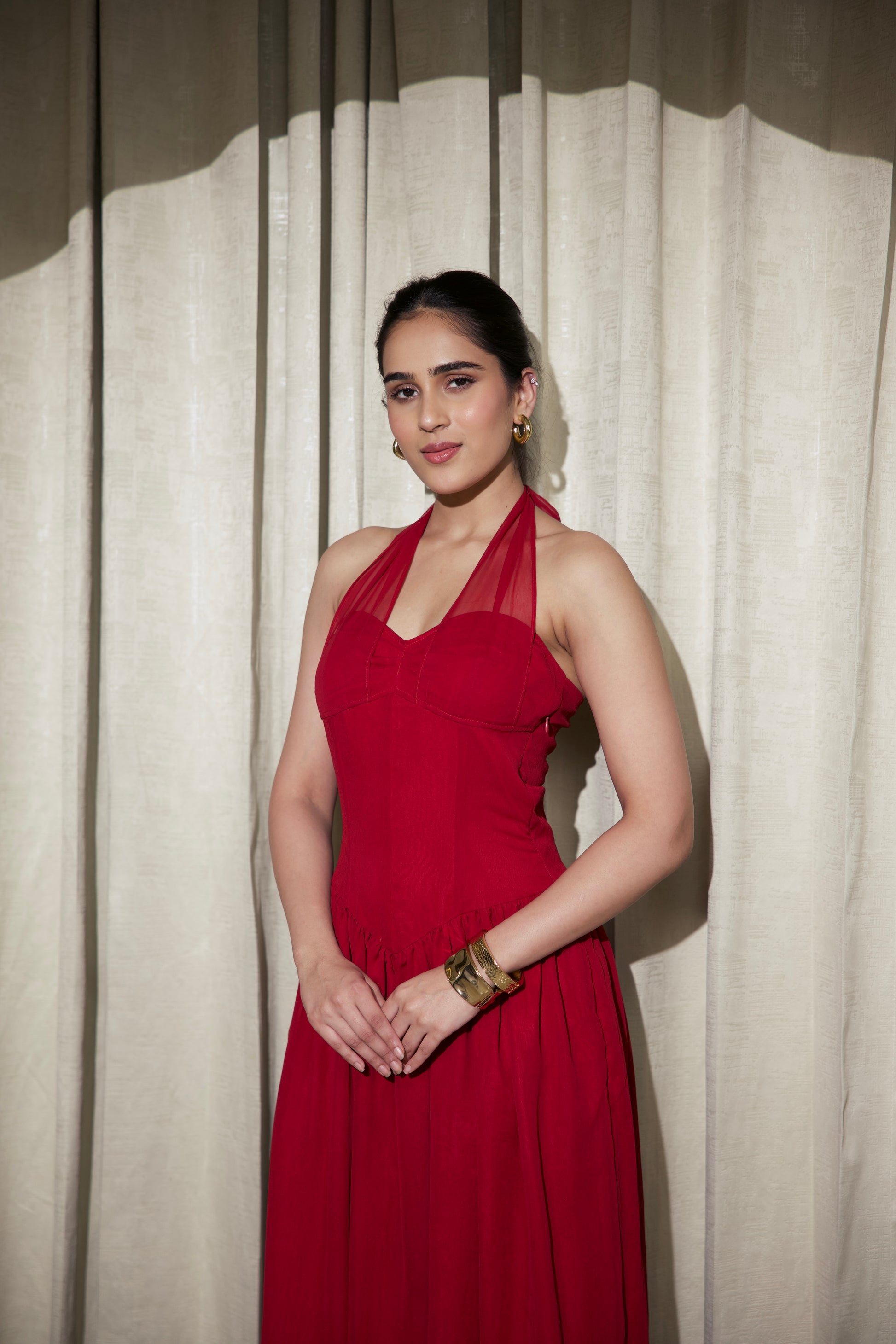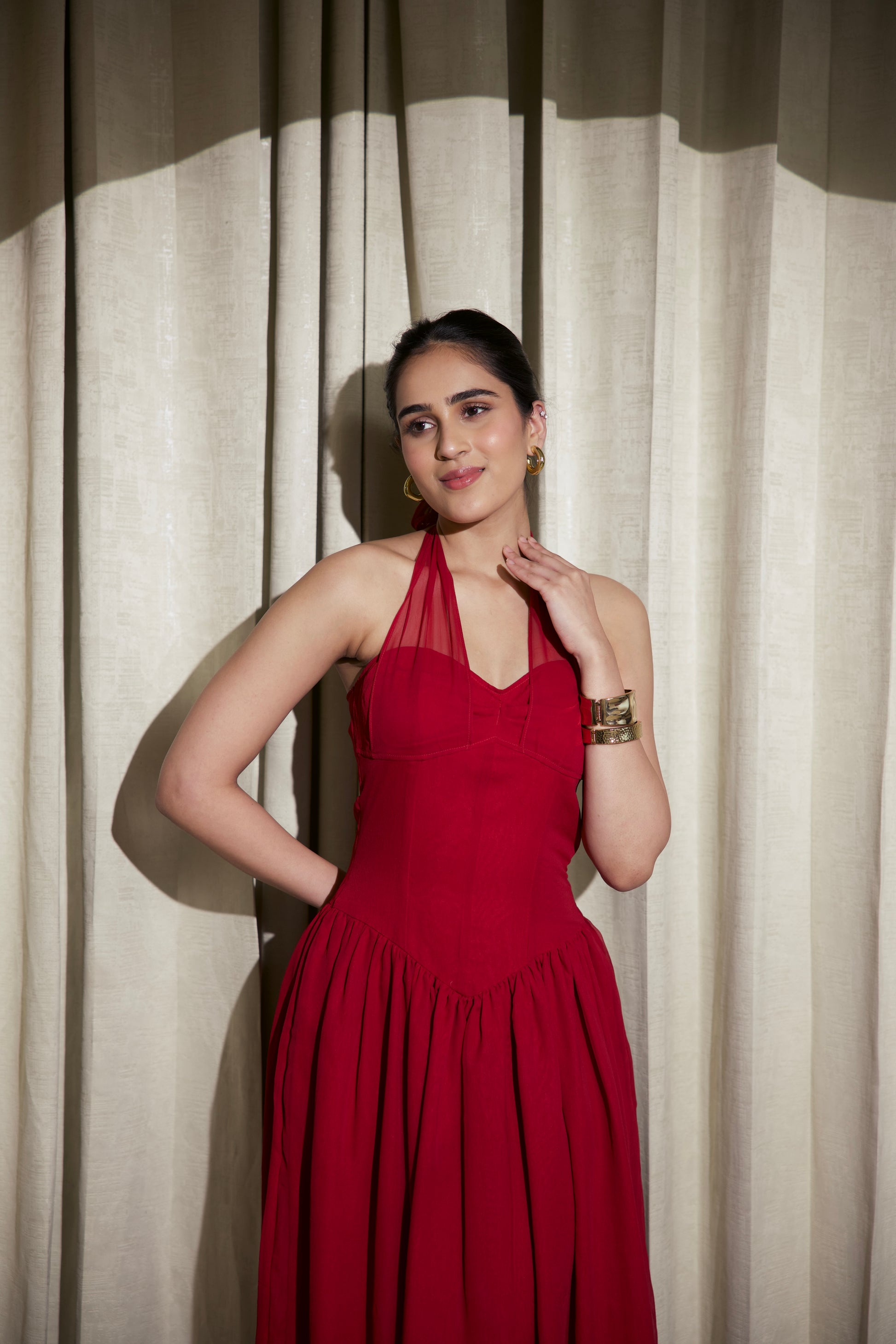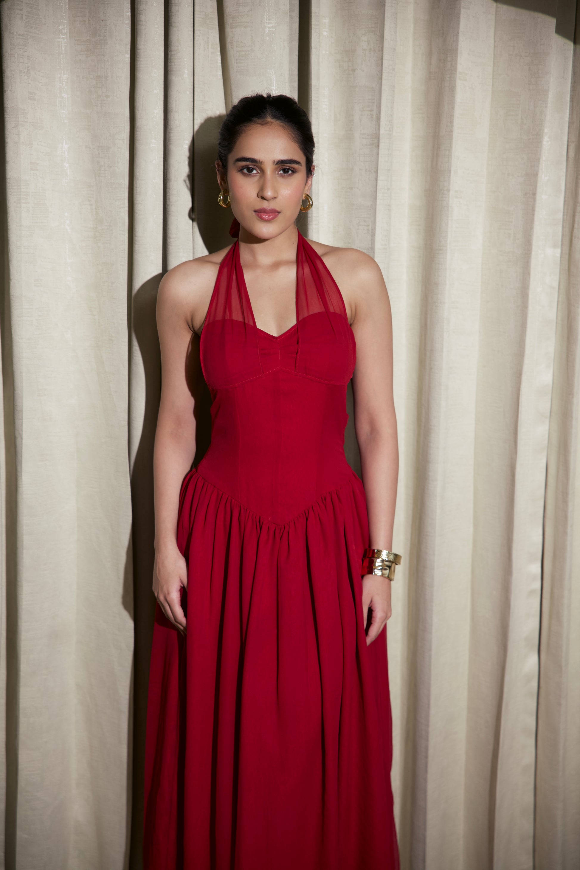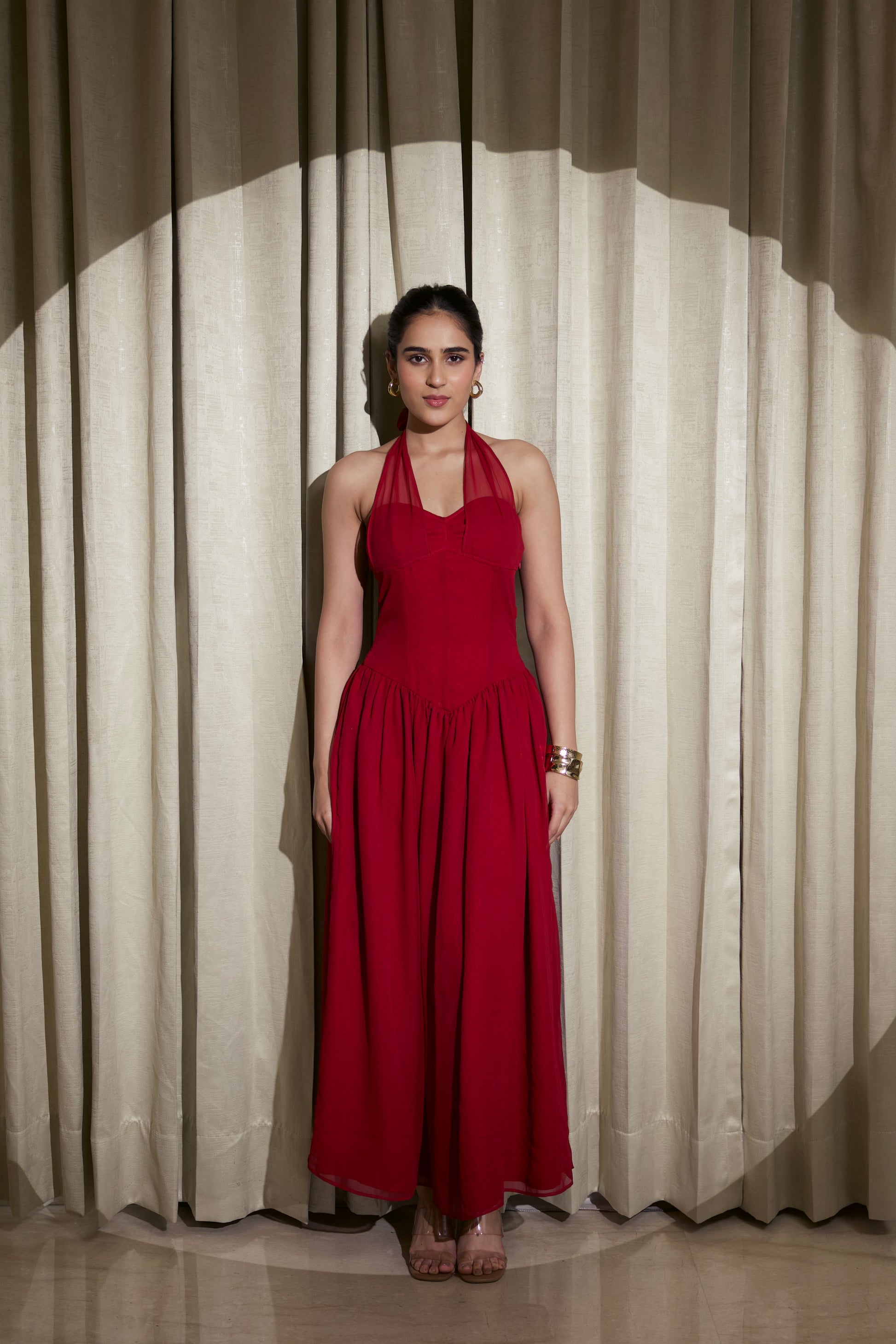 • Neckline: Halter neckline with a soft cowl drape and front V-cut detail.