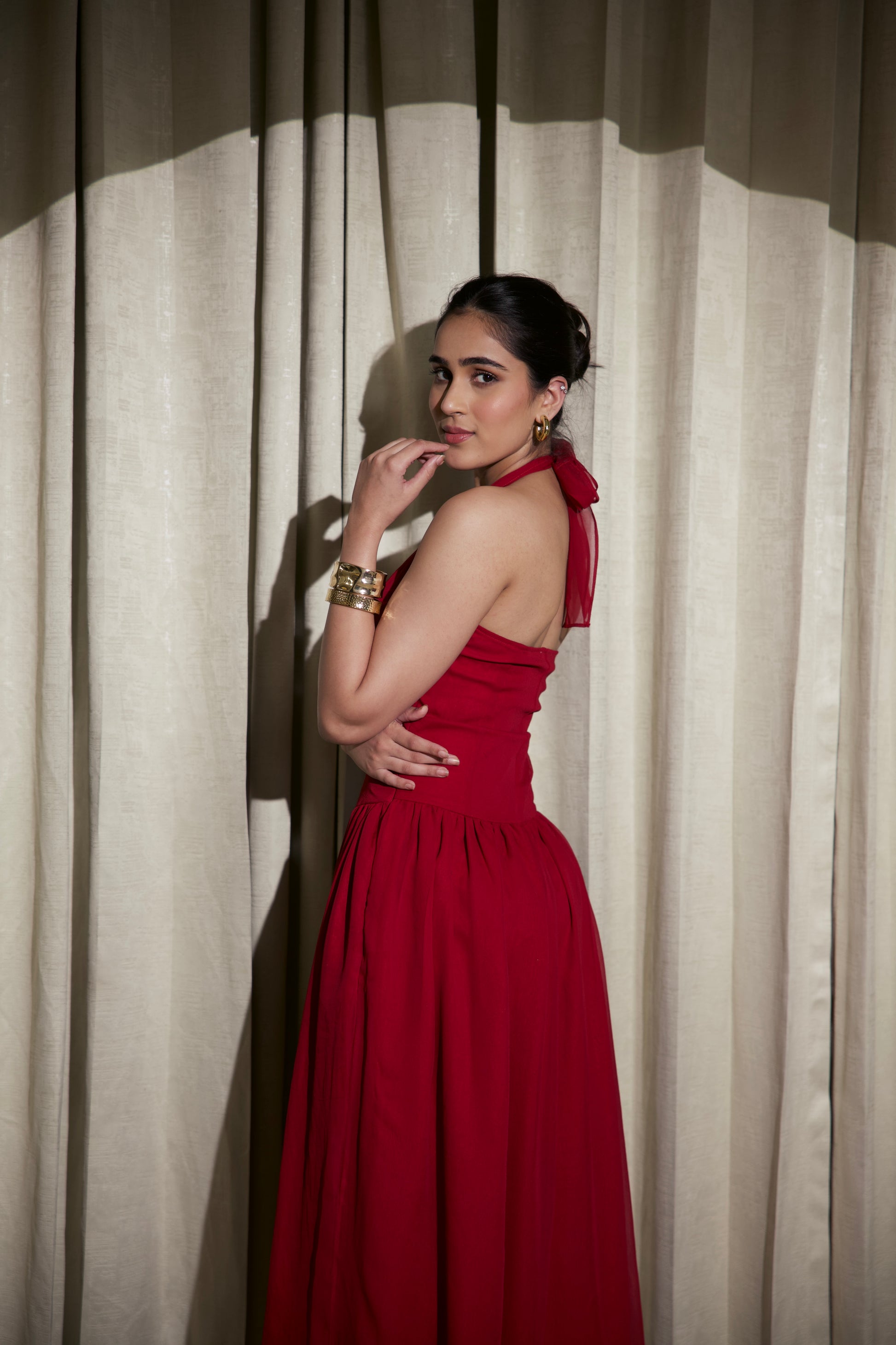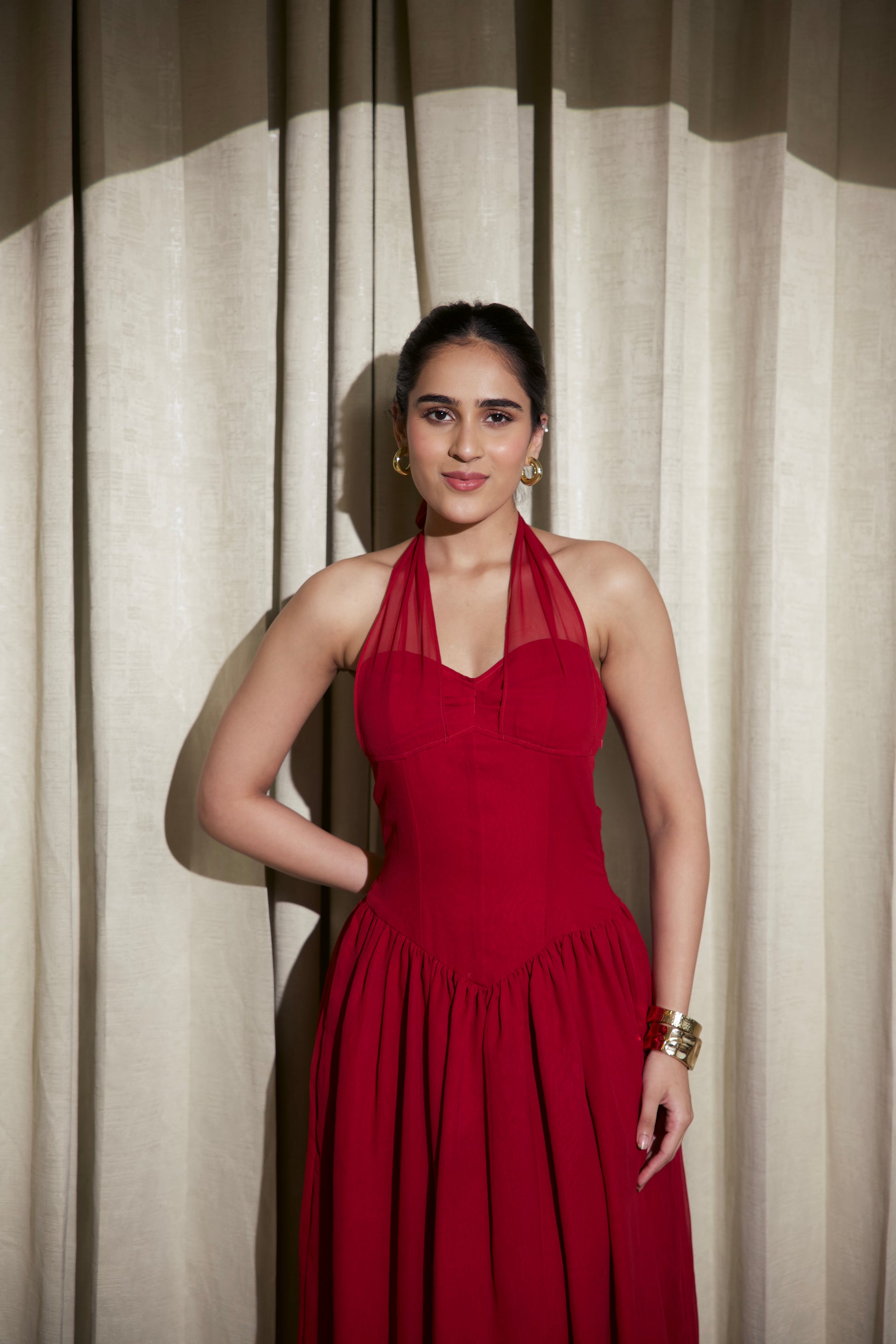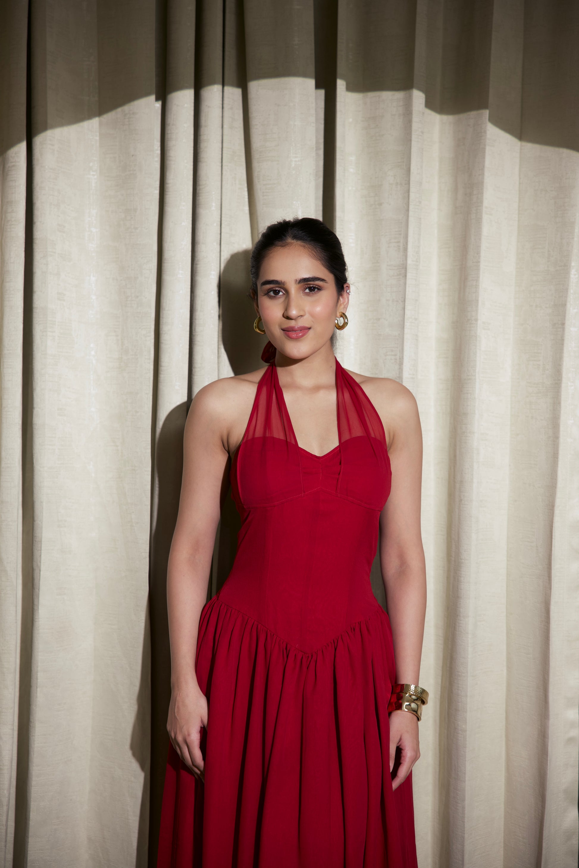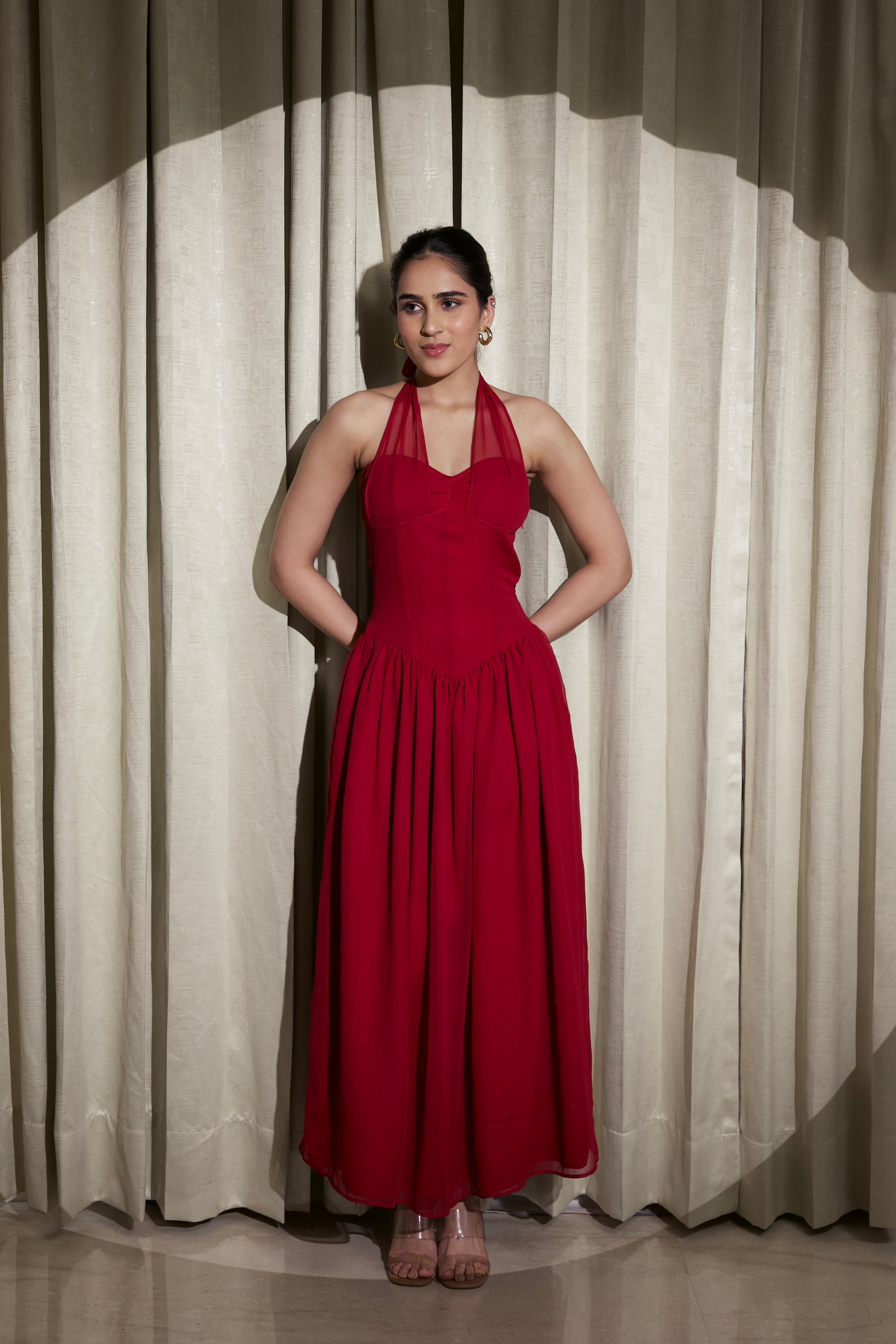 This stunning maroon satin gown is the definition of modern glamour. Made from luxurious, high-shine satin fabric, the dress drapes beautifully over the body, creating a fluid, sculpted silhouette. The halter neckline features a soft cowl drape with a subtle front V-cut, adding elegance while enhancing the natural contours of the neckline.