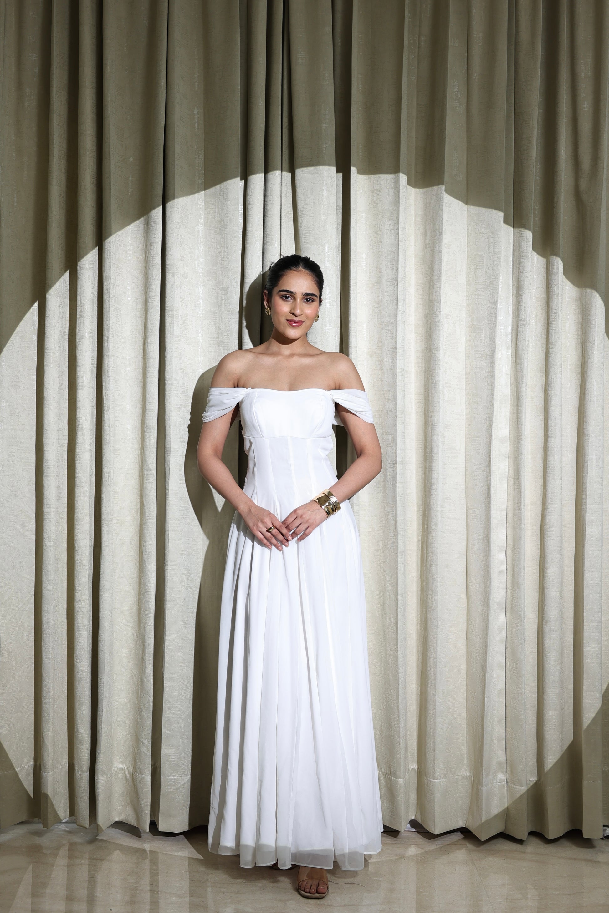 Crafted from airy white georgette and paired with a soft crepe lining, this gown brings an effortless blend of grace and movement. The bodice features a structured, corset-inspired look with delicate panel detailing that flatters the waist beautifully.