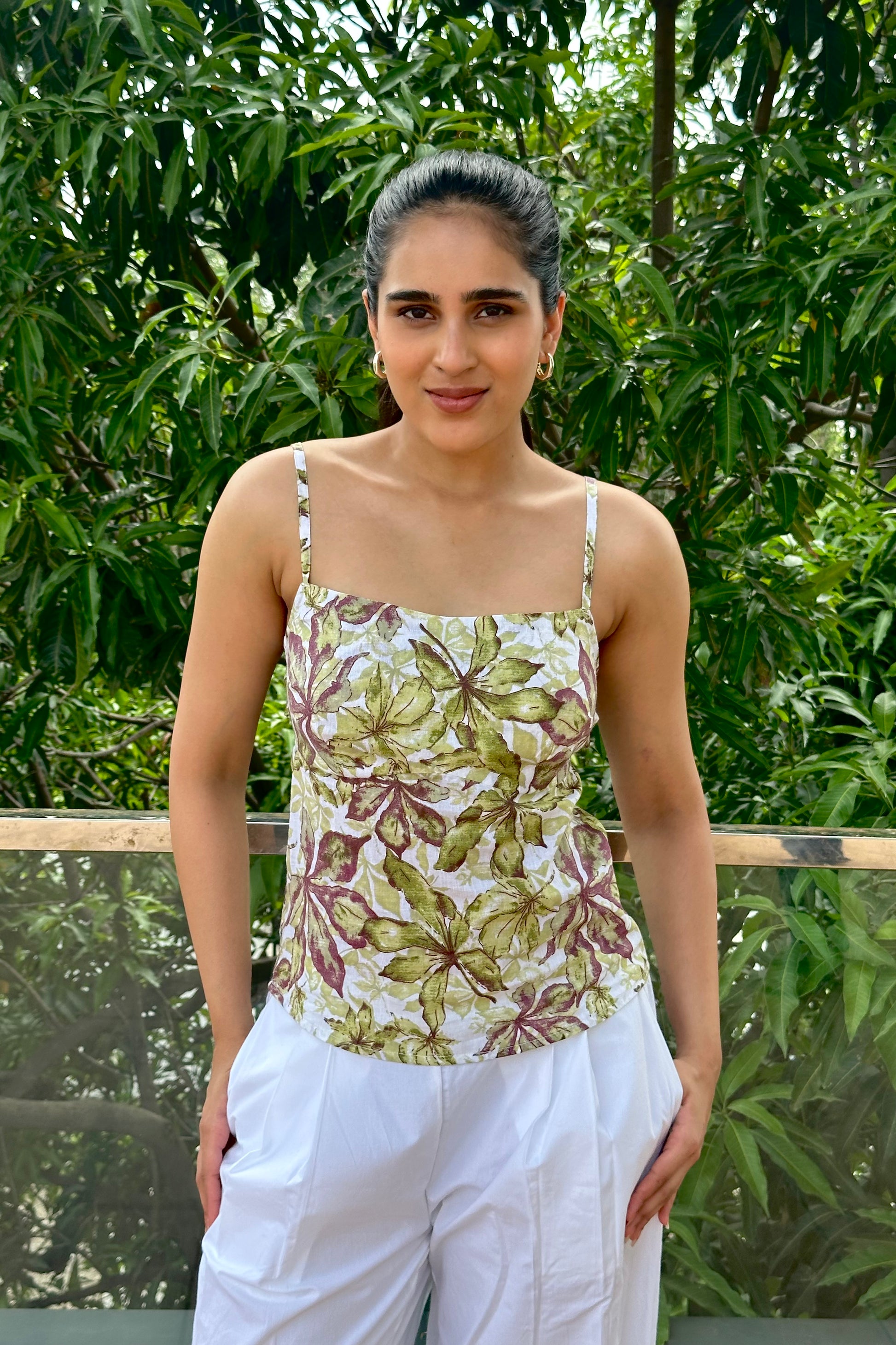This floral printed cotton top brings a refreshing tropical vibe with its green and wine-toned leaf motifs on a crisp white base. Featuring a straight neckline and slim shoulder straps, the top offers a flattering fit with princess seam detailing. The highlight is the open-back design with double strap bands and a statement tie-up bow at the center, adding a playful yet elegant touch. Ideal for warm-weather days, this piece blends comfort and style seamlessly.