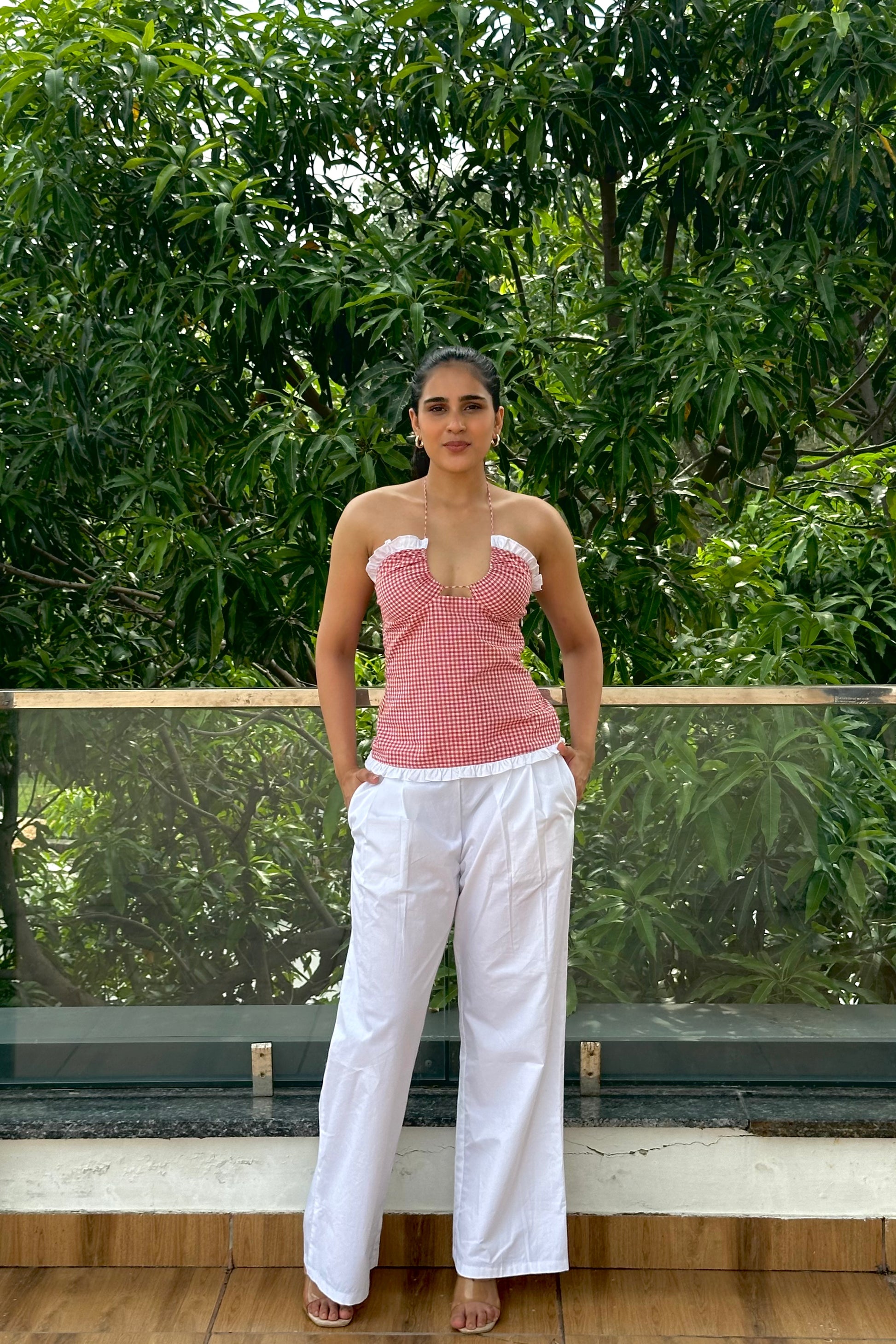 Introducing our Gingham Breeze Set — the perfect blend of playful charm and effortless ease. The red and white gingham halter top features a flattering sweetheart neckline with delicate ruffle trim, adding a touch of romance to this casual silhouette. Soft gathers at the bust enhance the fit, while the slim shape skims gracefully over the waist. Paired with relaxed-fit white cotton trousers, this look feels fresh, modern, and comfortable. Ideal for warm days, picnics, or casual getaways, it pairs beautifully with flat sandals and minimal accessories for a carefree vibe.