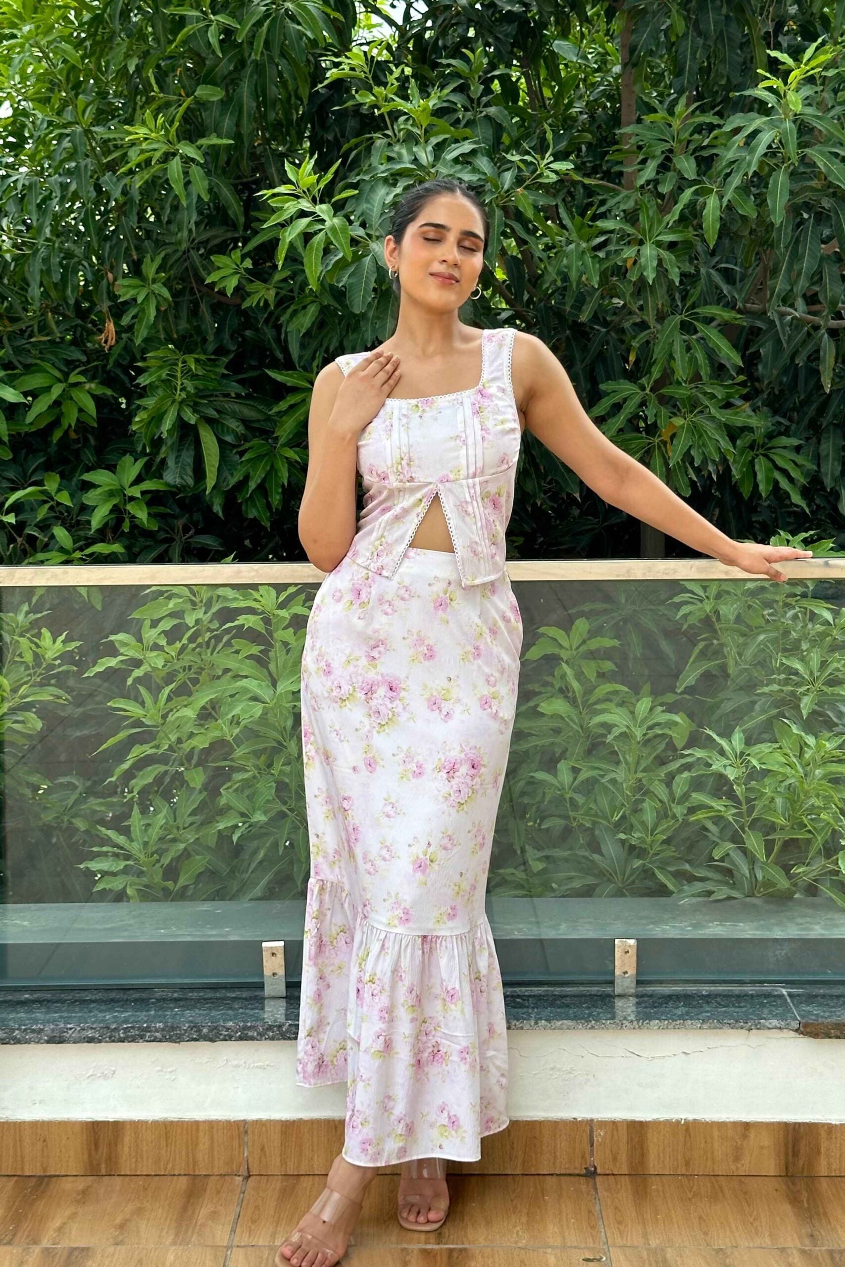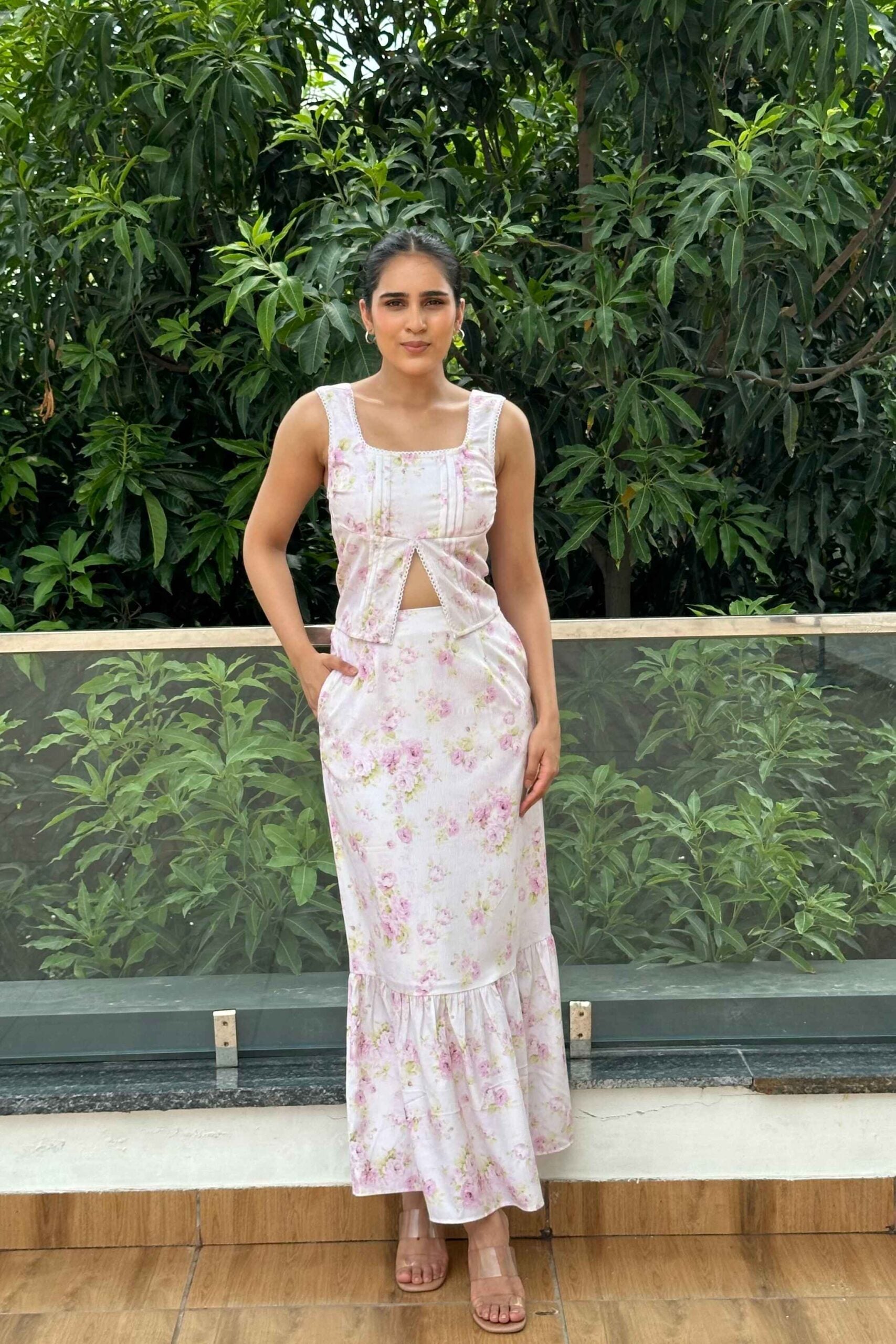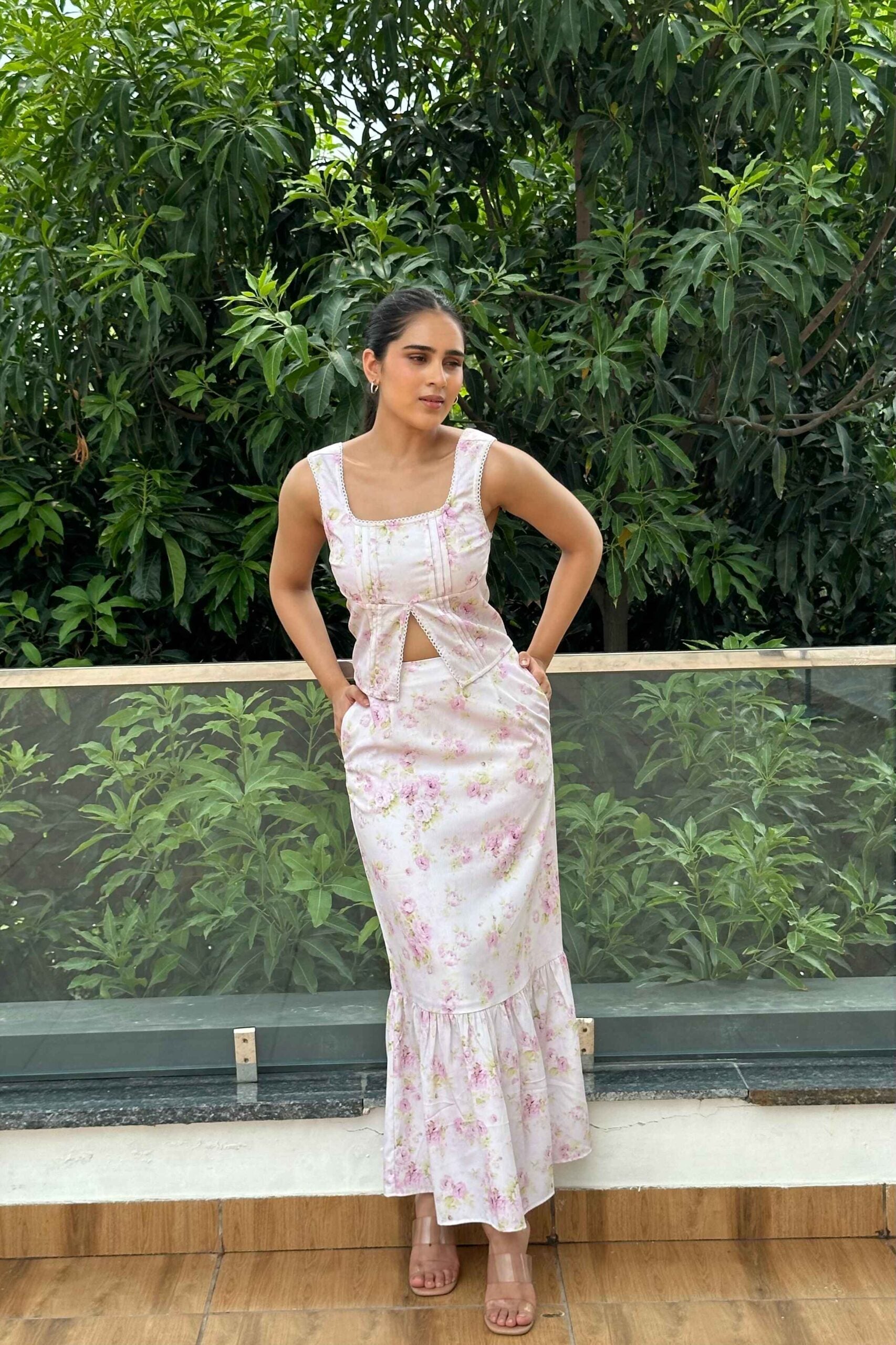 This handcrafted lavender floral co-ord set is made from soft crinkle fabric and fully lined with crepe. It features a front cutout lace-detailed top and an elastic-waist skirt with side pockets, frill hem, and a concealed zipper. Versatile and charming, the pieces can be worn together or separately. Handmade in India.