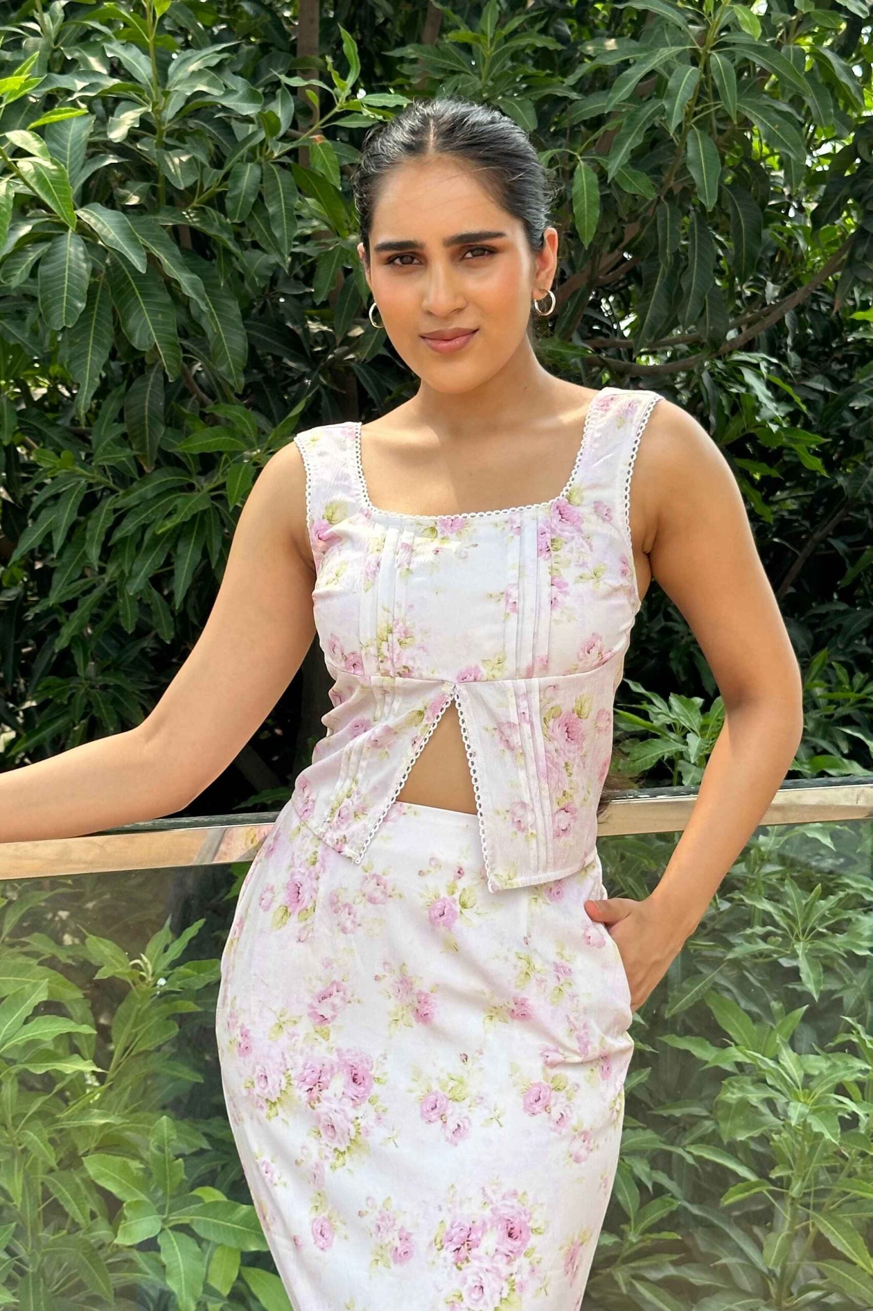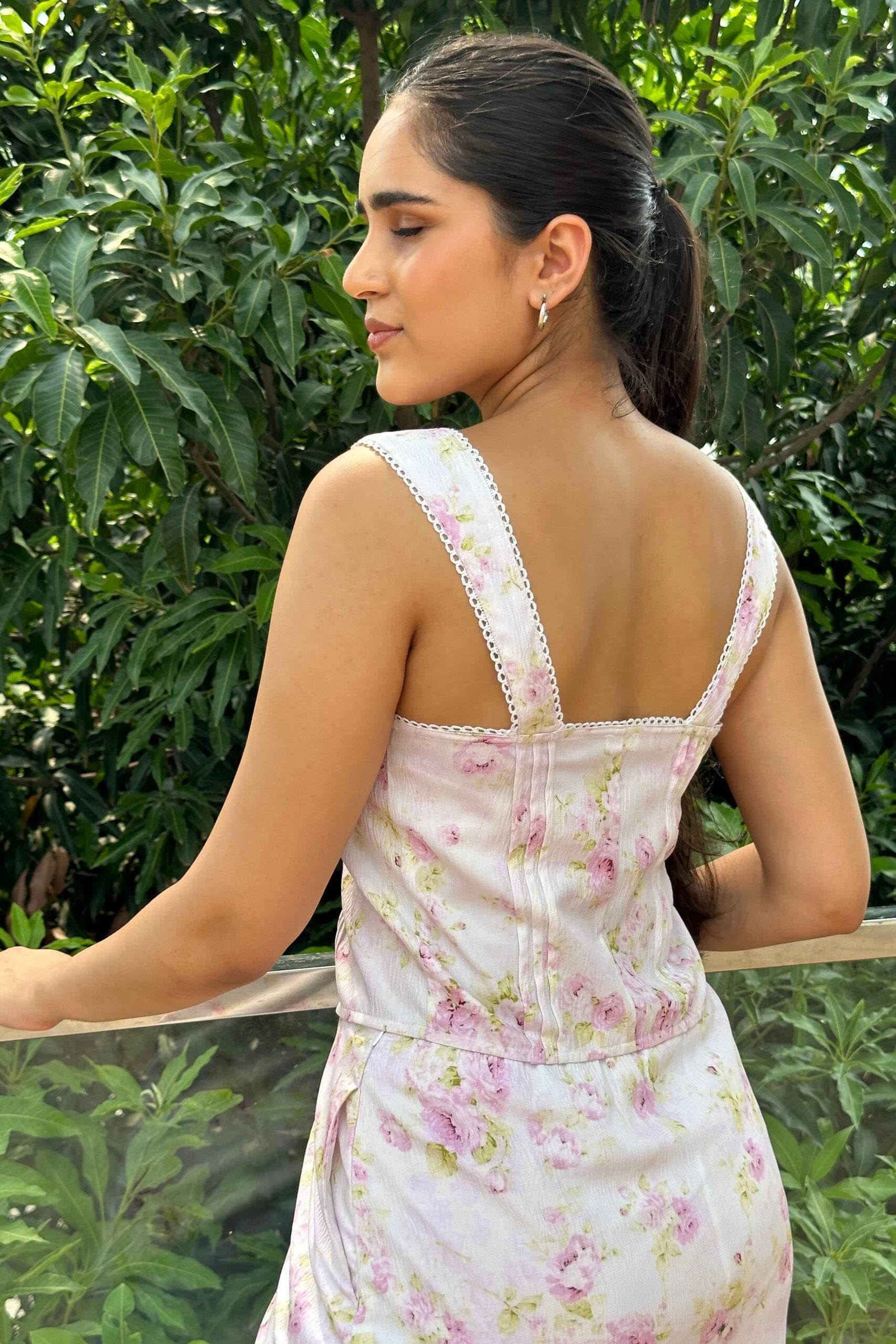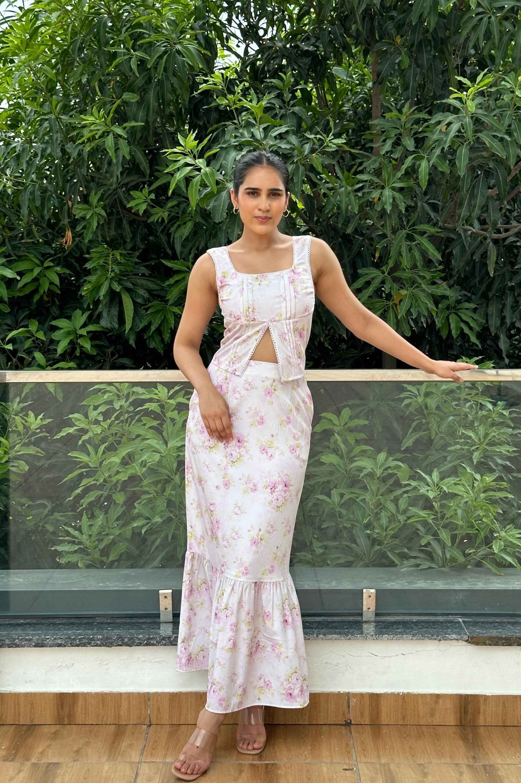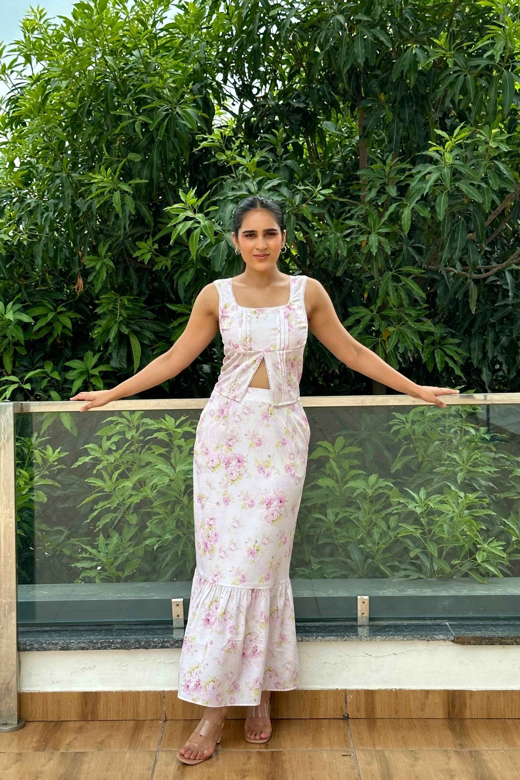 This handcrafted lavender floral co-ord set is made from soft crinkle fabric and fully lined with crepe. It features a front cutout lace-detailed top and an elastic-waist skirt with side pockets, frill hem, and a concealed zipper. Versatile and charming, the pieces can be worn together or separately. Handmade in India.