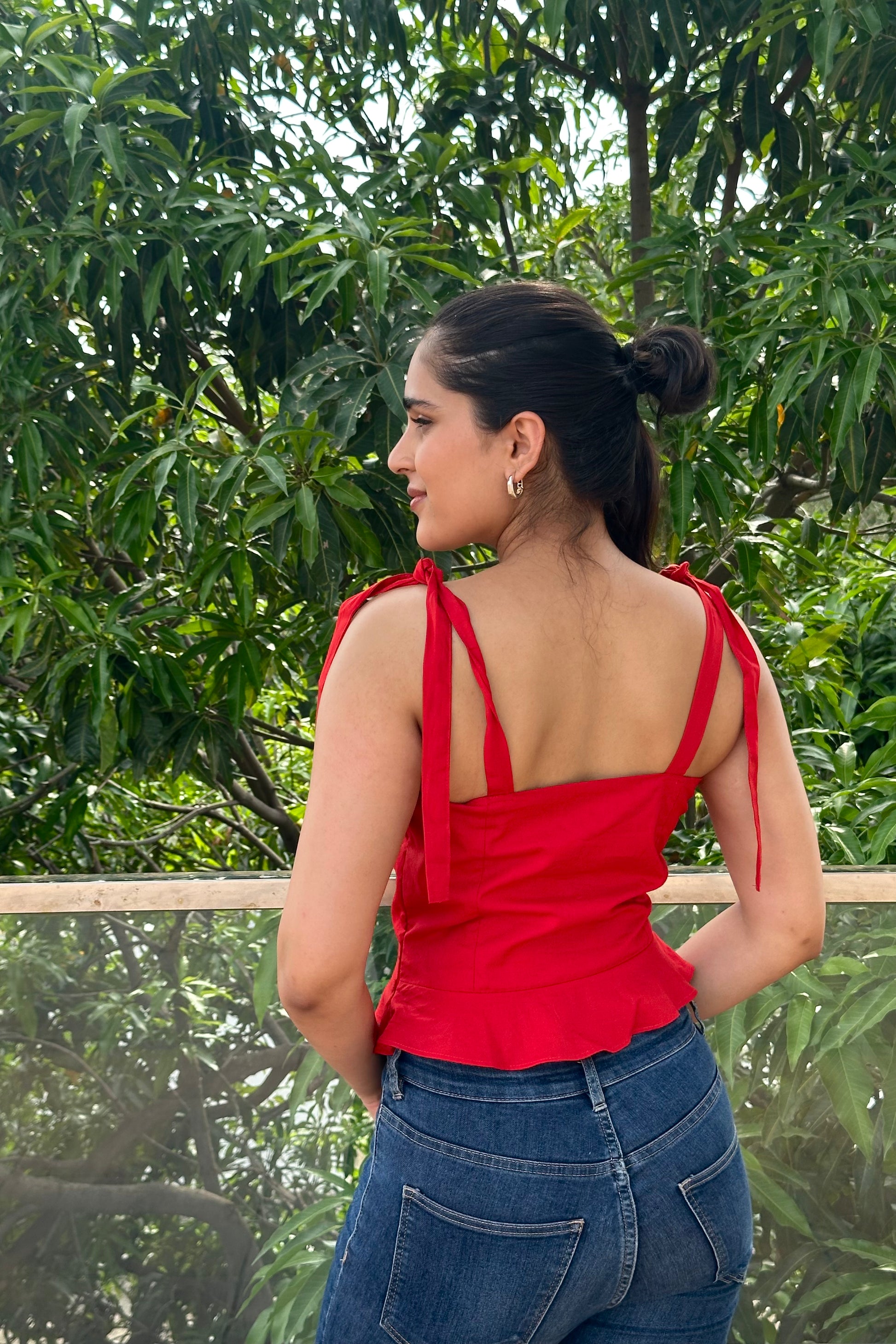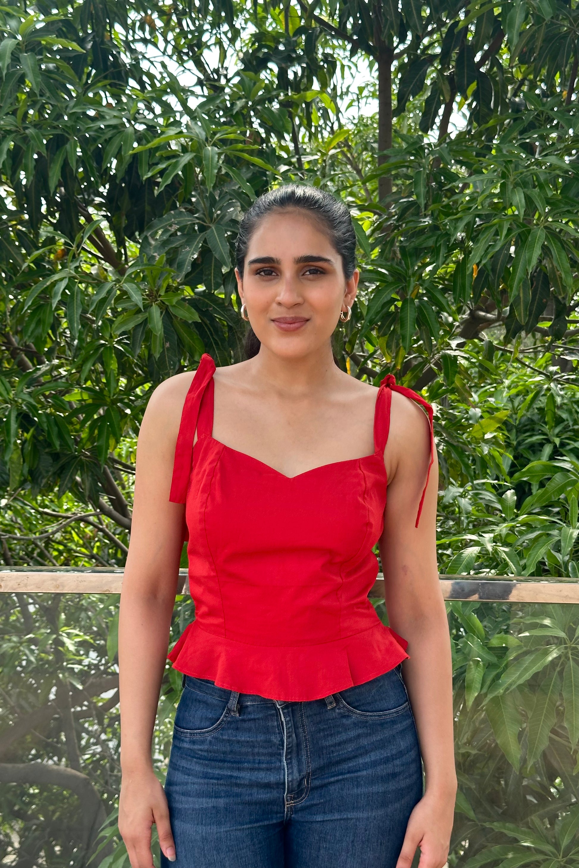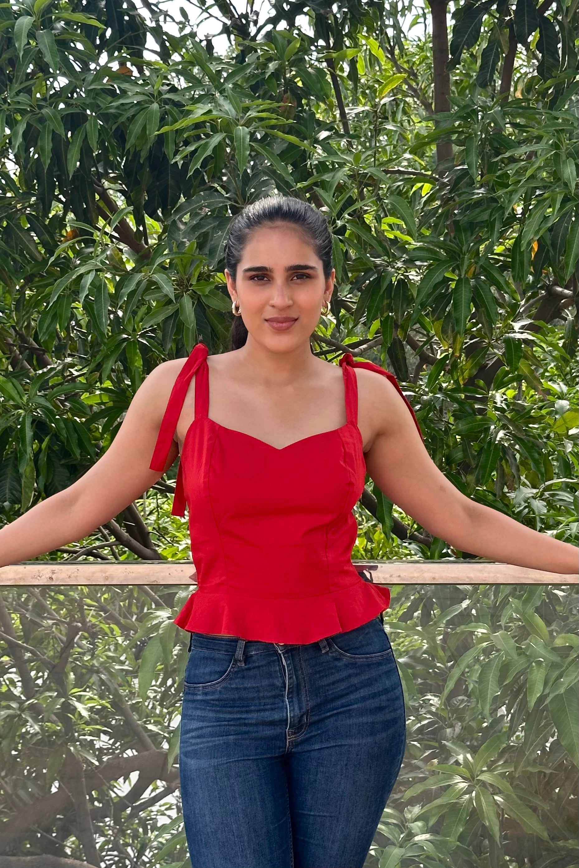 Bold and feminine, this bright red top features a flattering sweetheart neckline and charming tie-up shoulder straps that add a playful touch. The fitted bodice is tailored with princess seams for structure, while the flared peplum hem adds a soft, flirty finish. Perfect for day-to-night dressing, this piece pairs effortlessly with denim or skirts.