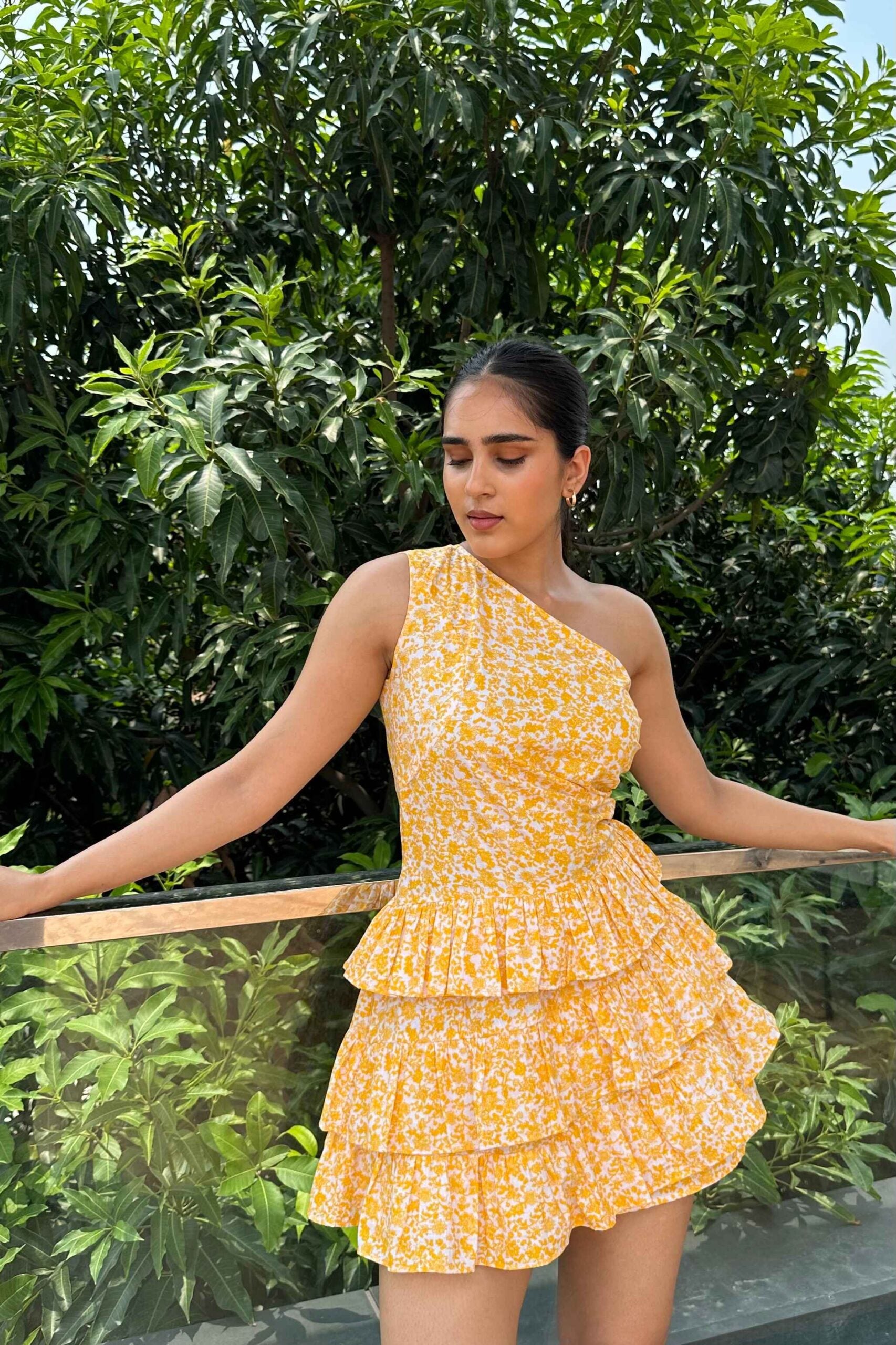 • 100% Cotton One shoulder Yellow print ruffle dress