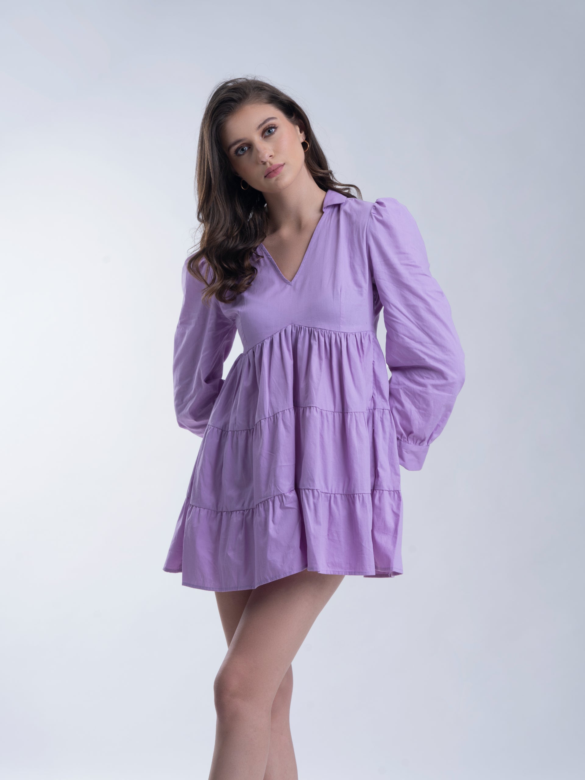 This lovely lavender dress is crafted from 100% cotton fabric, ensuring comfort and breathability. It features a classic collar neckline, full sleeves, and a flattering above-the-knee length—perfect for effortless everyday elegance.