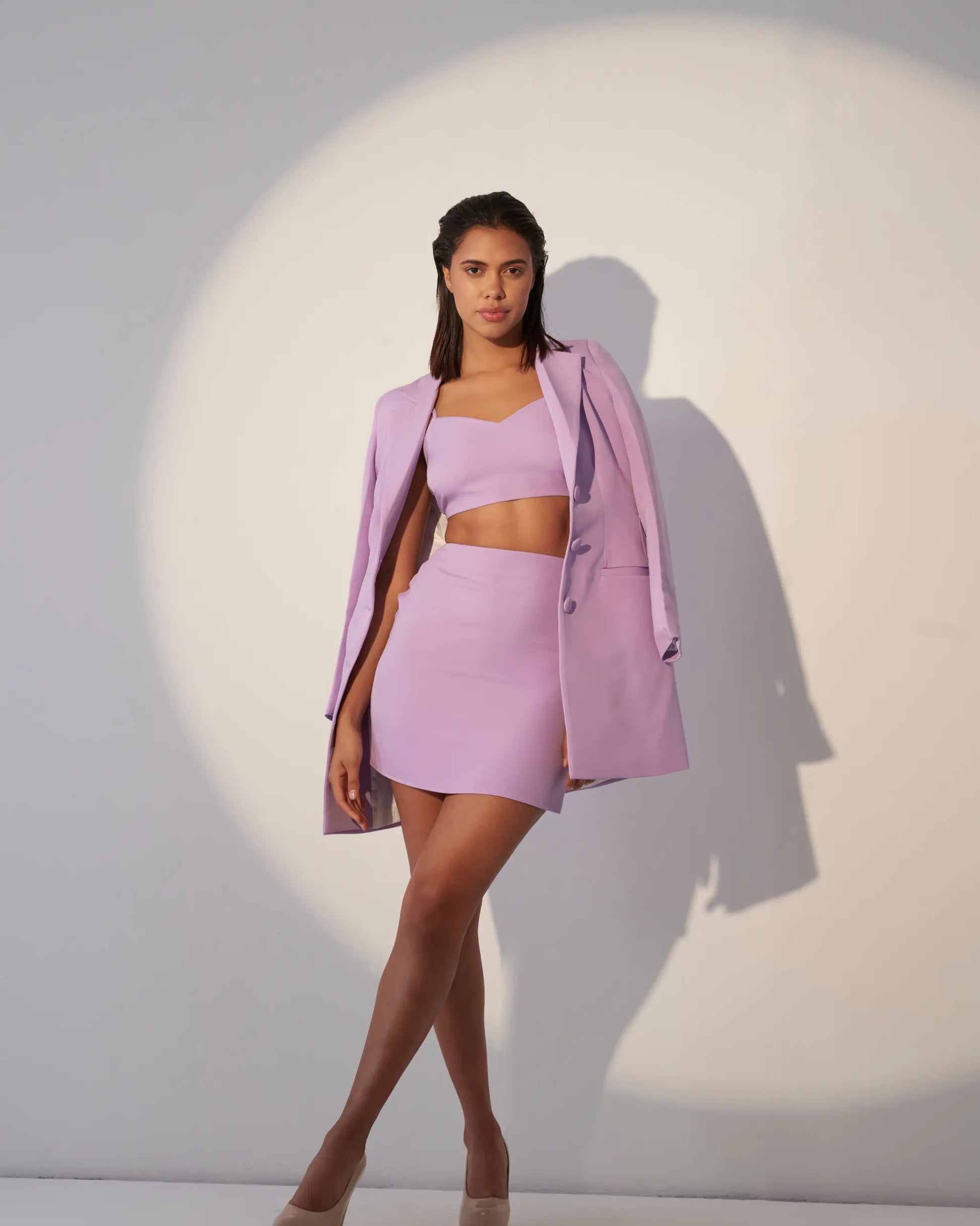 This elegant lavender co-ord set is crafted from premium heavy crepe fabric and features a sleek crop top, a short skirt, and a long blazer for a chic layered look. The blazer is fully lined with luxurious satin, designed with classic notch lapels, same-fabric front buttons, and flap welt pockets for added detail. Both the top and skirt come with concealed side zippers for a seamless finish. Stylish, structured, and refined—perfect for making a statement.