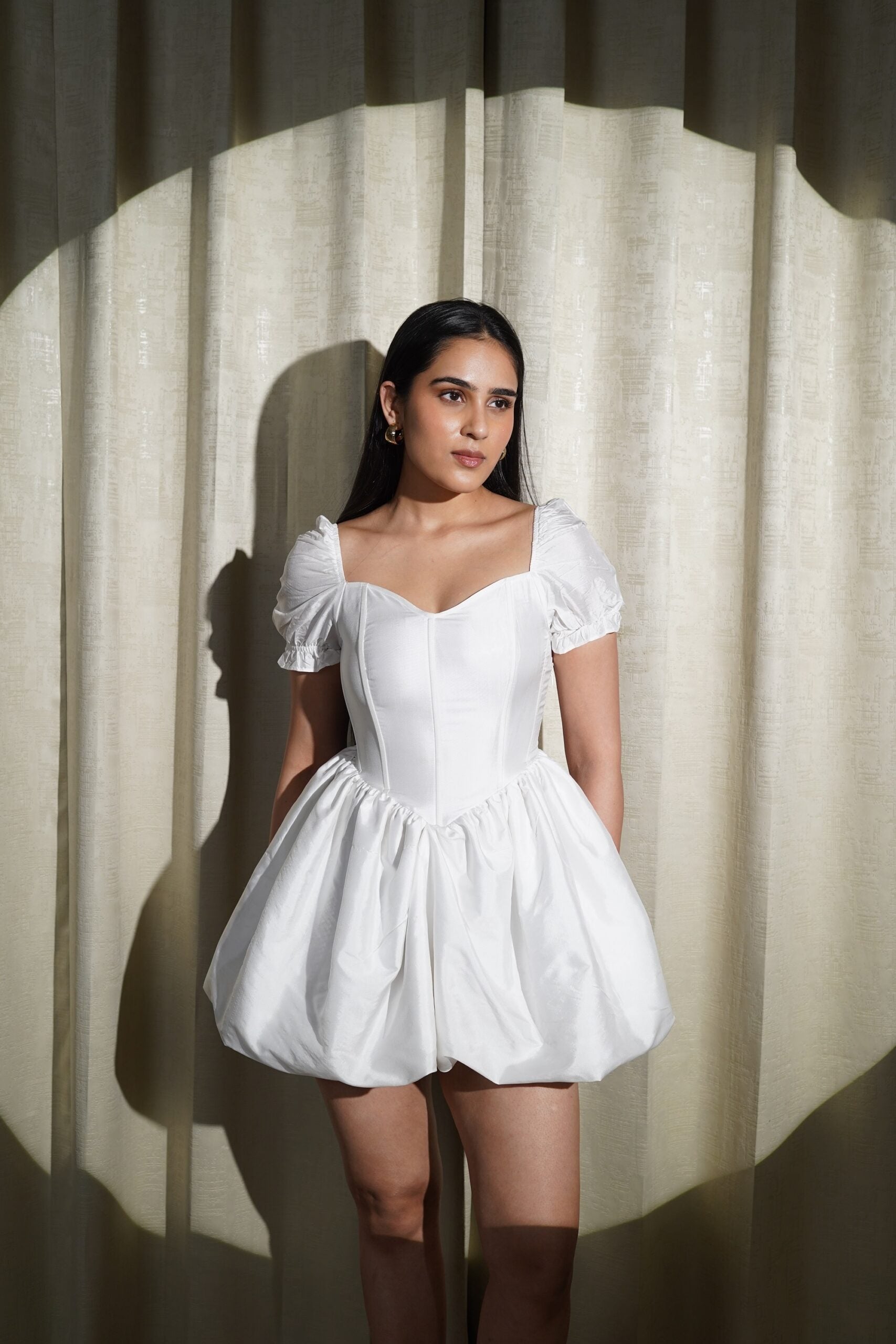 This elegant white dress is handcrafted from crisp, luxurious taffeta and features a structured corset bodice with short puff sleeves and a playful balloon-style skirt. A self-tie back and concealed side zipper offer a tailored fit, while the short length adds a youthful, modern edge. Perfect for birthdays, date nights, or special occasions, it blends timeless charm with bold sophistication.
