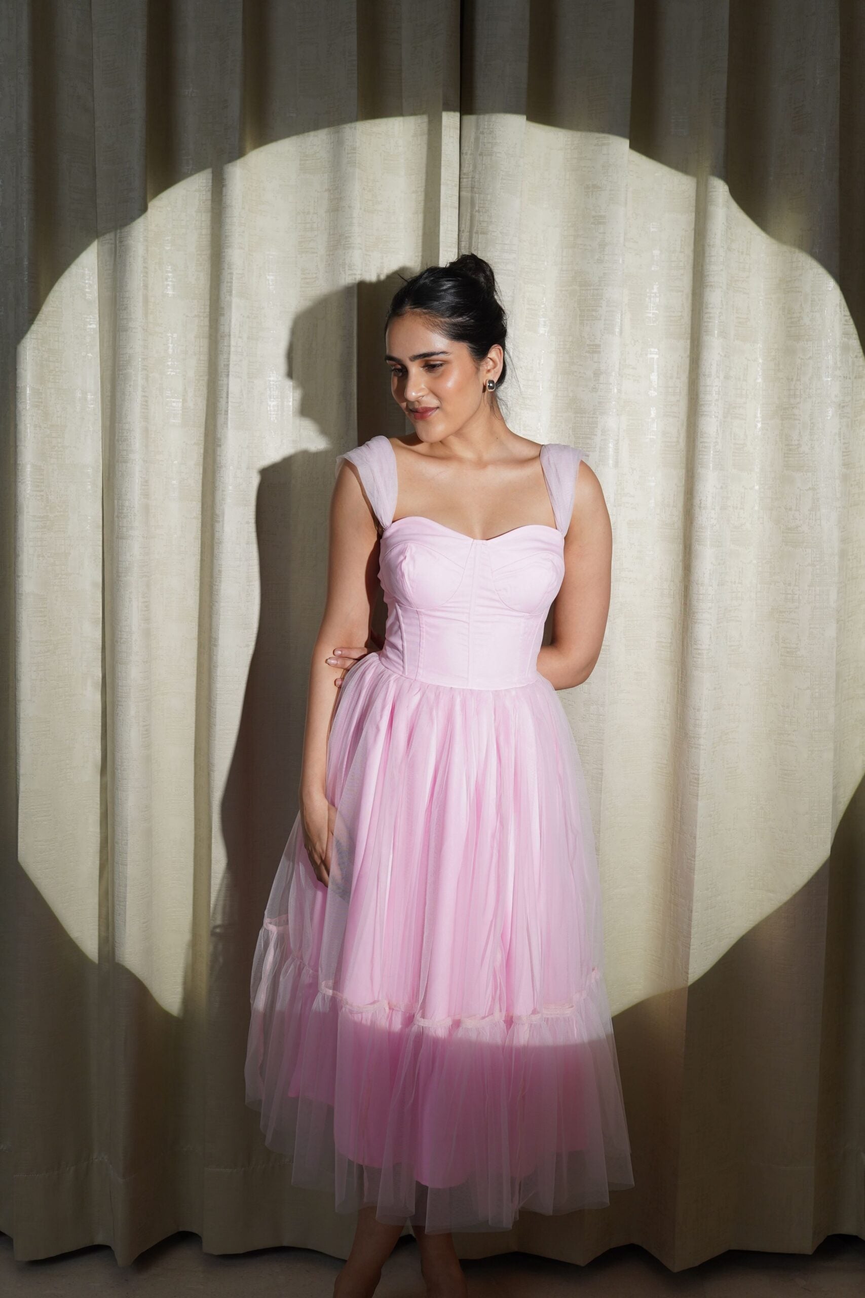 This handcrafted pink dress is a dreamy blend of elegance and femininity. Made from soft net fabric, it features a structured corset top that enhances the silhouette, paired with a fully flared bottom for a graceful and flowy look. The dress includes short gathered sleeves for a delicate touch and a self-tie back for an adjustable fit. A concealed side zipper ensures a seamless finish, while the dress is fully lined with soft crepe fabric for comfort. Designed at calf length, this dress is perfect for special occasions or romantic evenings.