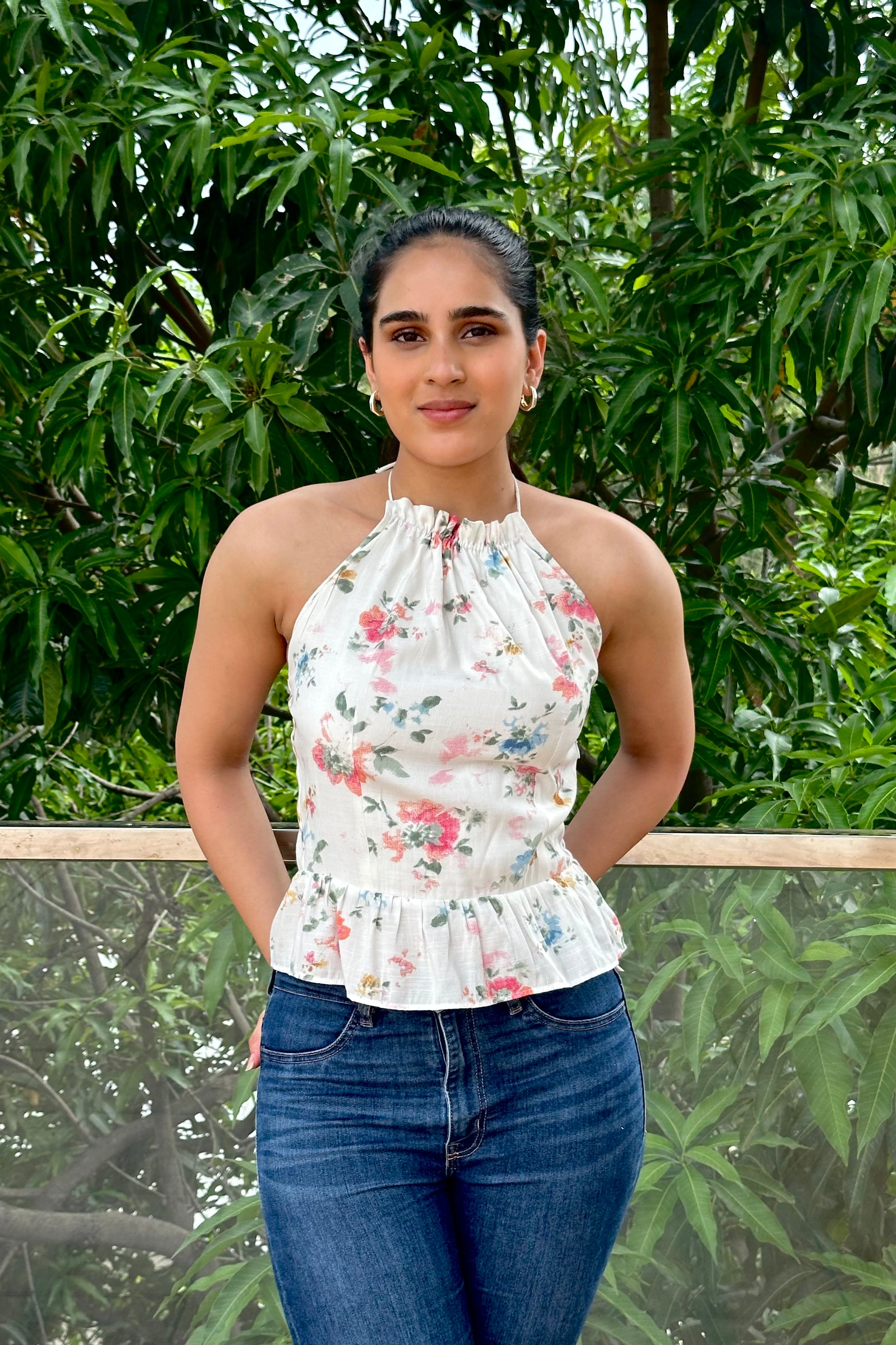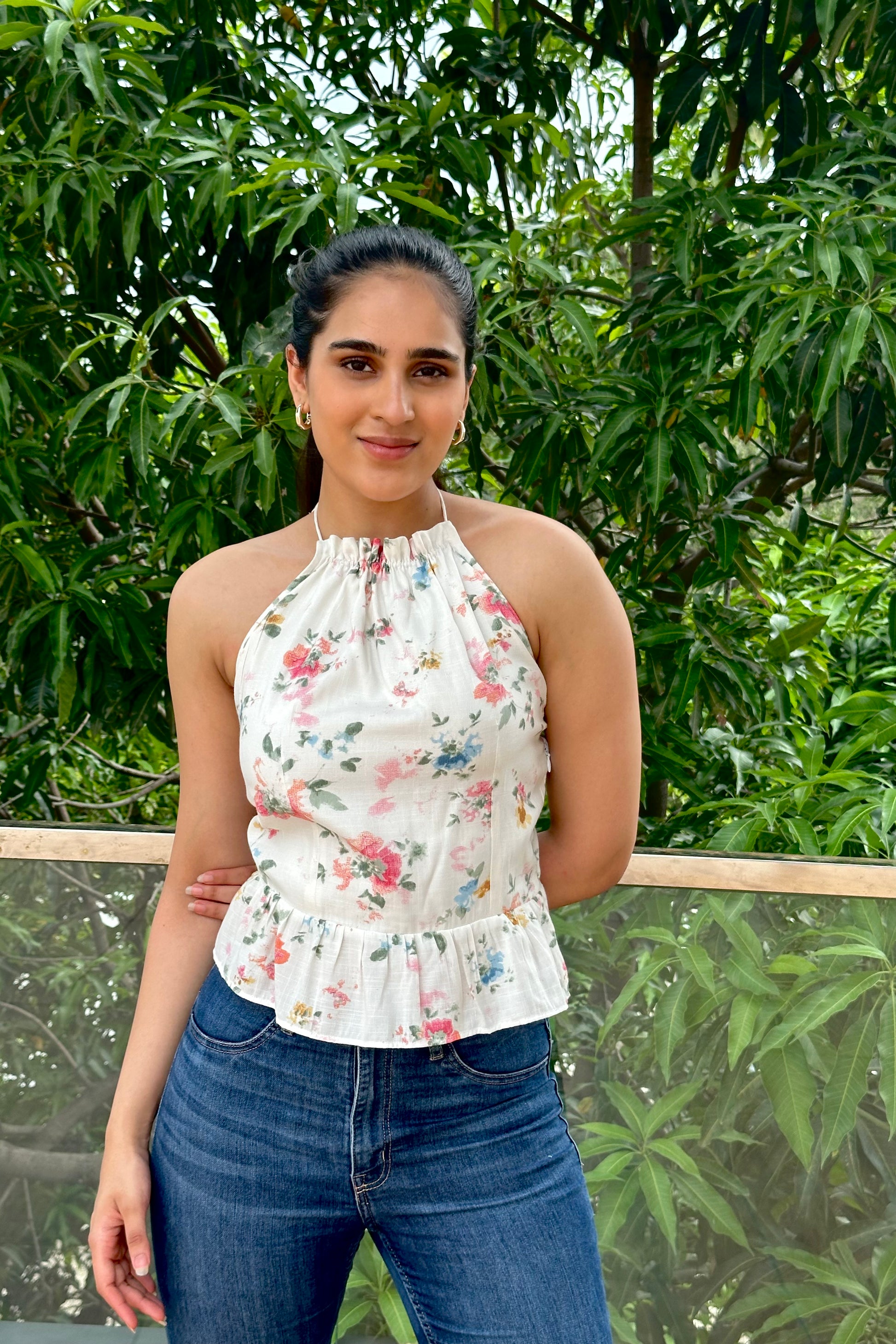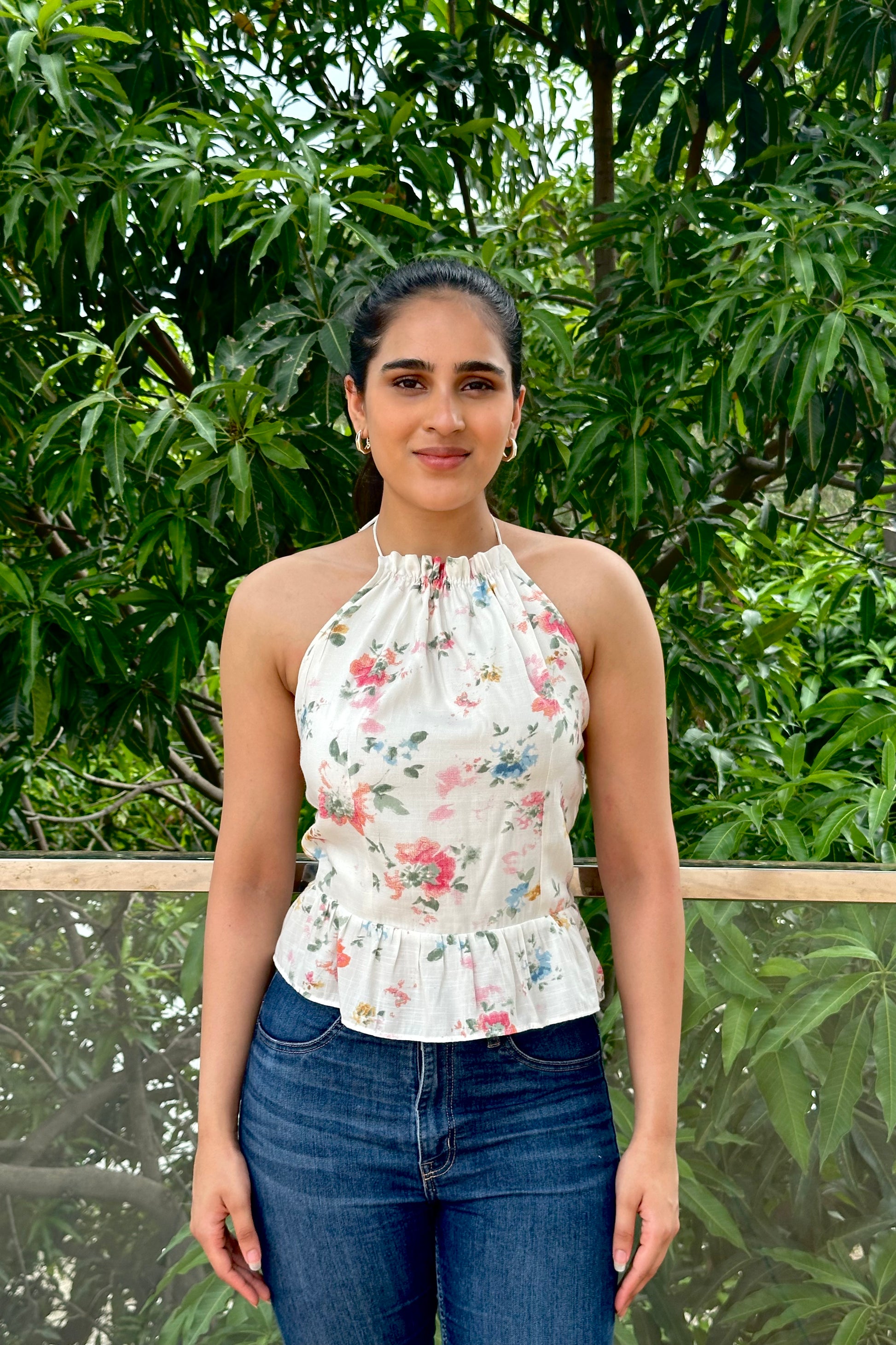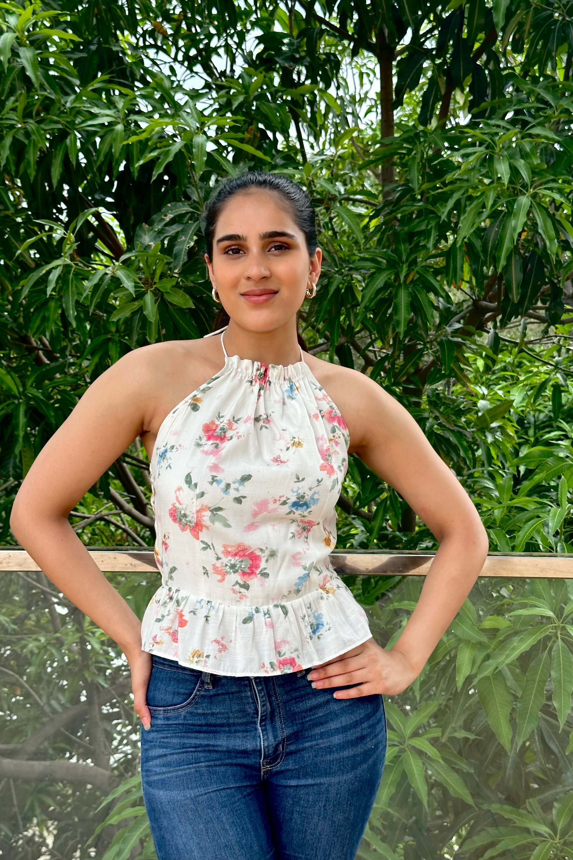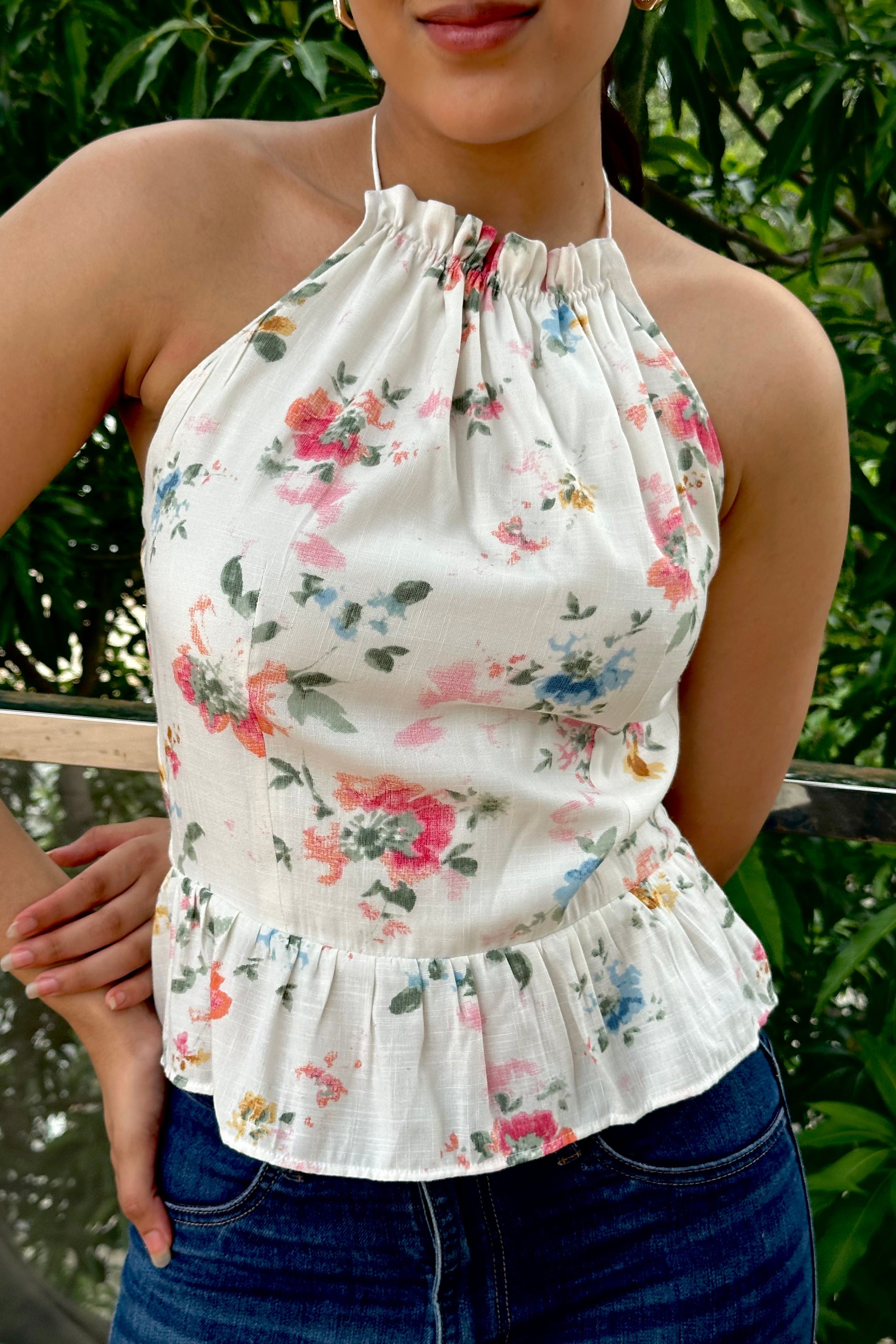 Introducing our Meadow Bloom Backless Halter Top, a fresh and romantic piece crafted for sunny days and effortless style. This lightweight cotton top showcases a delicate watercolor floral print on a soft white base. The gathered halter neckline ties gracefully at the back of the neck, allowing you to adjust the fit to your liking. The open back design adds an alluring touch, balanced by the sweet peplum hem that skims the waist. Feminine, airy, and versatile, it pairs perfectly with jeans, shorts, or skirts for brunches, vacations, or laid-back evenings.