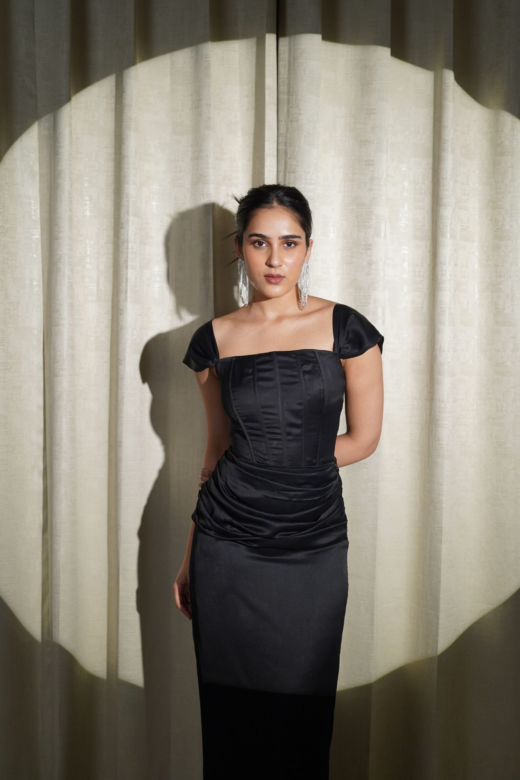 This elegant black coord set is handcrafted from luxurious satin fabric, offering a smooth, lustrous finish. The set includes a corset-style top and a long, gathered detailing skirt, combining structure and flow for a stunning look.