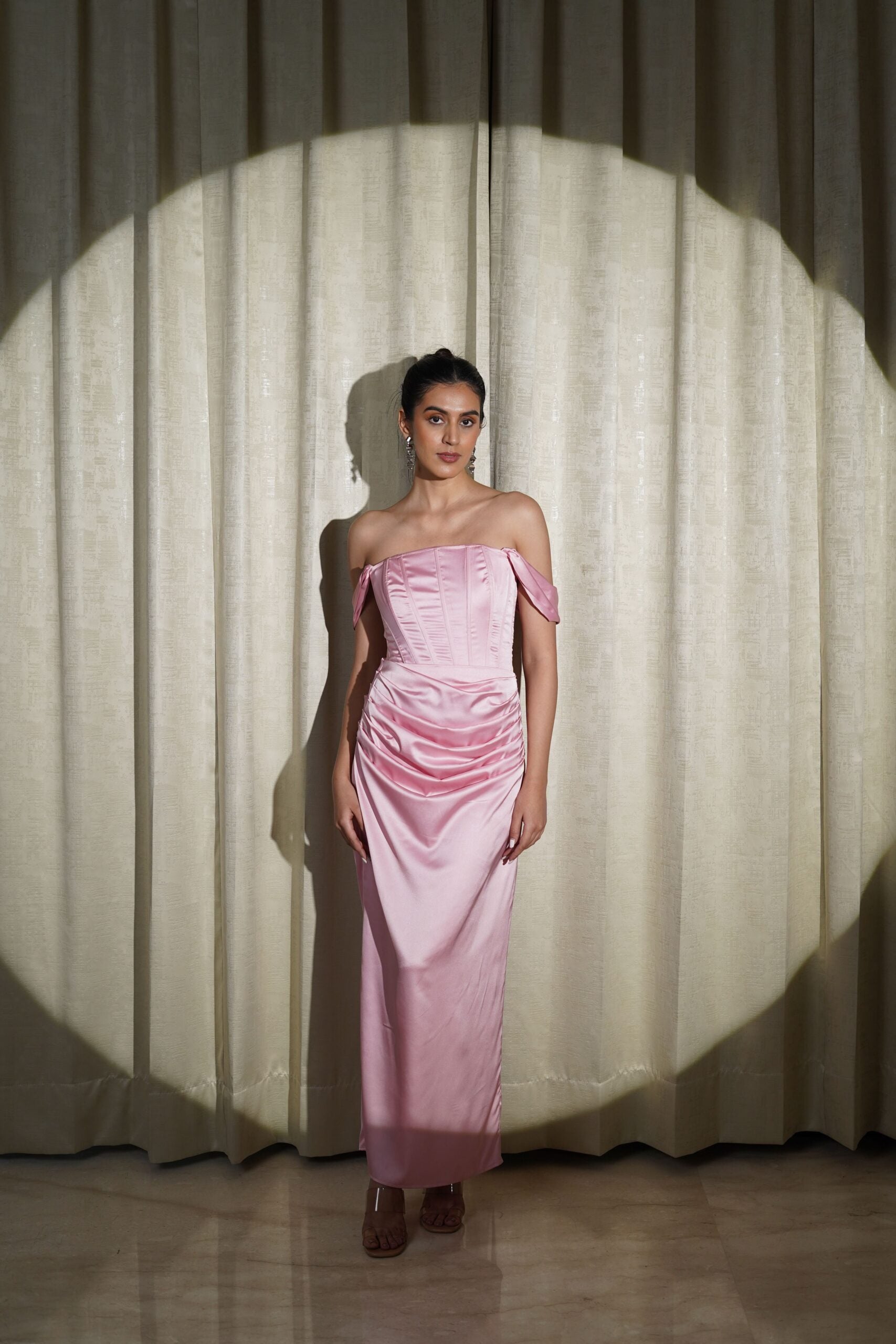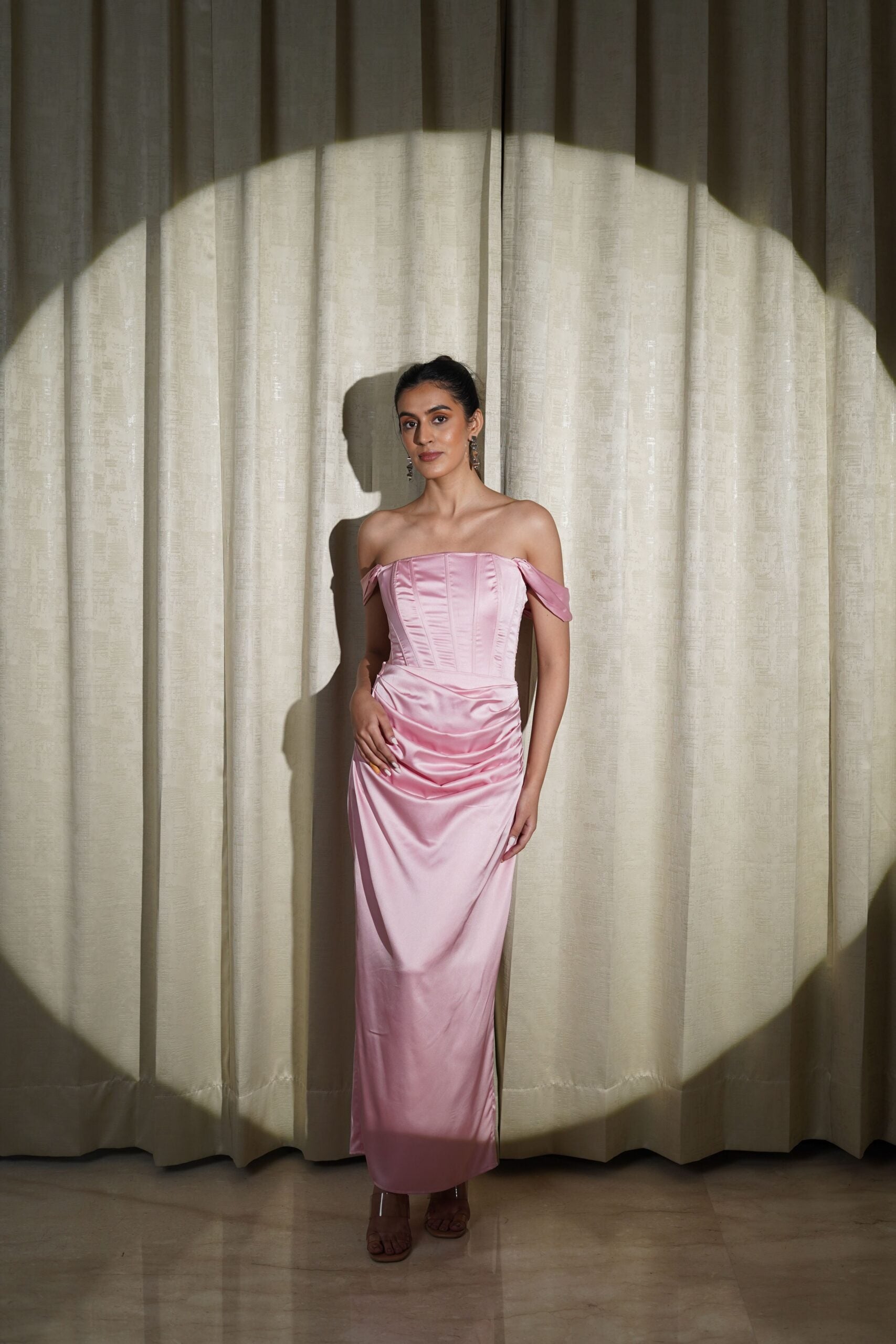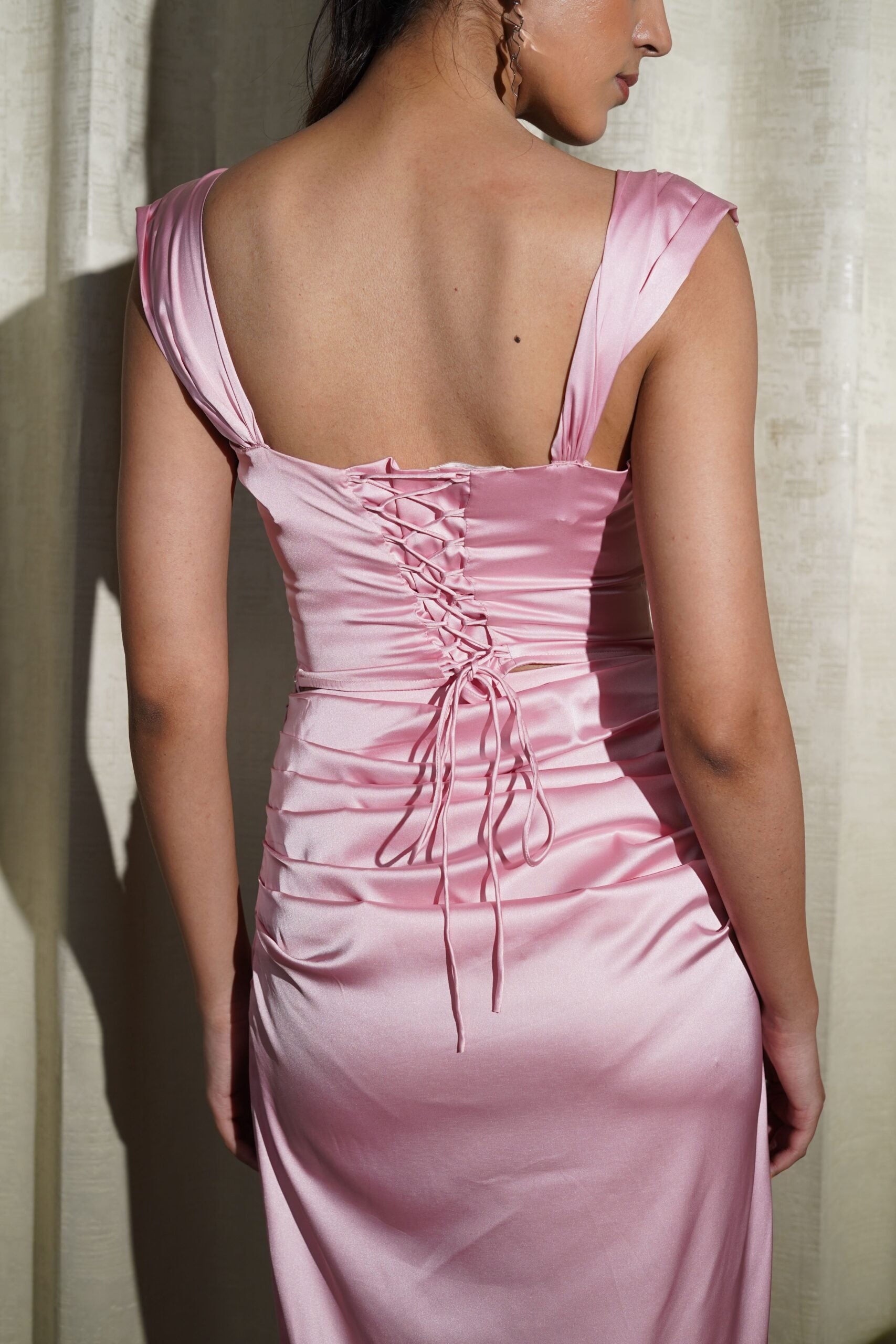 This elegant Pink coord set is handcrafted from luxurious satin fabric, offering a smooth, lustrous finish. The set includes a corset-style top and a long, gathered detailing skirt, combining structure and flow for a stunning look. The corset top features boning for added support and shape, creating a flattering, fitted silhouette. It has a self-tie back, allowing for an adjustable fit, while the short sleeves are gathered and can be worn up for a more dramatic effect or kept down for a softer look.
