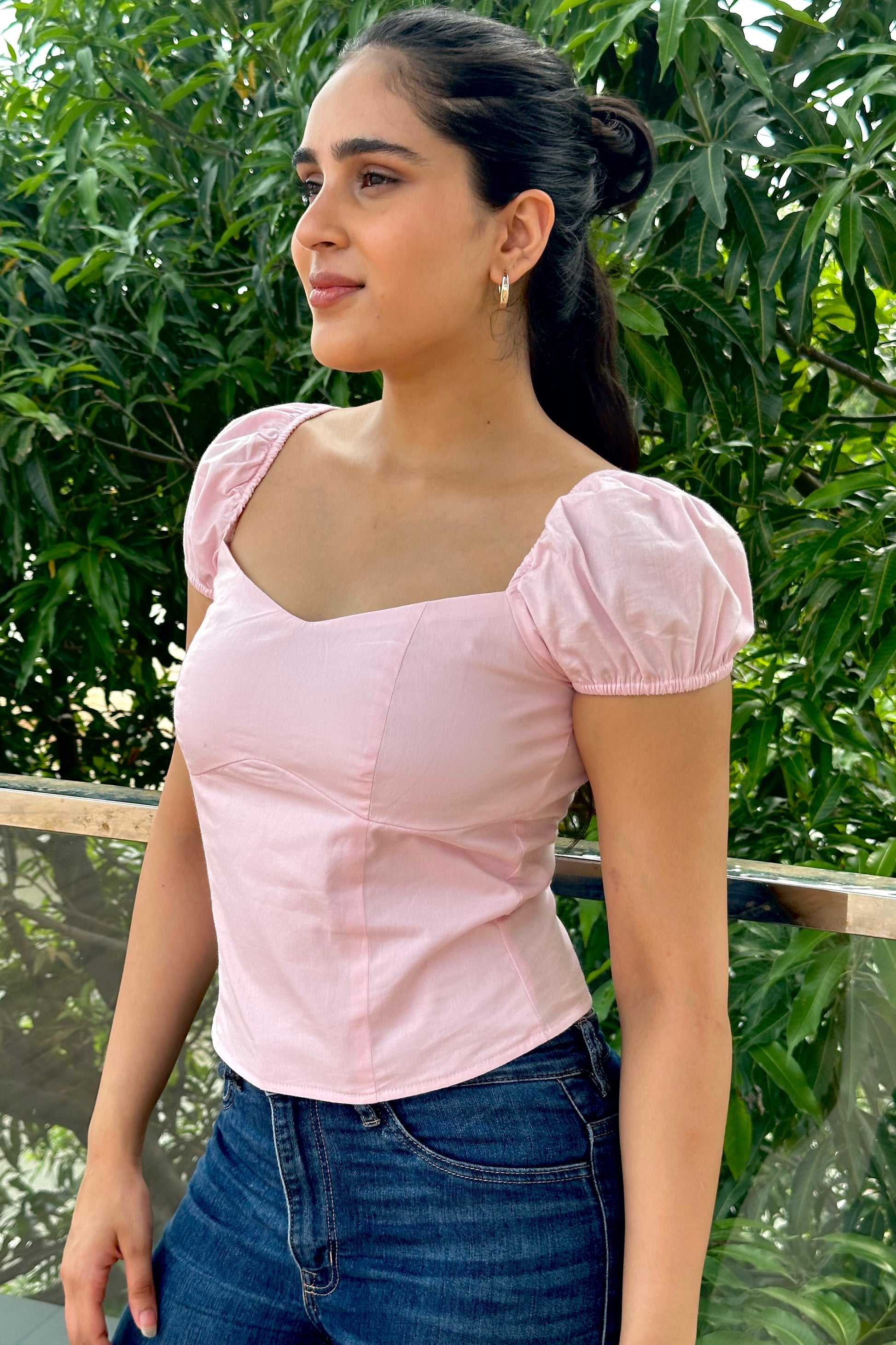Introducing our Blush Charm Top — a sweet and structured piece that’s perfect for your everyday wardrobe. Crafted in soft pink cotton, this top features a flattering sweetheart neckline and subtle corset-inspired seam detailing for a contoured fit. The puff sleeves add a romantic touch, balancing softness with a defined silhouette. Easy to pair with jeans, skirts, or shorts, this top effortlessly blends feminine elegance with modern versatility — ideal for brunches, dates, or casual outings.