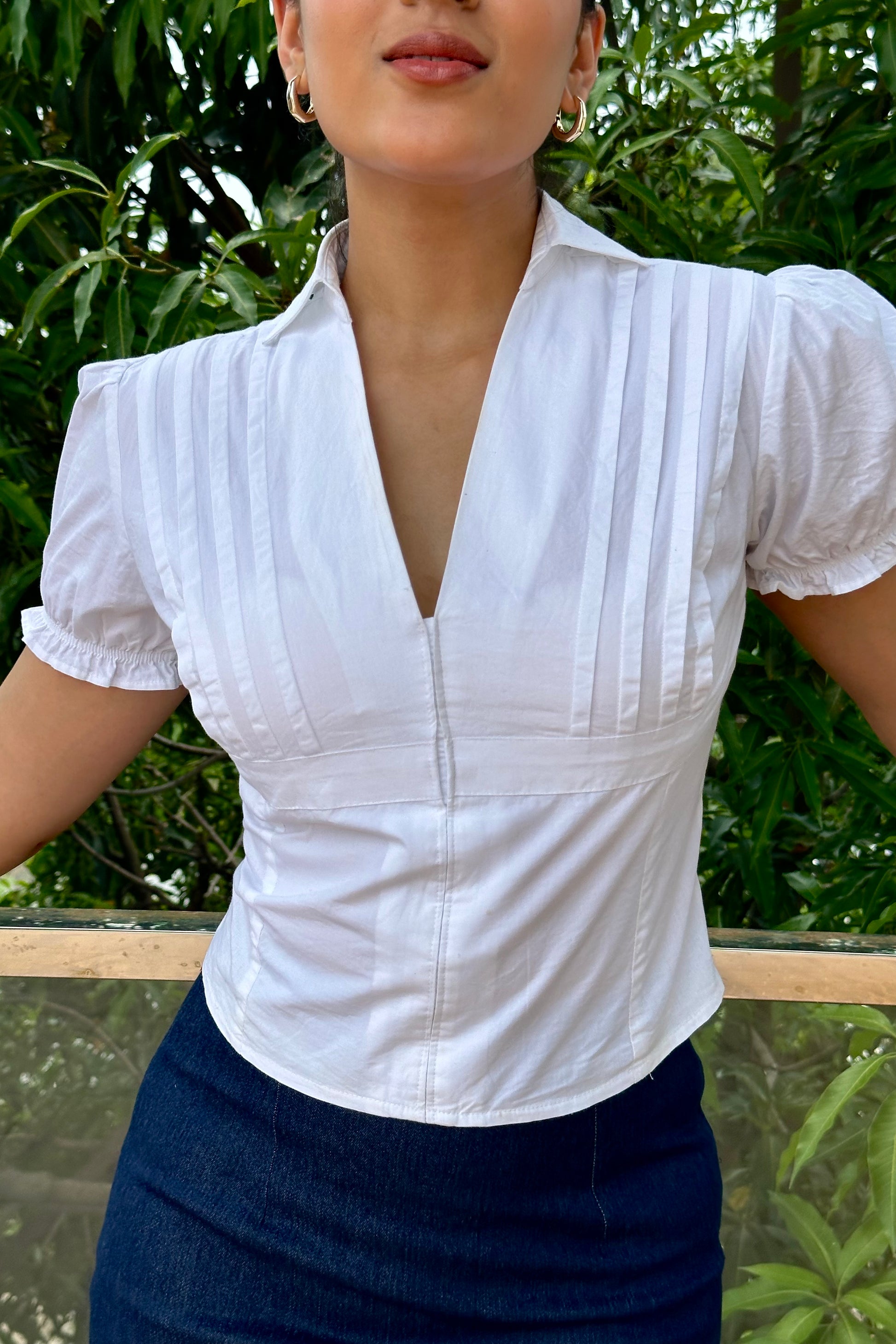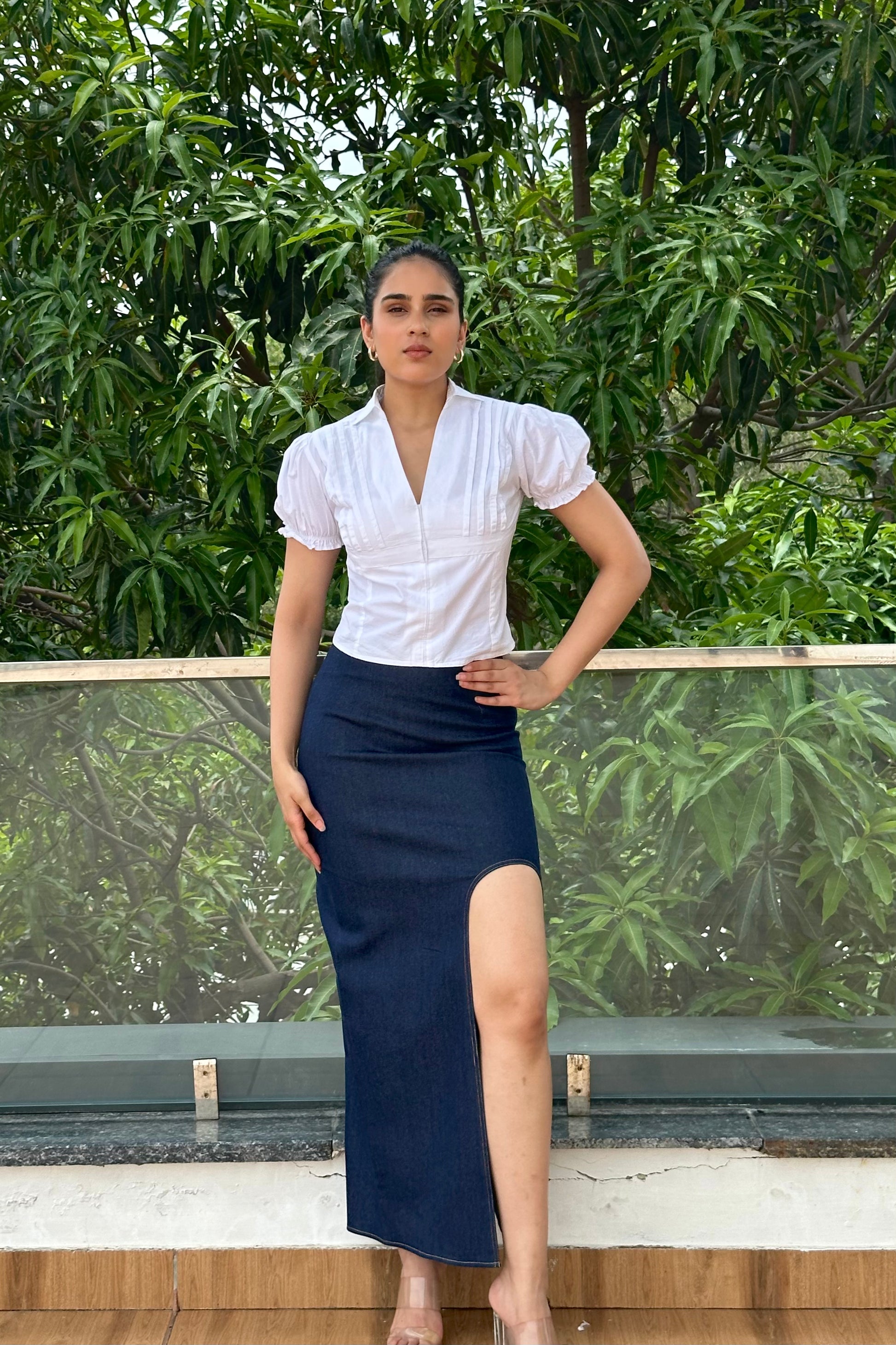 Introducing our Modern Muse Set — a sophisticated pairing designed to elevate your everyday style. The crisp white blouse features structured pintuck detailing, a smart collar, and soft puff sleeves that create a refined yet feminine silhouette. Paired with a sleek, high-waisted denim maxi skirt, this look balances classic tailoring with a contemporary edge. The bold front slit adds just the right amount of allure and ease of movement. Perfect for work meetings, brunches, or evenings out, this set transitions effortlessly from day to night. Style it with statement heels and minimal jewelry for a polished finish.