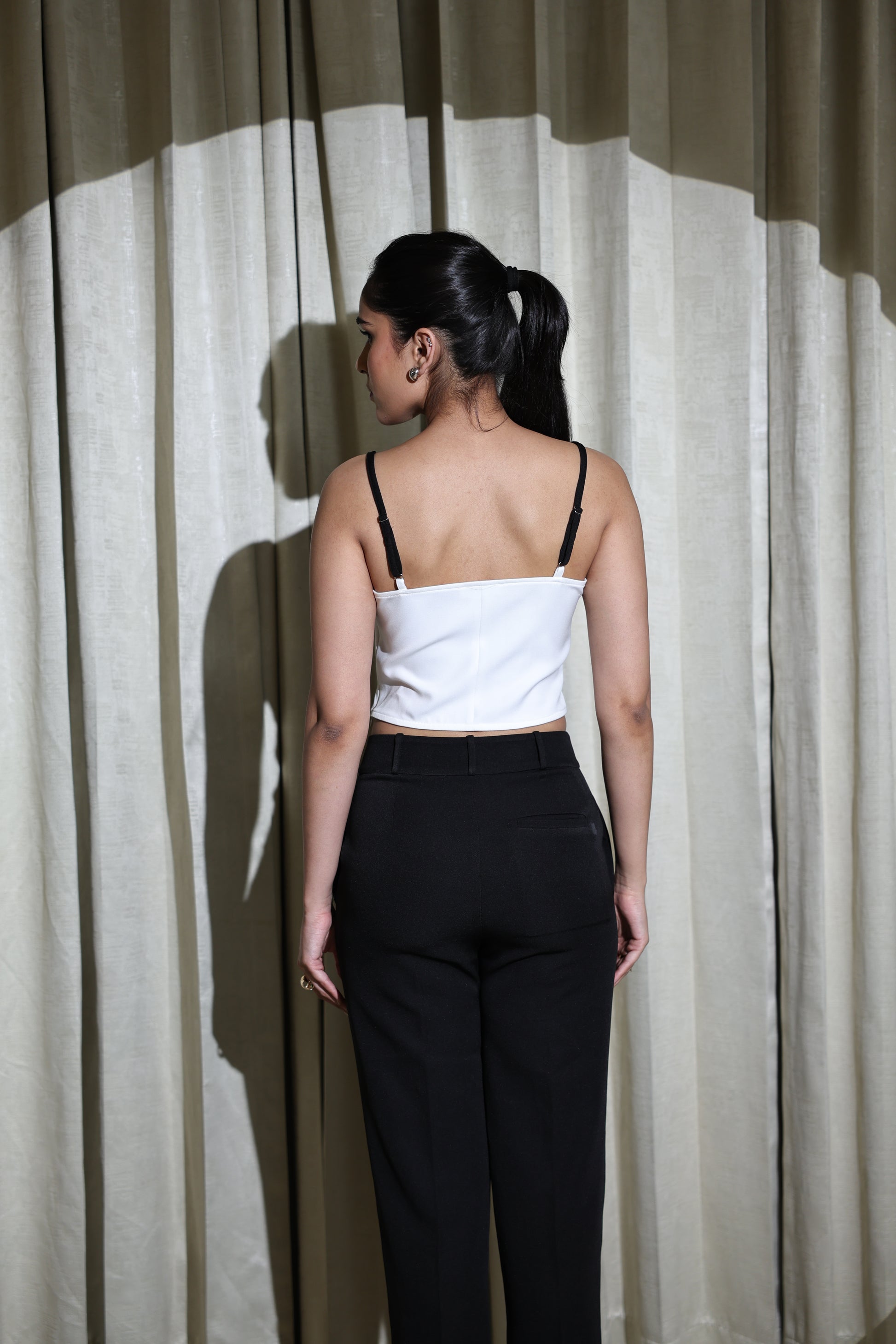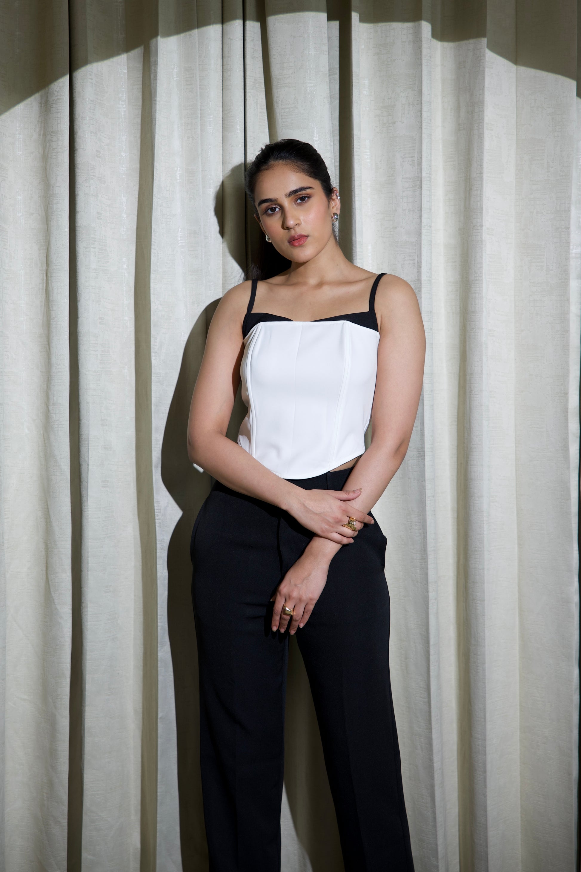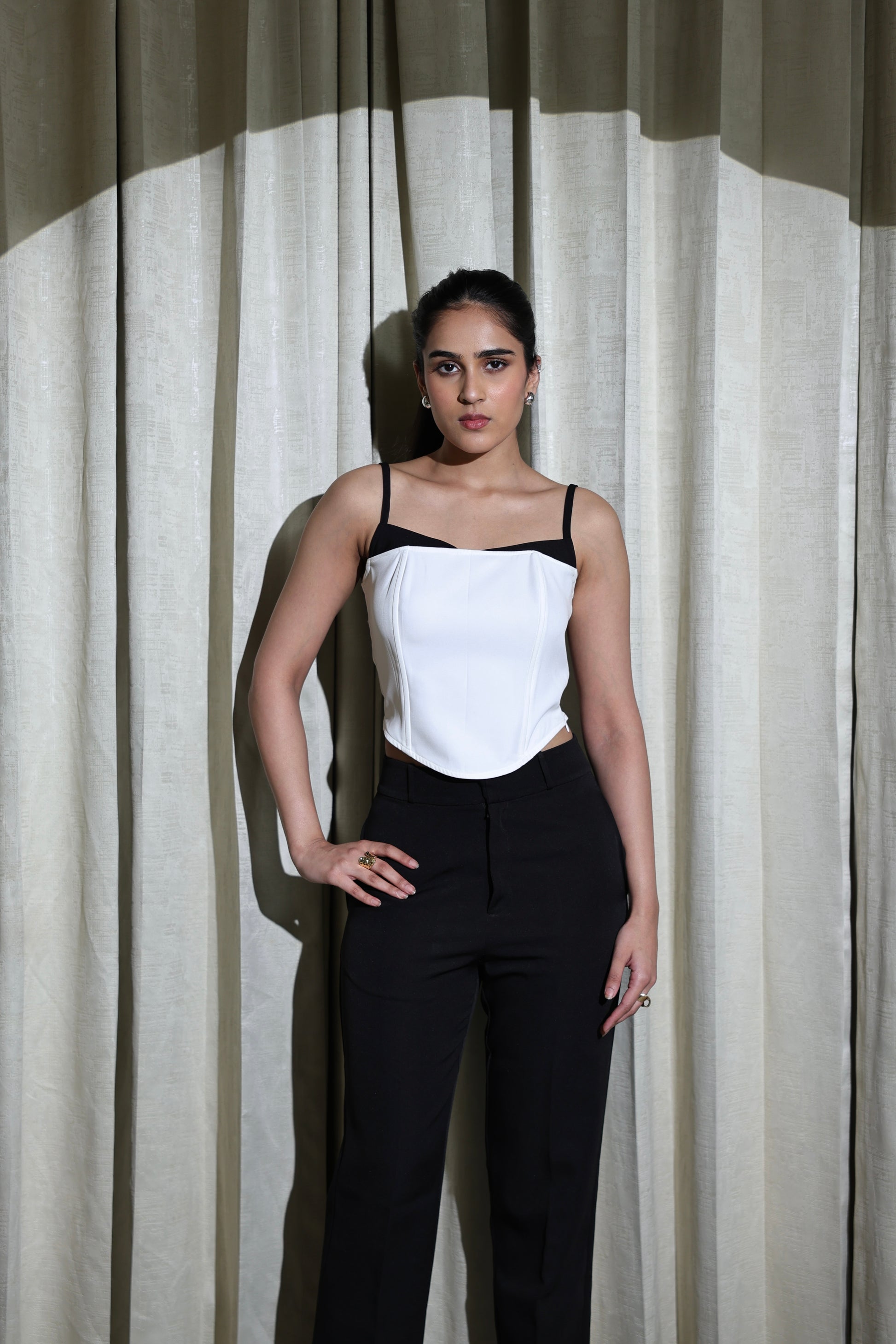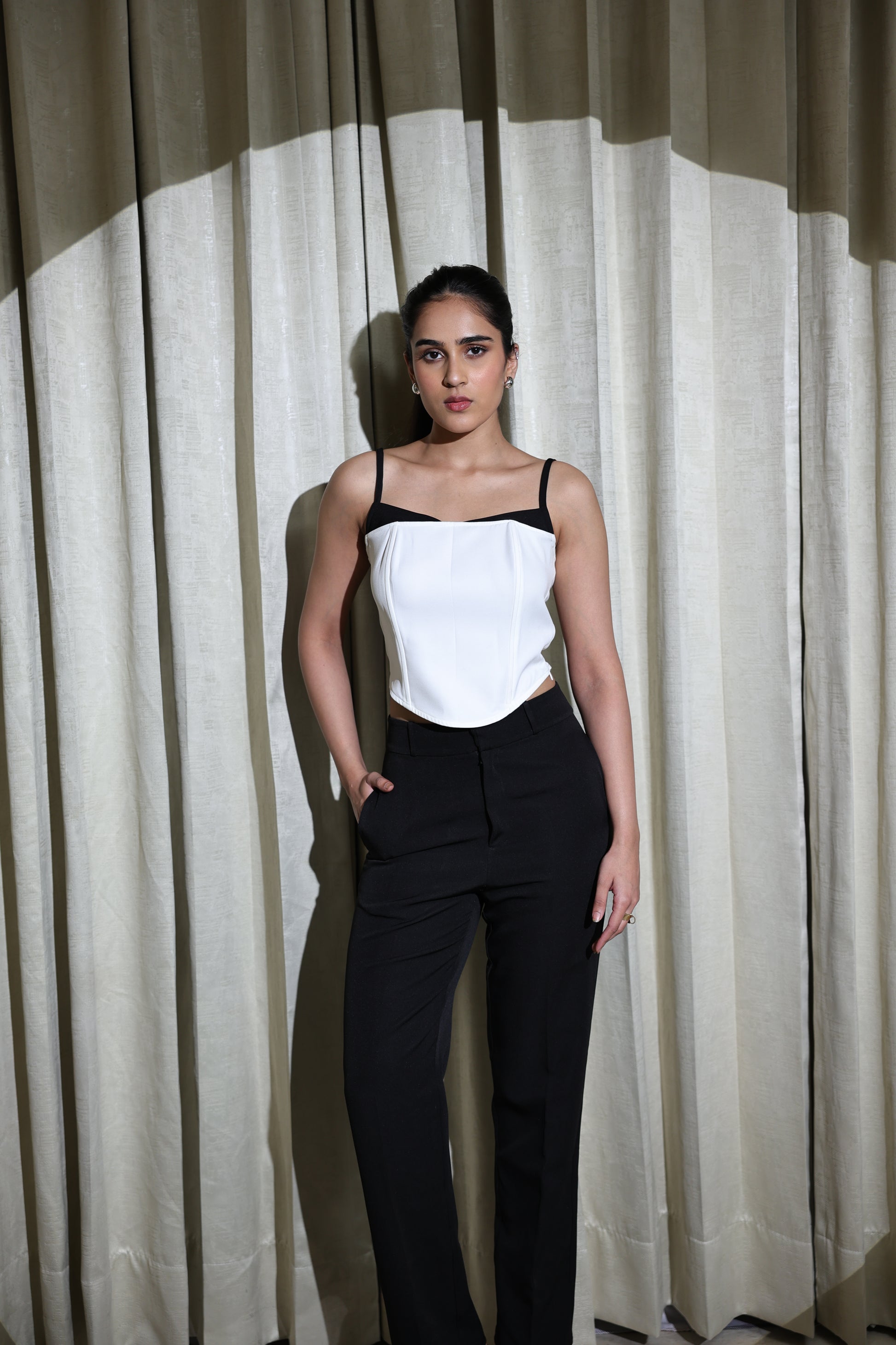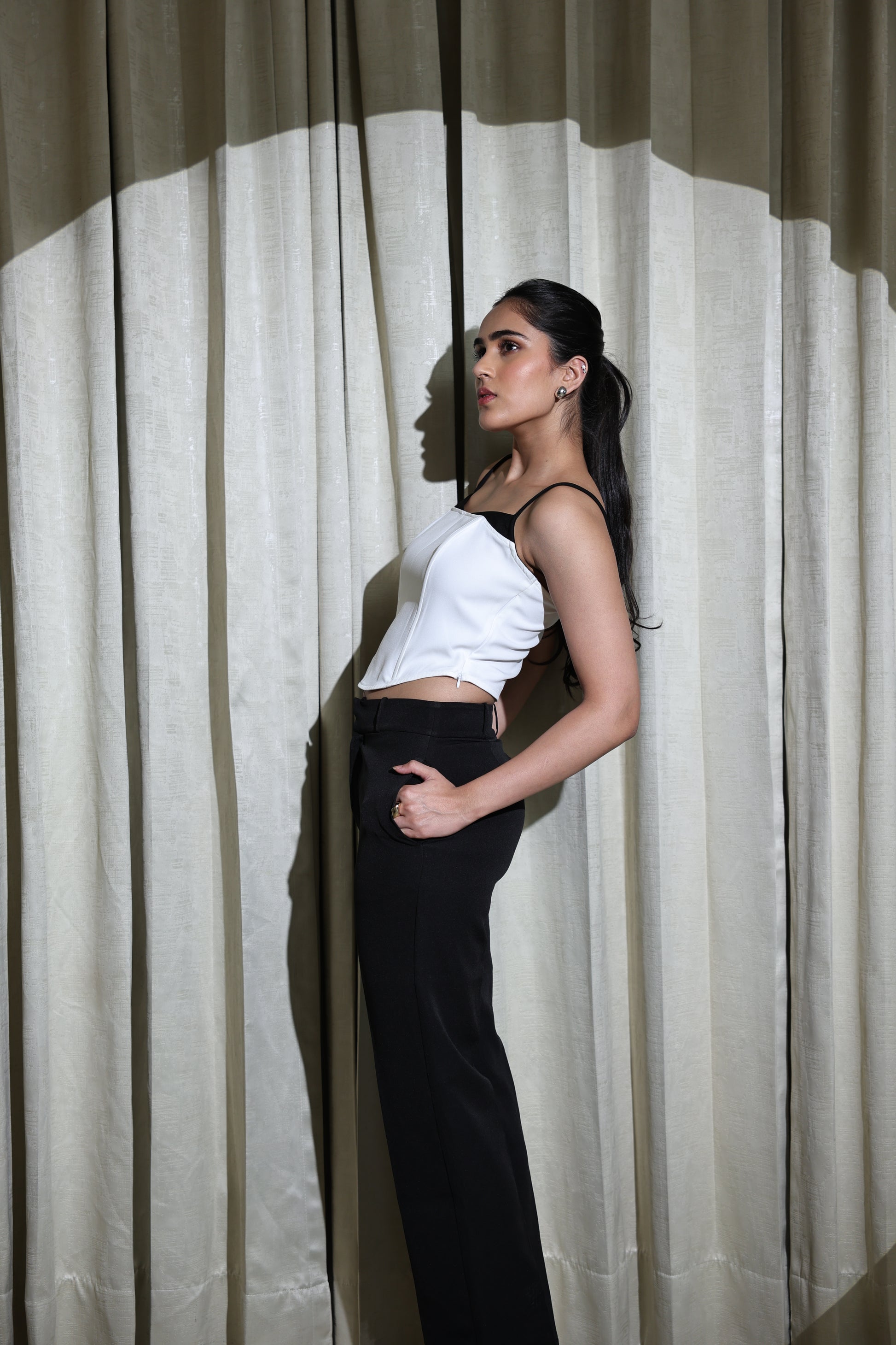 A sleek and modern co-ord set crafted from heavy banana crepe fabric, offering structure, comfort, and a premium finish. The set includes a sharply tailored white corset-style top paired with black straight-fit pants, creating a timeless monochrome look. The top features a contoured hem, supportive panel detailing, and contrasting black straps for added definition. The trousers come with a polished fit and side pockets for ease and functionality. Perfect for dinners, formal outings, and elevated everyday wear.