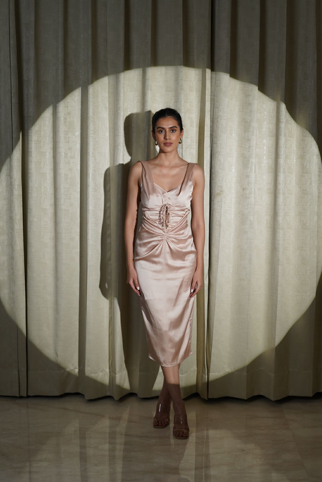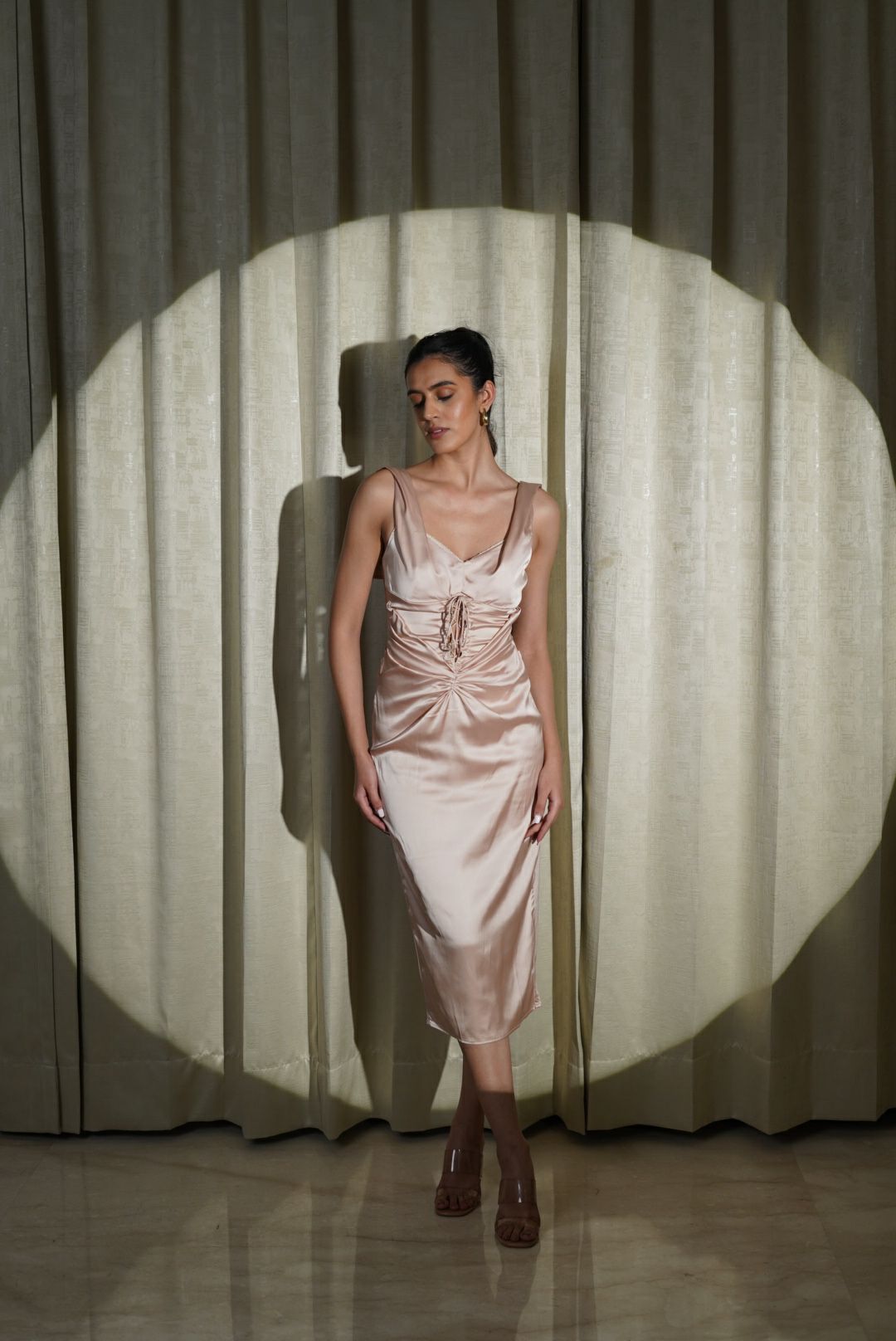 MOONLIT MUSE - HANDCRAFTED FROM LUXURIOUS BEIGE SATIN DRESS