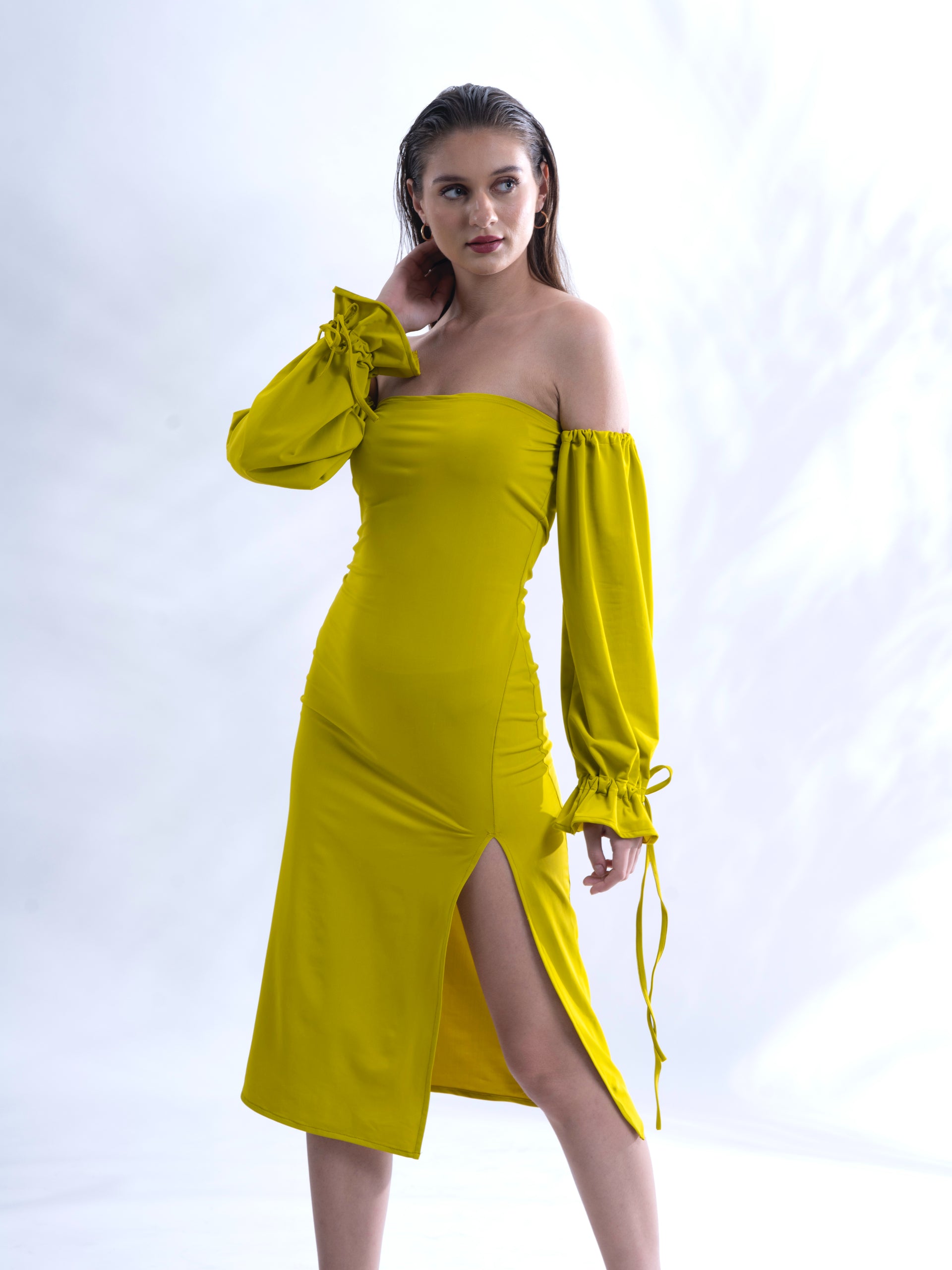 This striking lime bodycon dress is handcrafted from premium lycra fabric, offering a sleek, figure-hugging silhouette. Designed with a chic calf-length hem and a bold slit, it also features detachable sleeves for versatile styling—perfect for making a statement with ease and elegance.