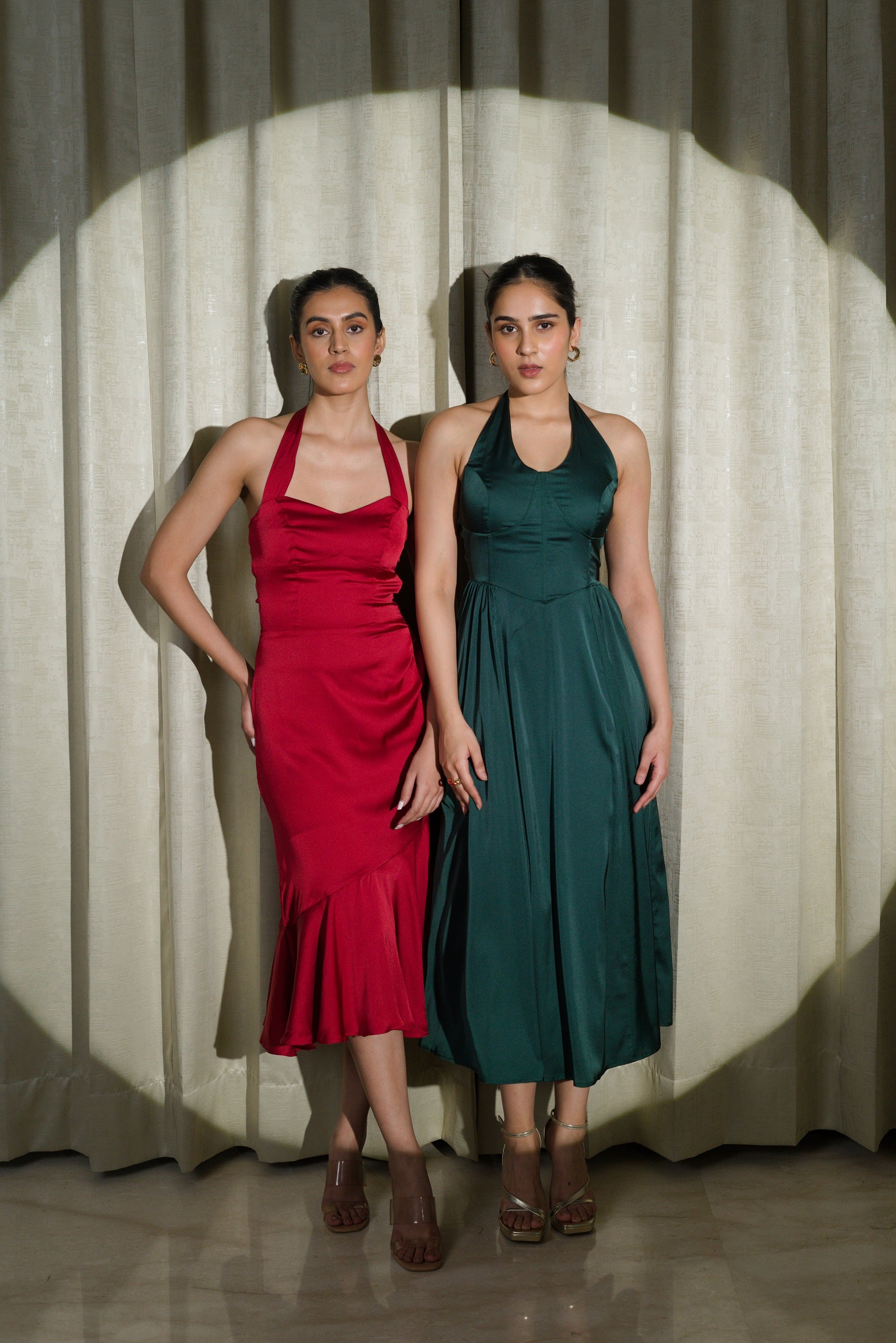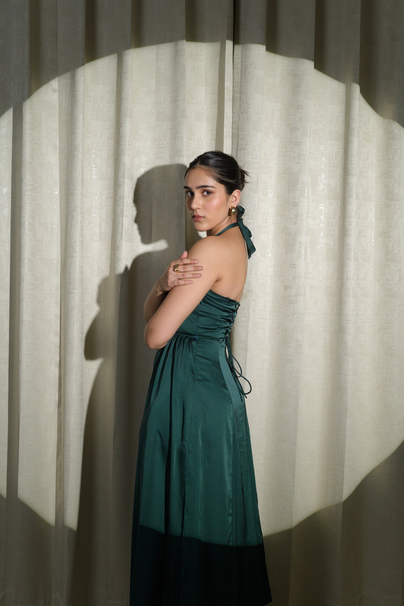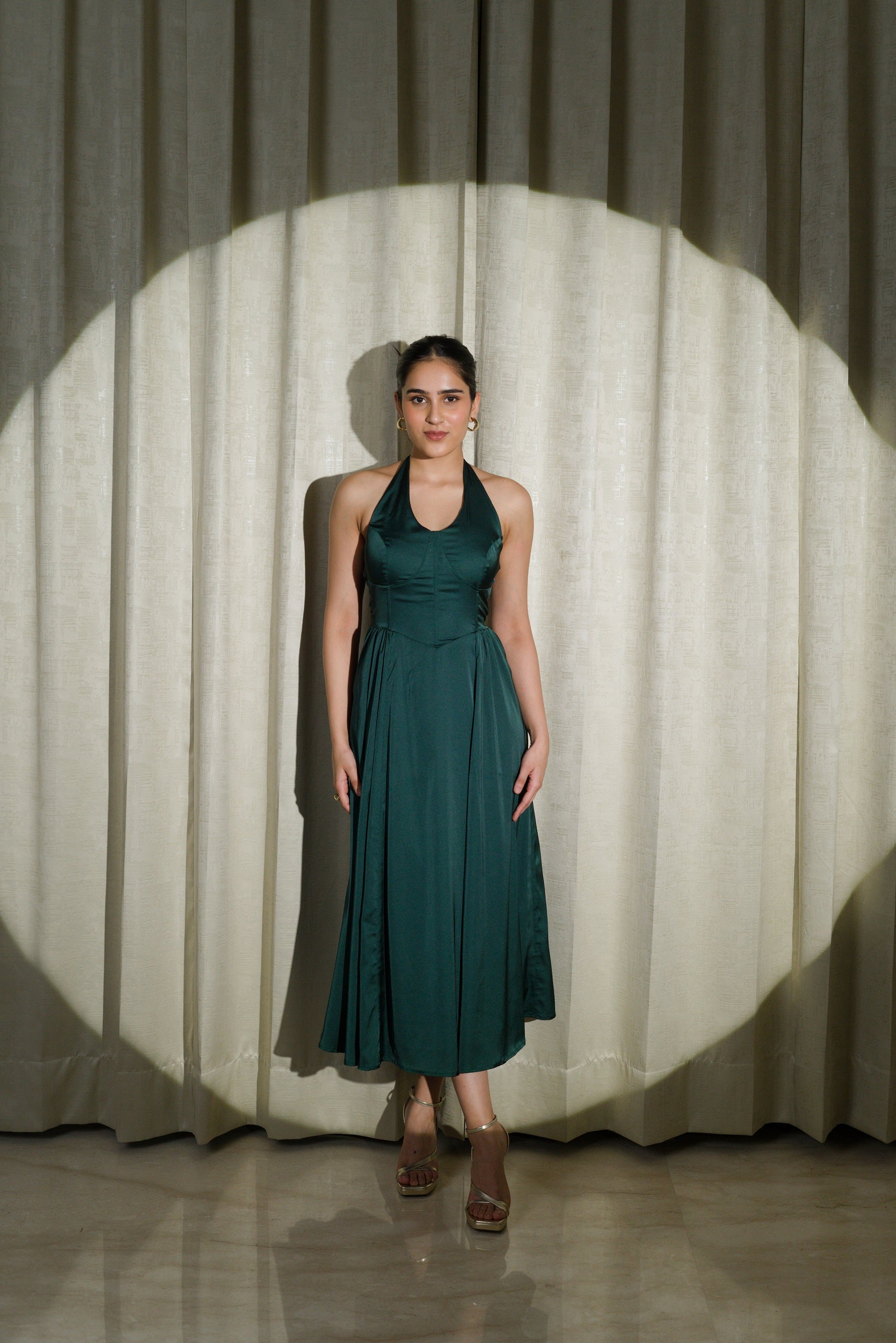 This handcrafted dress exudes elegance and charm, made from luxurious dark green satin fabric that offers a smooth and lustrous finish. The design features boning detailing on the front, providing structure and a flattering shape, while the self-tie halter neckline adds a touch of femininity and adjustability. The gathered, flared bottom enhances the flow and movement of the dress, creating a graceful silhouette that falls to a sophisticated calf length. A self-tie back detail adds a hint of romance and customisation to the fit, complemented by a concealed zipper on the side for a seamless and polished look. This dress is perfect for formal occasions, evening events, or any setting where timeless sophistication is key.