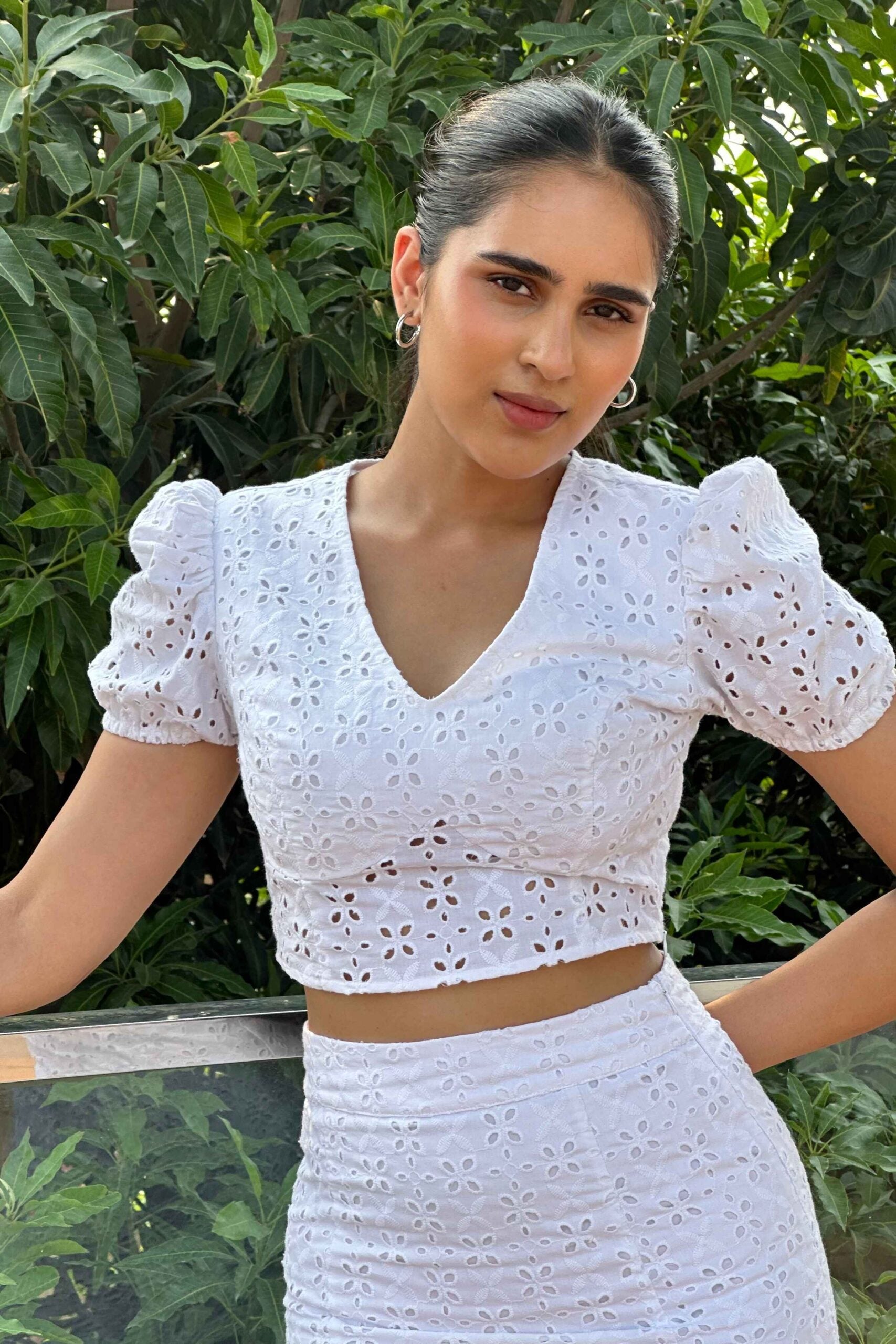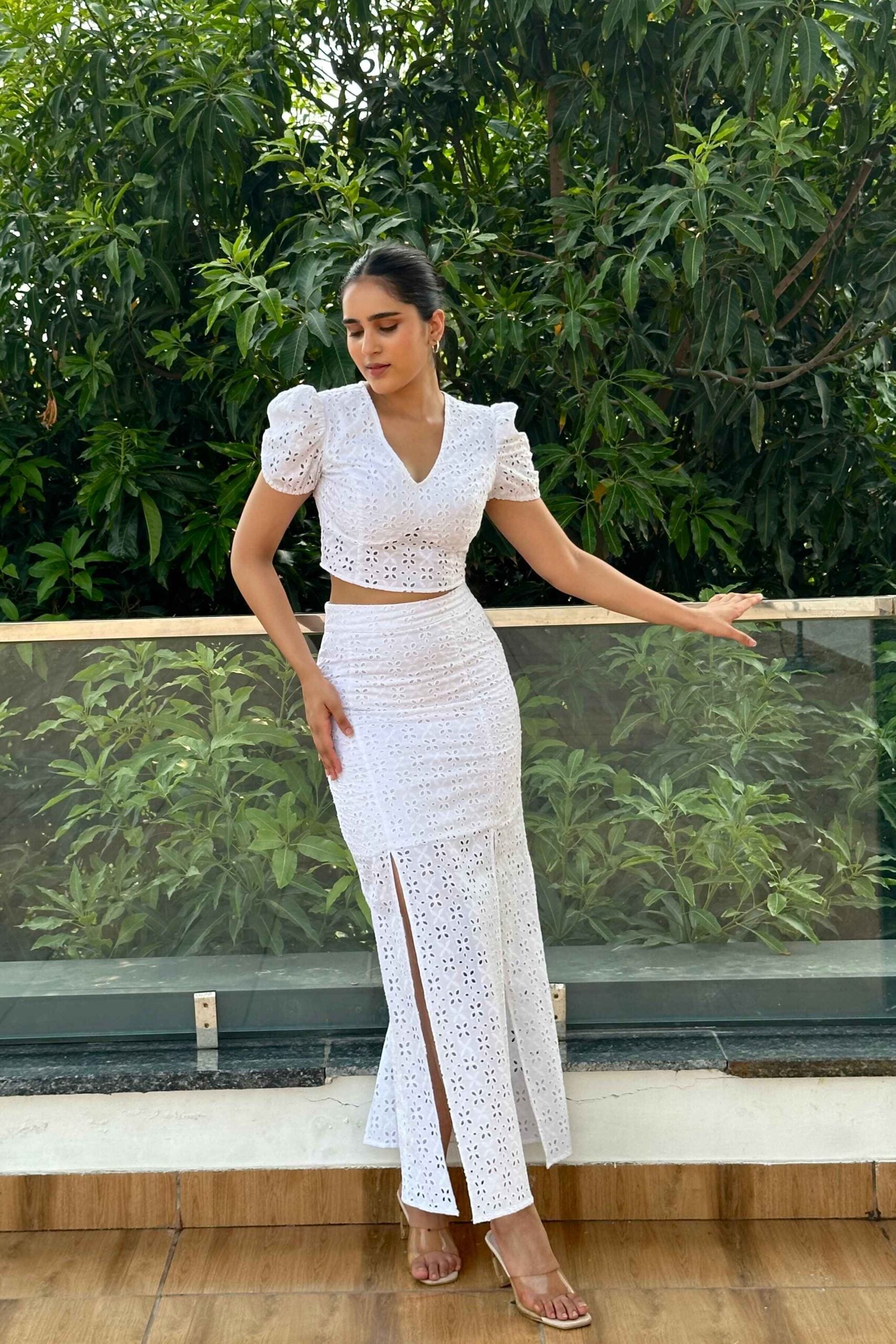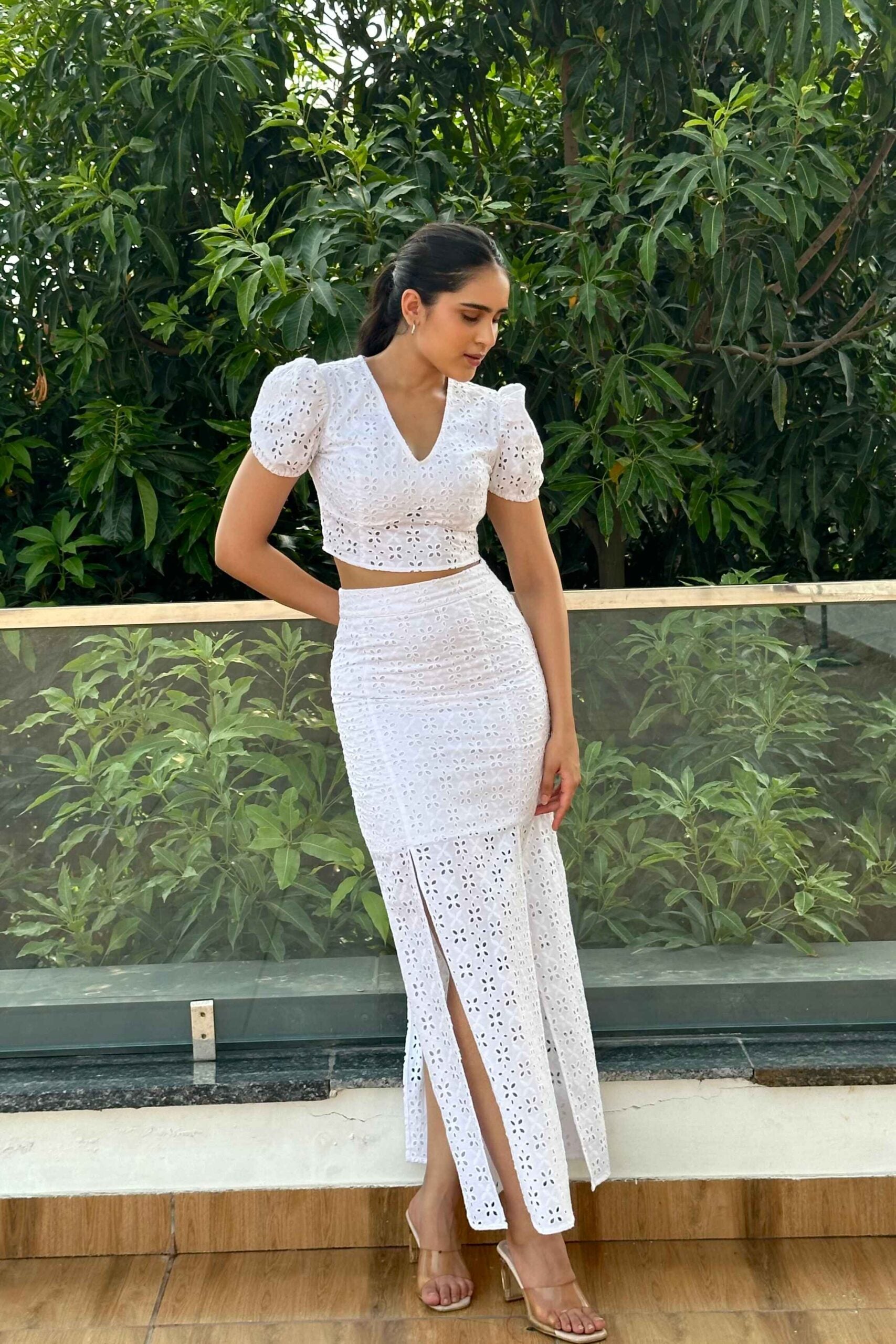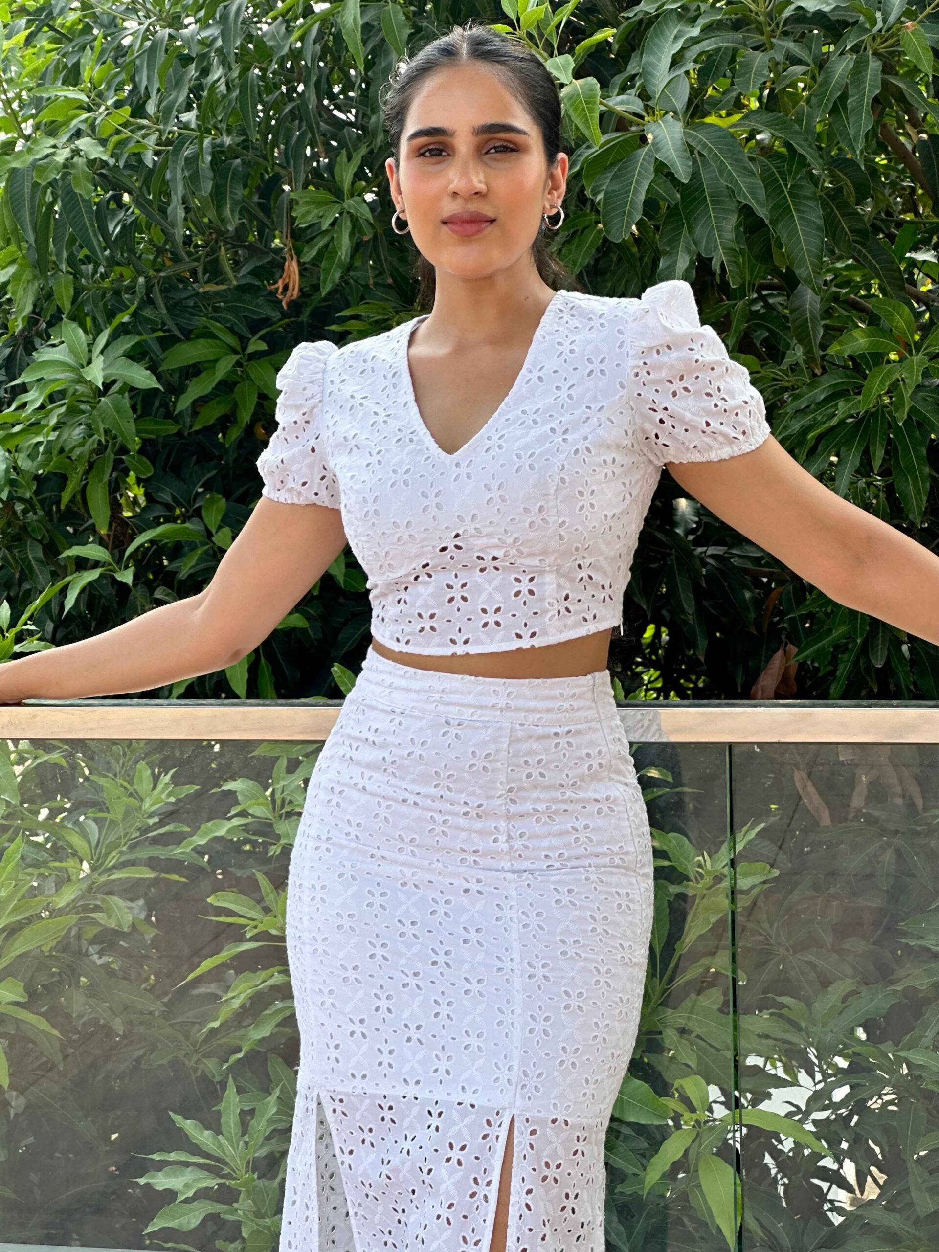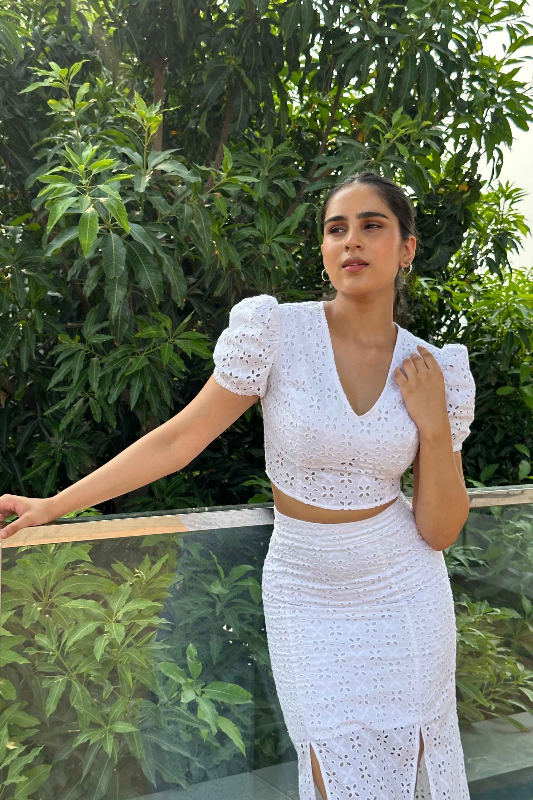 This elegant white co-ord set is handcrafted from 100% cotton schiffli fabric and fully lined with soft crepe for all-day comfort. It features a puff-sleeve top with elastic detailing and a cutout skirt, both finished with concealed side zippers for a seamless look. Thoughtfully handmade in India, each piece can also be styled separately for versatile, effortless charm.