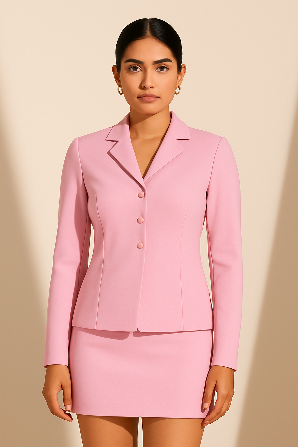 The pastel pink hue adds a touch of elegance and charm, making it perfect for both formal occasions and polished daywear. With its minimalist design and refined tailoring, this set embodies effortless power dressing.