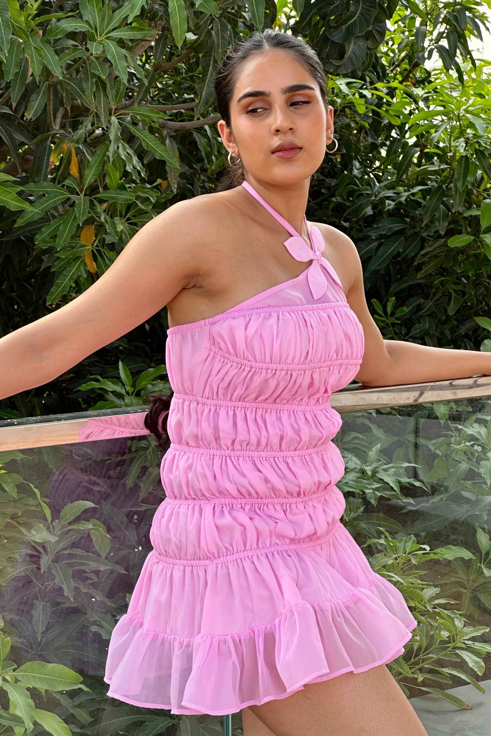 This charming baby pink short dress is handcrafted from premium georgette fabric and fully lined with soft crepe for comfort. Featuring delicate handmade flower detailing at the neck, it includes a self-tie neckline, front pleated accents, and all-over elastic detailing for a flattering, feminine silhouette. Effortlessly romantic and perfect for special moments.