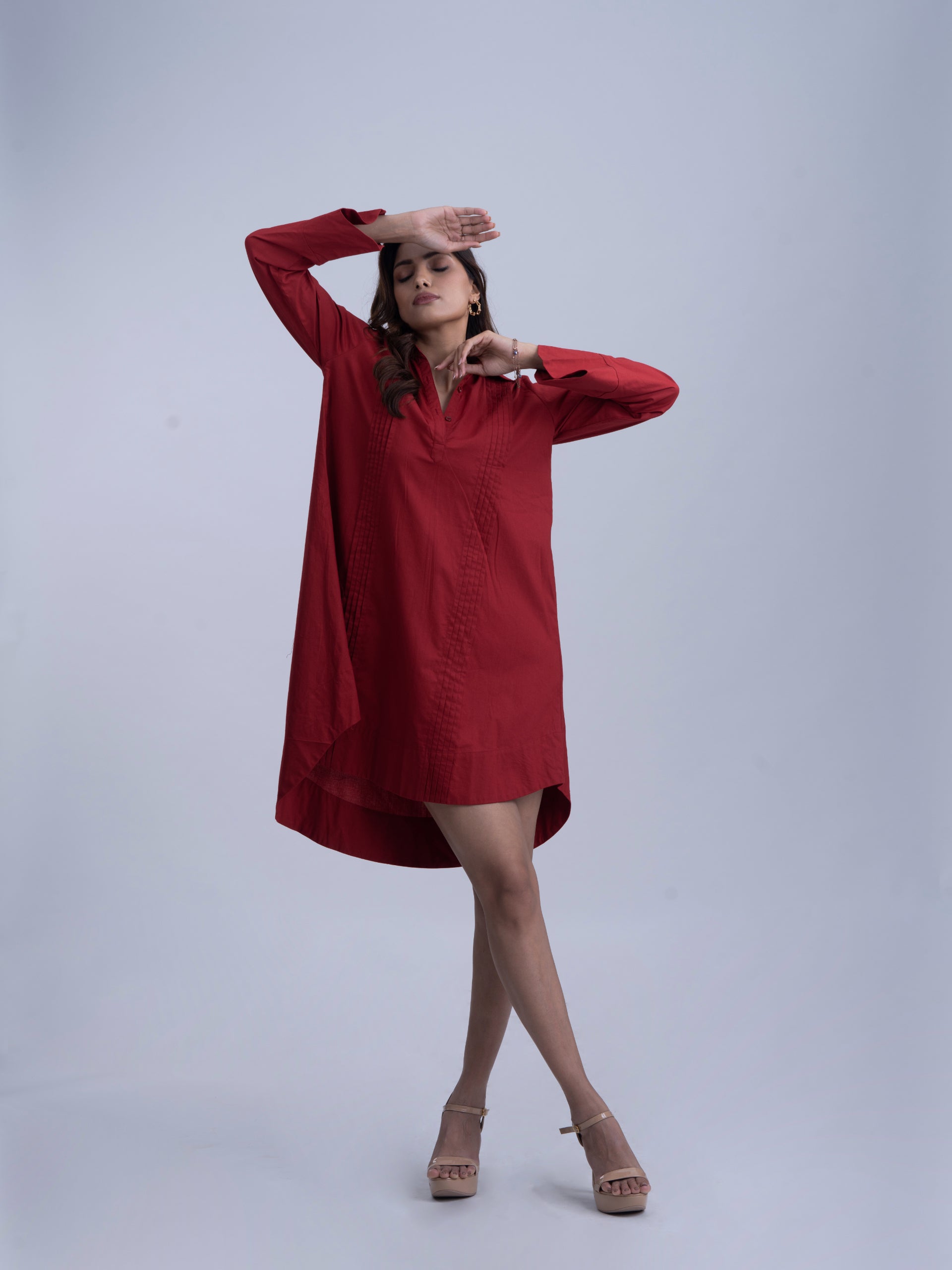This maroon skirt dress is crafted from 100% cotton fabric, offering breathable comfort with timeless style. It features long sleeves, front buttons with a classic collar, and elegant pleated detailing. Designed to fall above the knee, it's perfect for a polished yet effortless look.