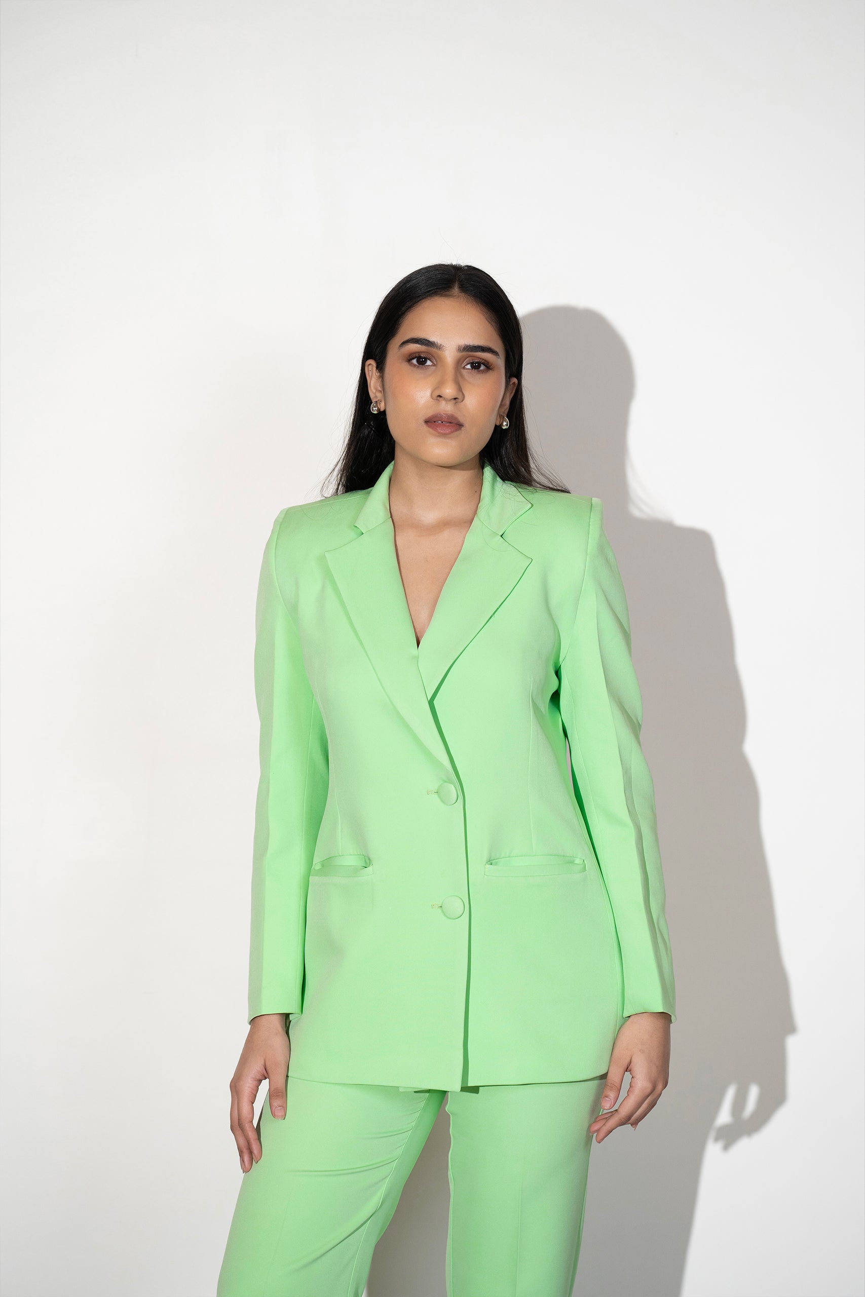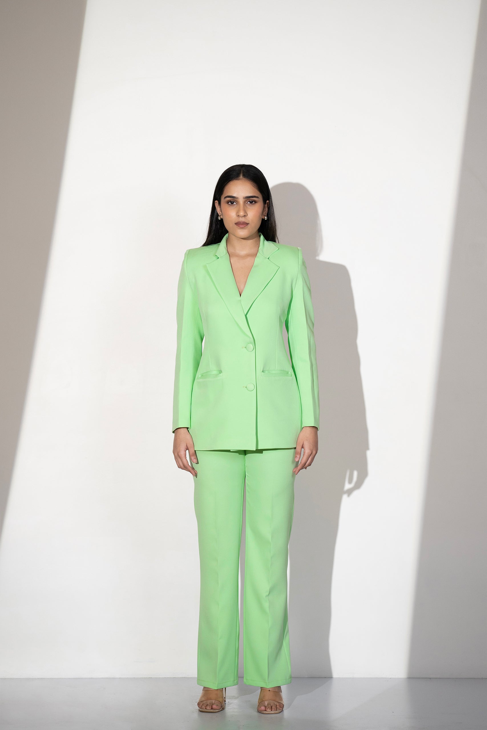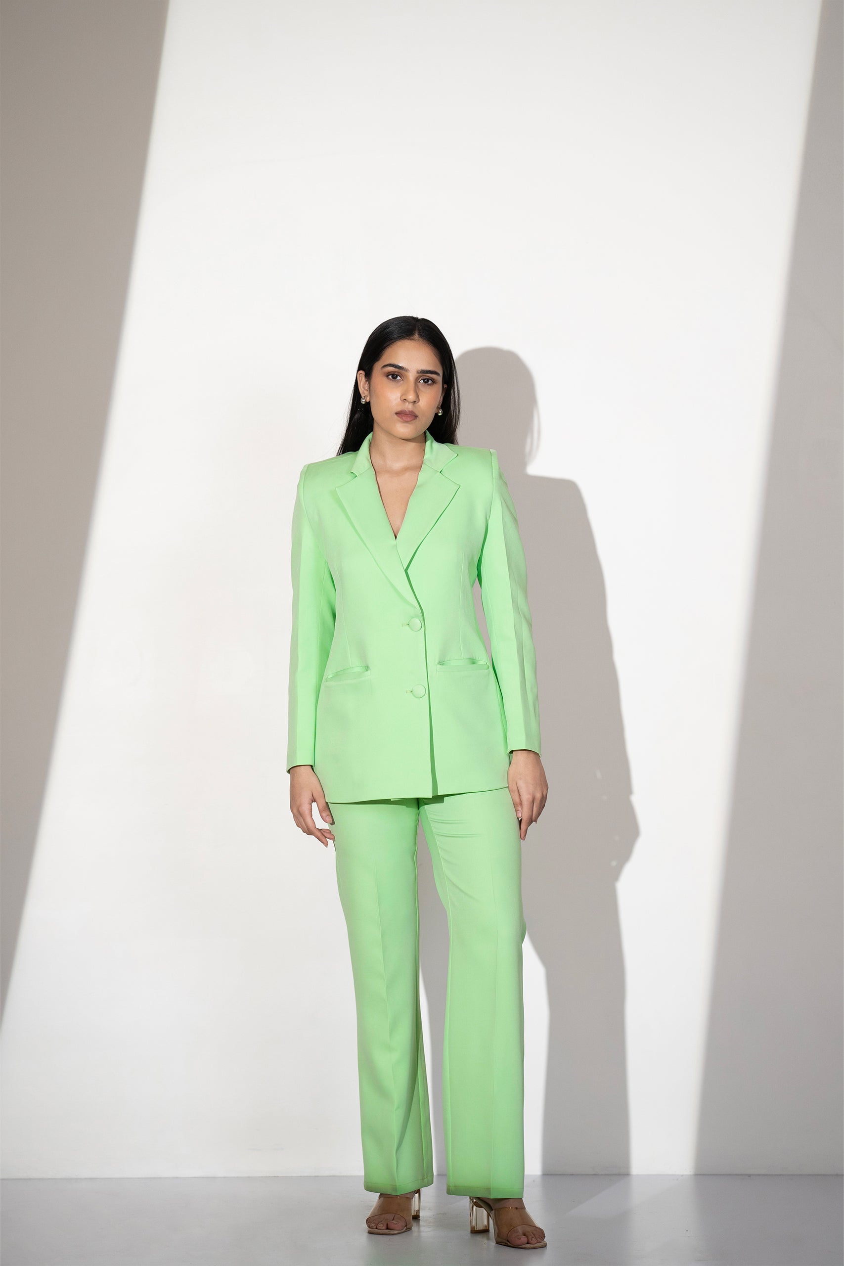 This sophisticated pantsuit, handcrafted with heavy crepe fabric in a striking green hue, is a bold and elegant ensemble that radiates modernity and refinement. The set includes a double-breasted blazer and straight-cut pants, thoughtfully designed for a polished and tailored look. The blazer is fully lined with luxurious satin, offering a smooth and comfortable finish. It features classic notch lapels and a double-breasted front, accentuated with same-fabric buttons for a cohesive and seamless appearance. Flap welt front pockets enhance the blazer’s functionality while adding a touch of sophistication. The straight-cut pants are expertly tailored, with a high-rise waist that creates a flattering silhouette. Practical side pockets and belt loops provide versatility and convenience, while a premium same-color zipper ensures a streamlined and polished finish. Ideal for formal occasions, professional settings, or events where a touch of elegance is required, this green pantsuit is a standout addition to any wardrobe.