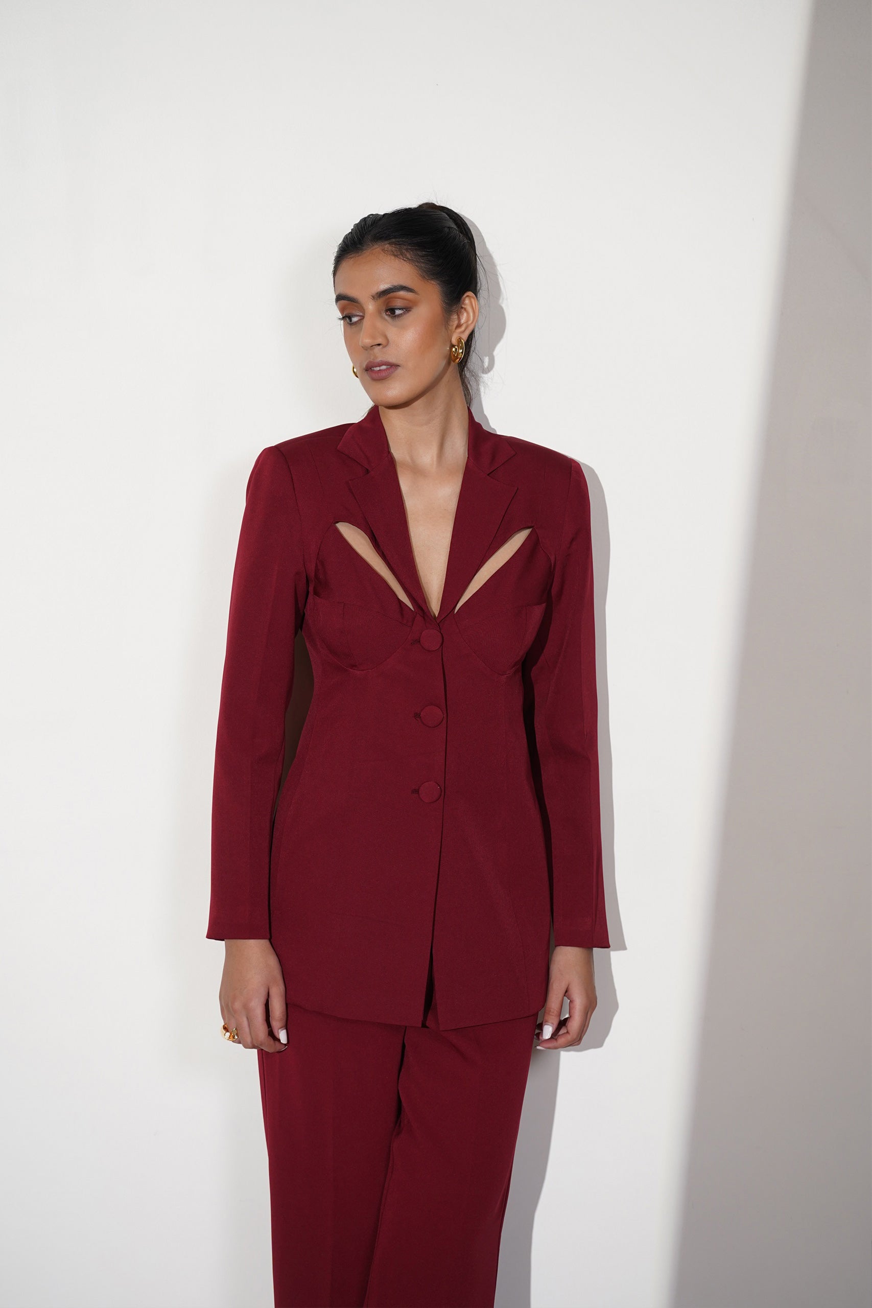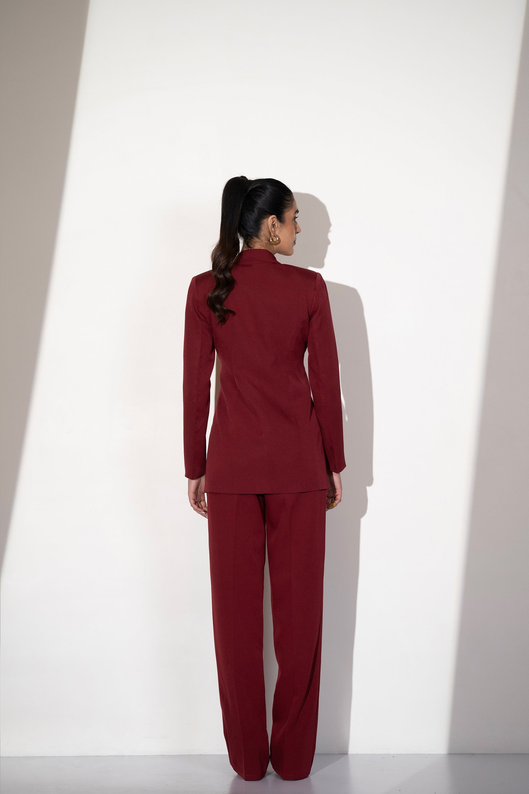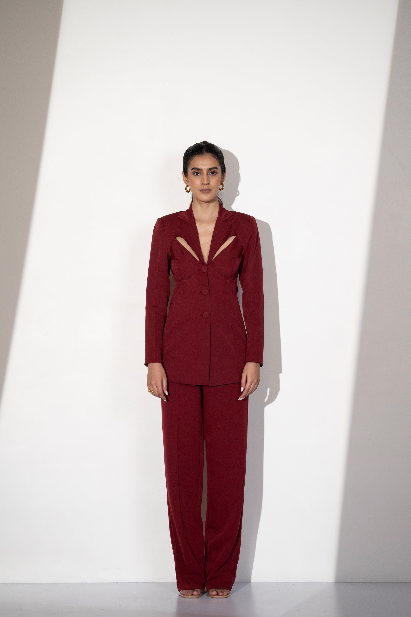 This elegant pantsuit, handcrafted with premium heavy crepe fabric in a striking maroon color, seamlessly blends sophistication with contemporary design. The set features a tailored blazer with unique cutout detailing and straight-cut pants for a sleek, polished look. The blazer is fully lined with luxurious satin, offering a refined finish, and showcases classic notch lapels, same-fabric buttons at the front, and flap welt front pockets that add functionality and style. The bold cutout detailing elevates the traditional design, making it modern and eye-catching. Complementing the blazer, the straight-cut pants feature a high-rise waist for a flattering silhouette, functional side pockets, belt loops for added versatility, and a premium same-color zipper for a cohesive and streamlined finish. Perfect for formal occasions or professional settings, this maroon pantsuit exudes timeless elegance with a touch of modern flair.