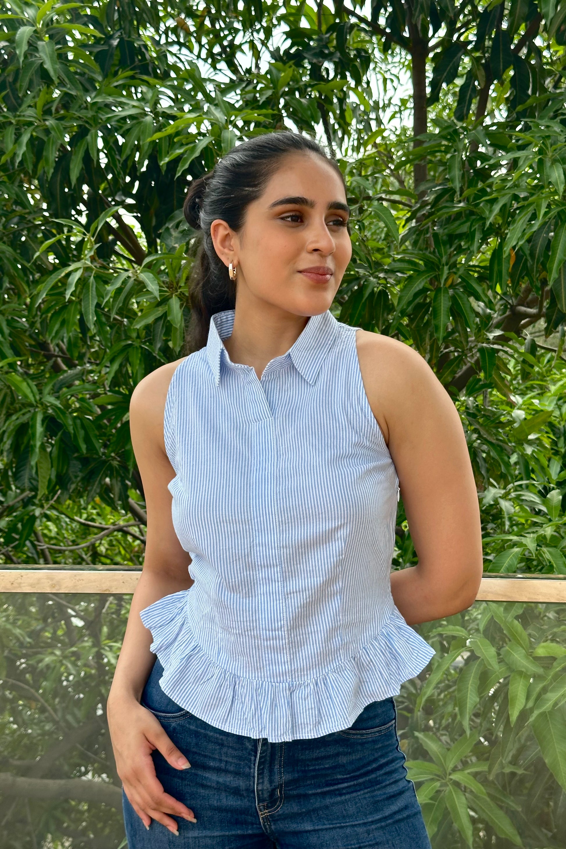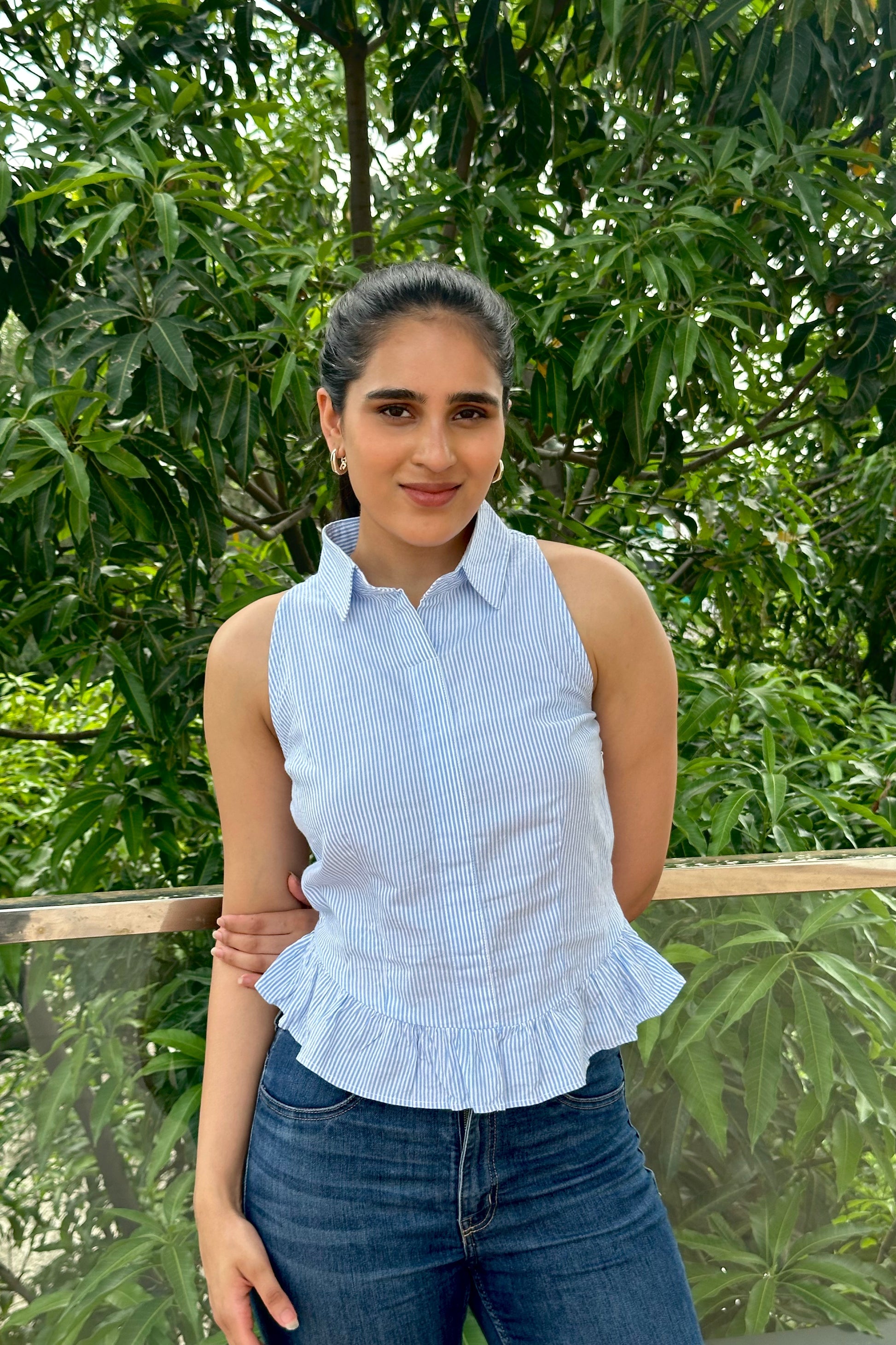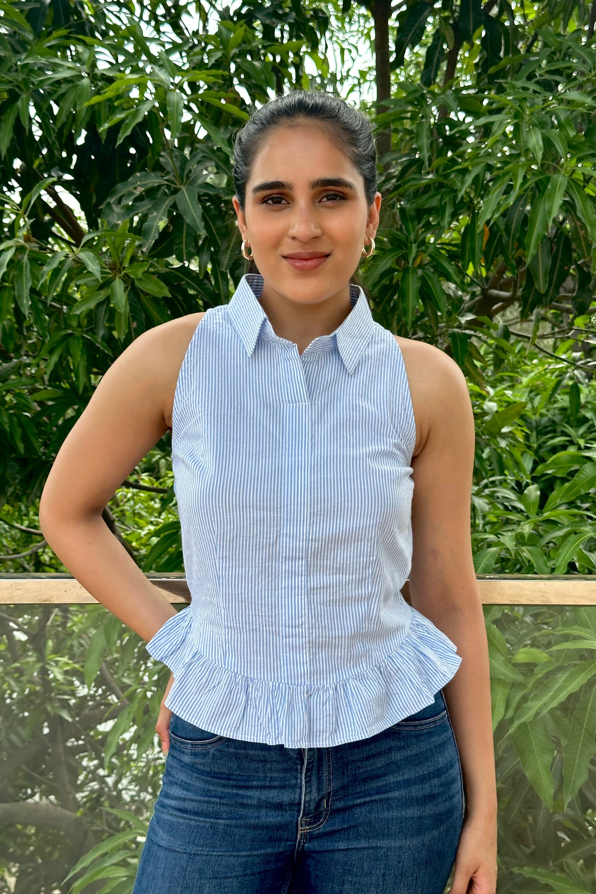 This halter neck top is crafted from lightweight cotton with blue and white vertical stripes, offering a fresh and breezy feel. It features a halter neckline complemented by a classic shirt collar detail, blending casual and tailored elements effortlessly. The front showcases a button-down placket look that adds a polished touch to the design. Cut in a slim, figure-skimming silhouette, the top flatters the shape while maintaining comfort. The softly ruffled hem creates a playful and feminine finish, while the open shoulders and back highlight the signature halter style. Perfect for summer outings or layered looks, this piece combines casual charm with chic sophistication.
