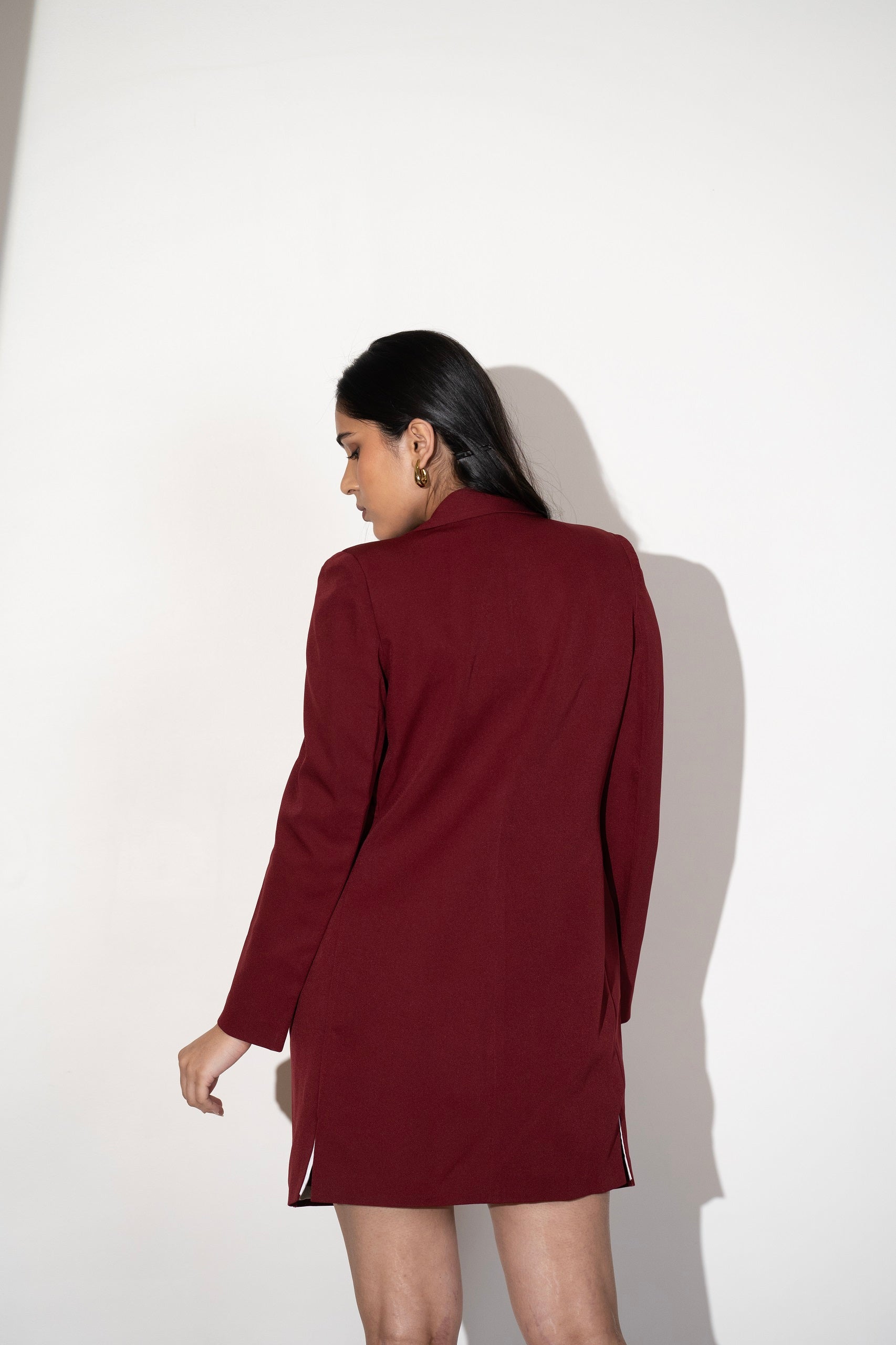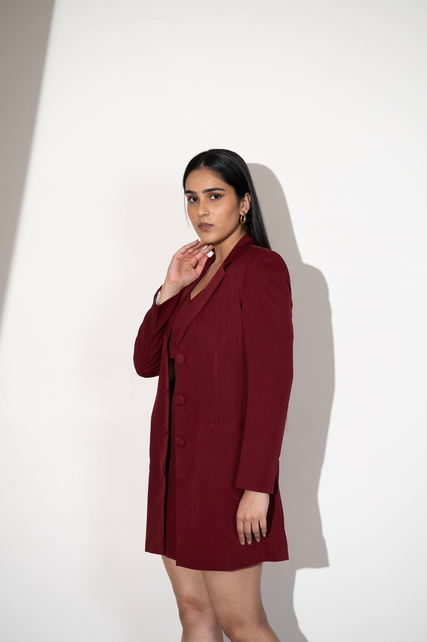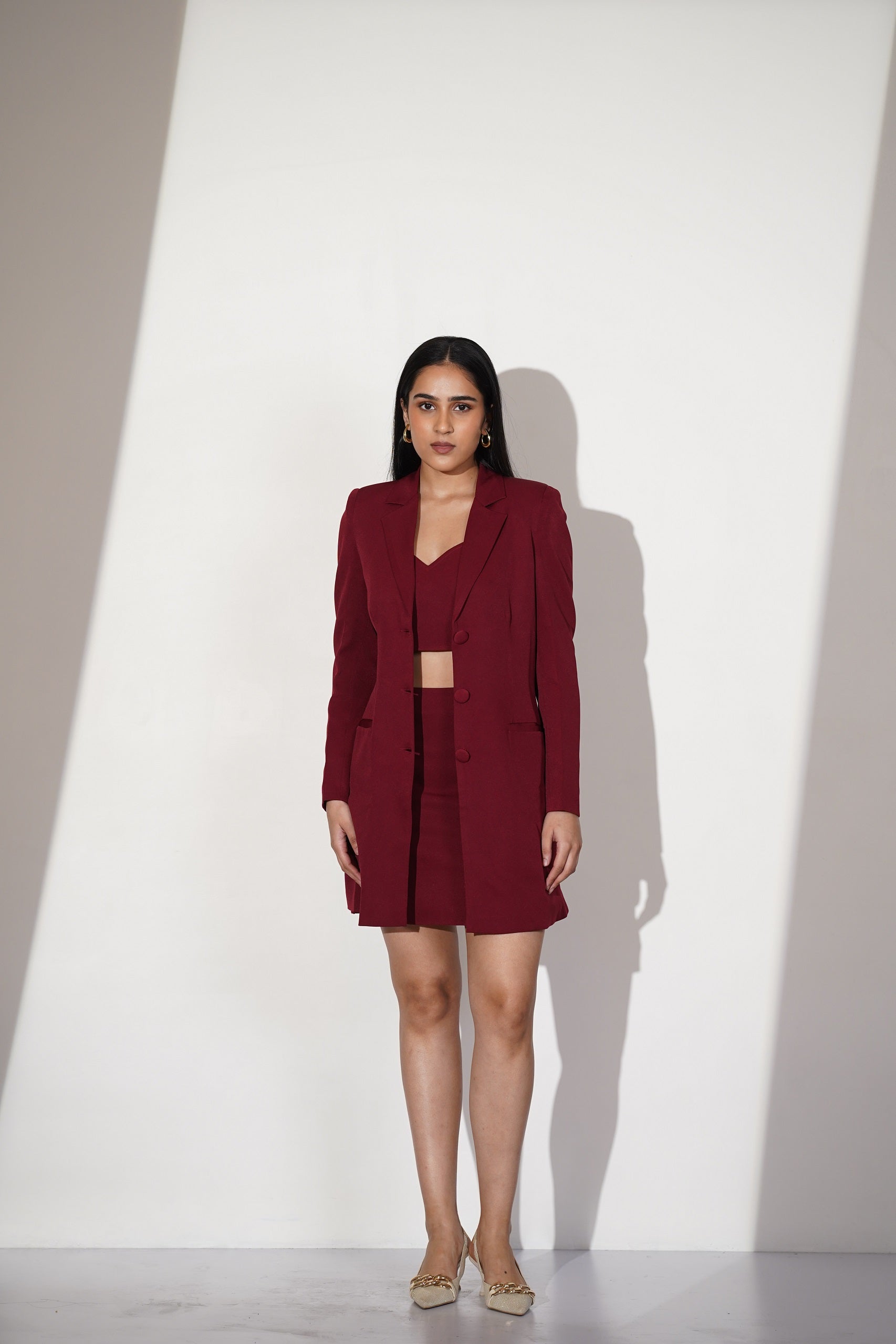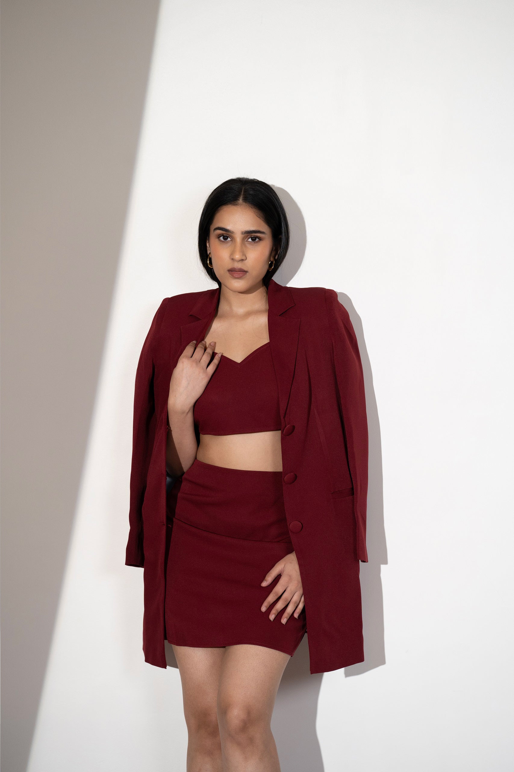 This sophisticated coord set, crafted from premium heavy crepe fabric in a deep maroon hue, is designed to make a bold yet elegant statement. The ensemble features a long blazer, a crop top with adjustable straps, and a short skirt, blending modern design with timeless tailoring.
