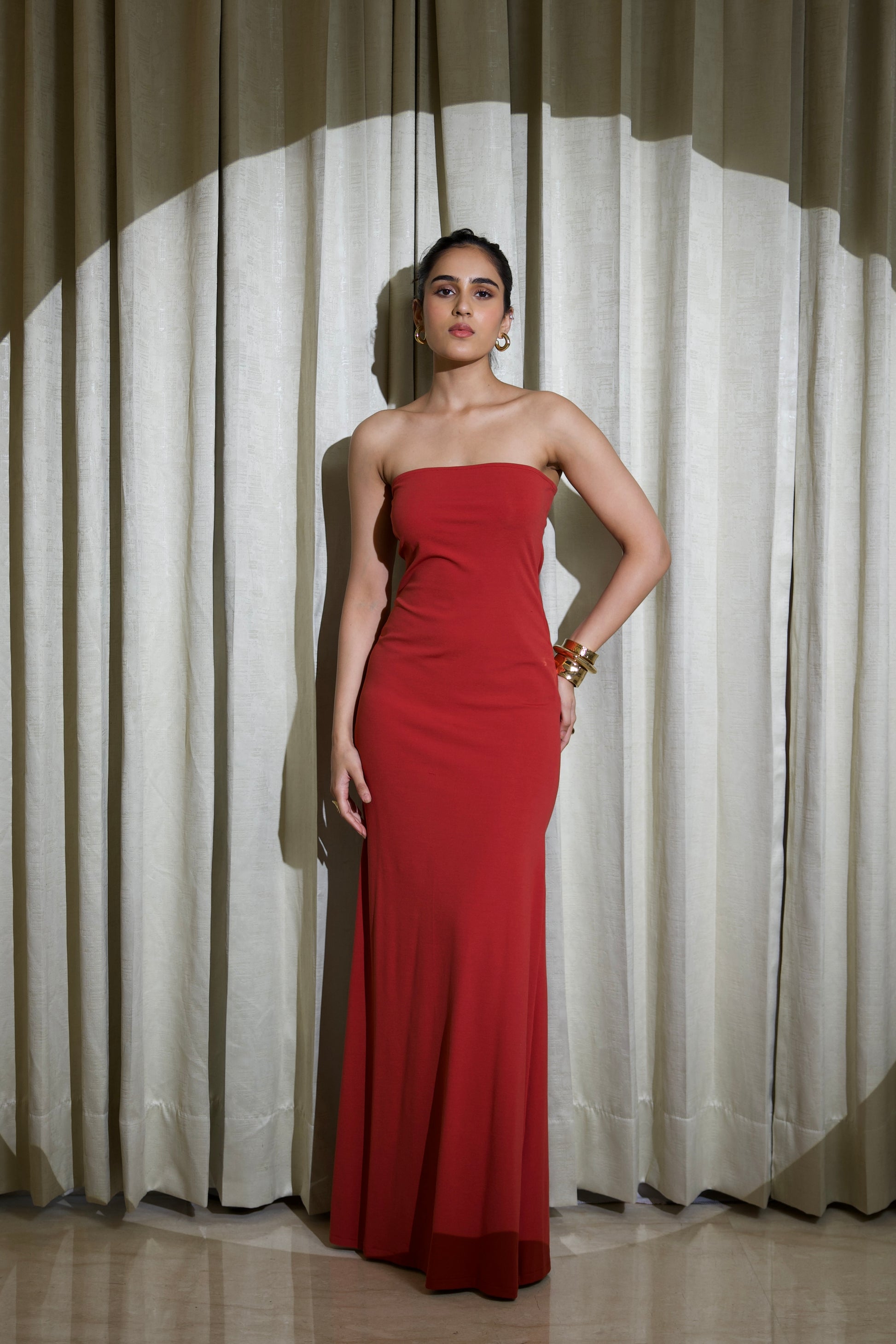This versatile and elegant dress is crafted from soft, stretchable lycra fabric that beautifully contours the body, creating a smooth and flattering silhouette. Designed in a rich, warm red tone, the dress features a clean strapless neckline that highlights the collarbone and shoulders for a timelessly refined look. Adding to its charm is a matching lycra shrug that can be worn or removed depending on the mood. The shrug is styled with a gathered twist detail at the center, creating a sculpted drape across the shoulders and offering two distinct looks in one outfit.