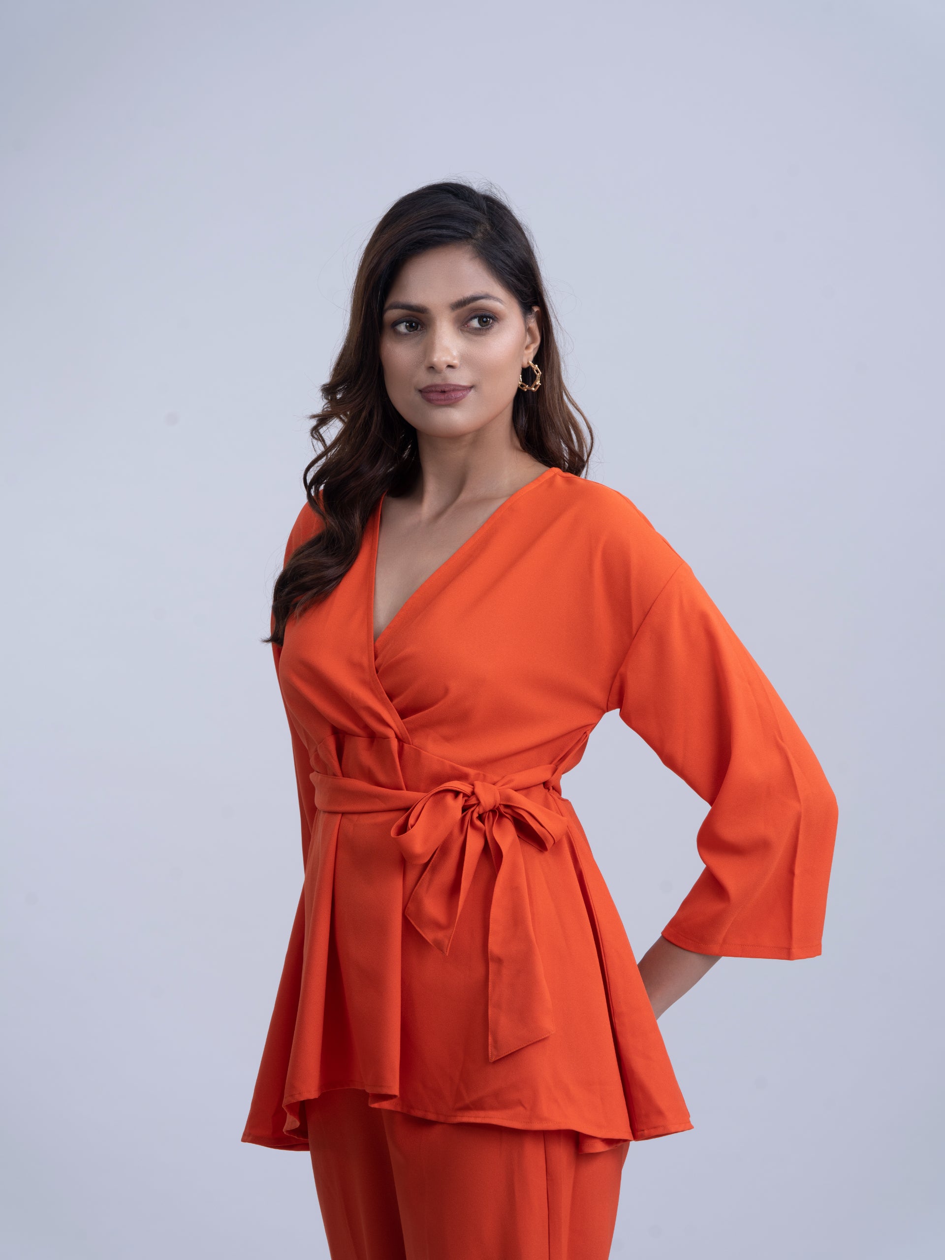 Radiate effortless charm in this striking orange co-ord set, exquisitely tailored from soft moss crepe fabric. The top showcases a flattering V-neckline with a graceful tie-up design and a coordinating self-tie belt for a cinched silhouette. Paired with sleek straight-leg pants featuring an elasticated waistband, this ensemble combines elevated elegance with refined comfort.