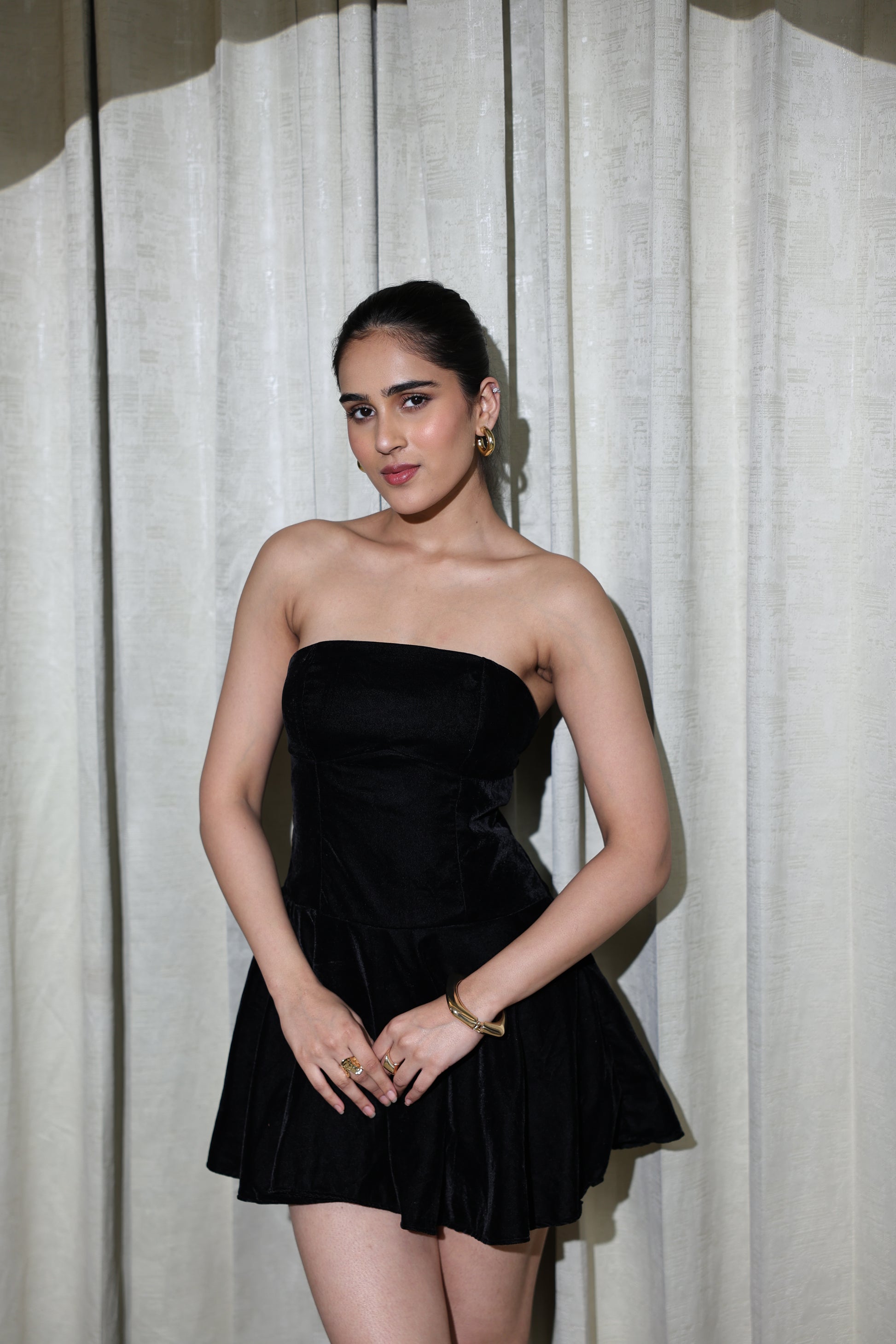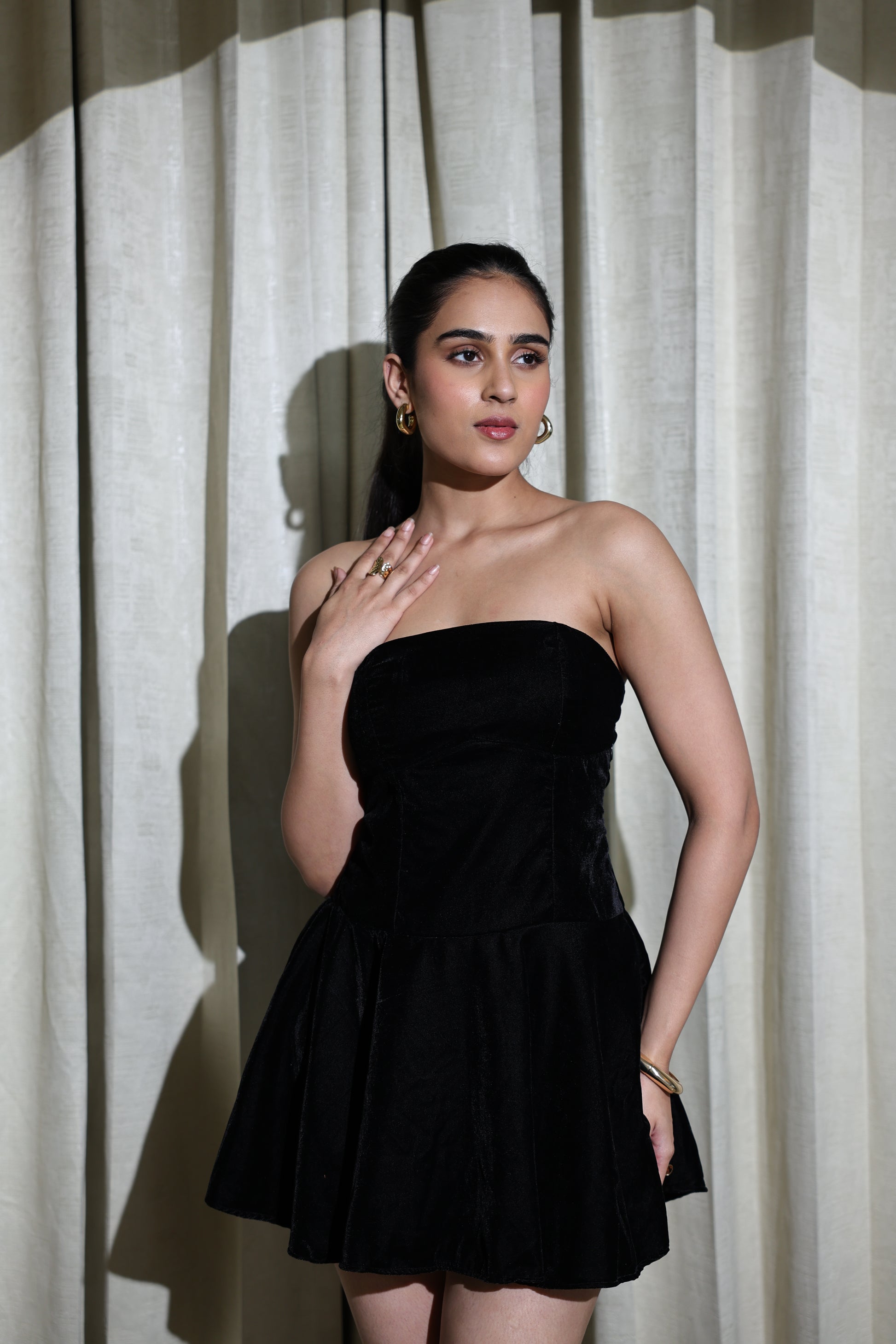Crafted in luxurious black velvet, this mini dress is designed to bring effortless drama and nighttime elegance. The strapless dress features a sculpted, corset-style bodice with a flattering waist and a playful flared mini skirt that adds just the right amount of movement.