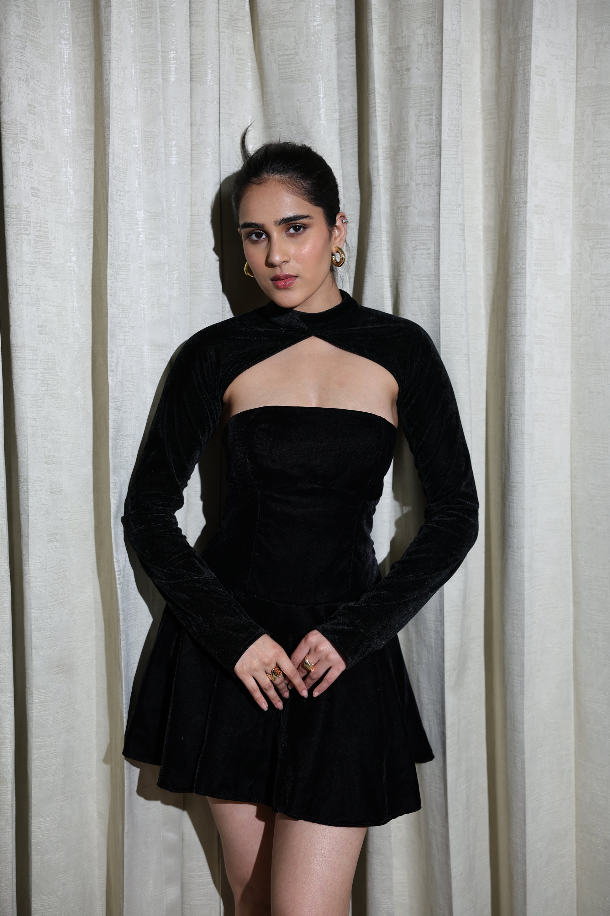 • Shrug: Detachable velvet shrug with asymmetric cut-out neckline & long sleeves